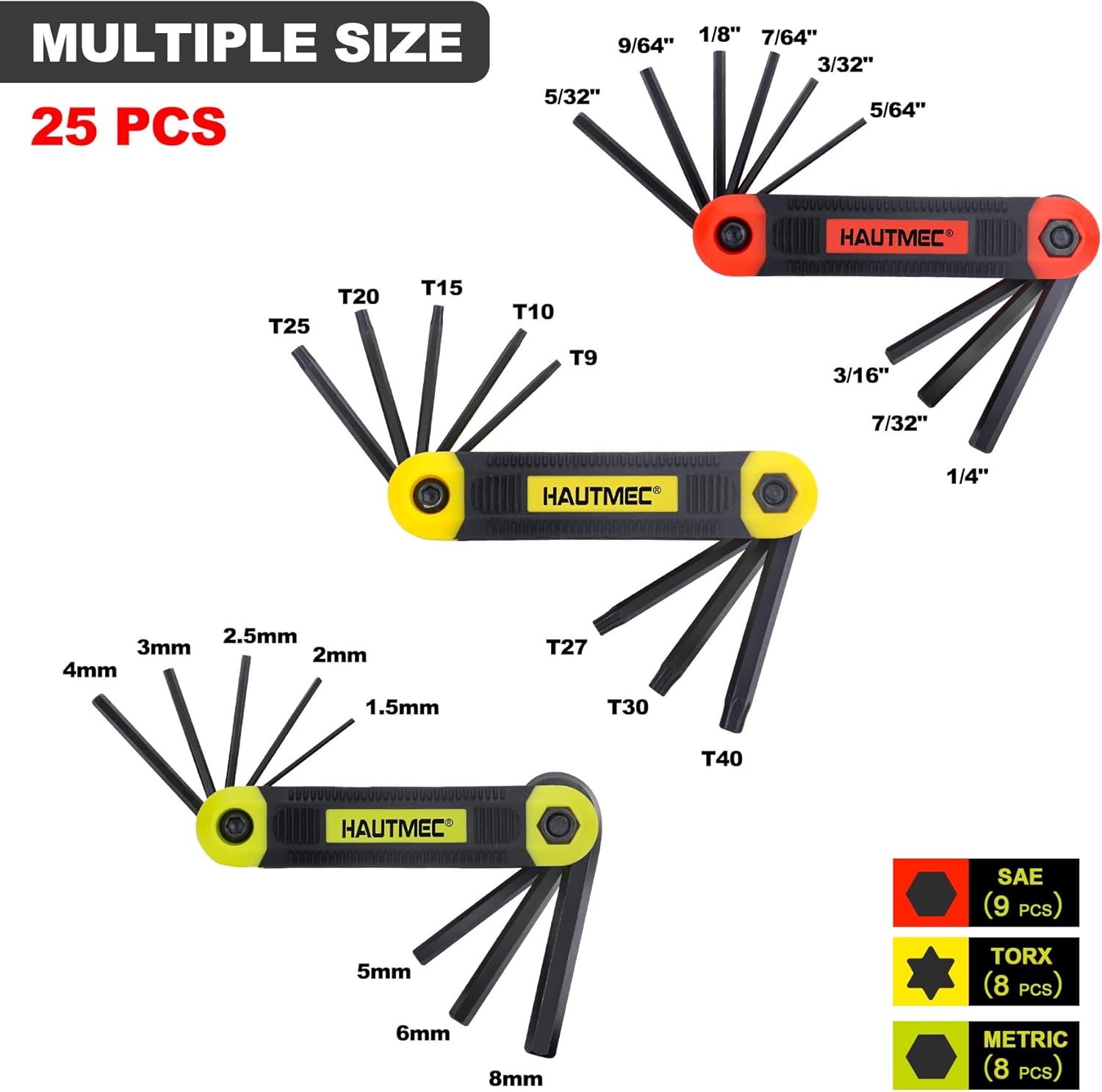 - 61 PCS Multiple Size: The 5-pack allen wrench set comprises 3 pack folding hex key set: a 9-piece SAE set : 5/64", 3/32", 7/64", 1/8", 9/64", 5/32", 3/16", 7/32", 1/4"; an 8-piece METRIC set : 1.5mm, 2mm, 2.5mm, 3mm, 4mm; 5mm, 6mm, 8mm; an 8-piece TORX set : T9, T10, T15, T20, T25, T-27, T30 ,T40. 2 pack of long and short With this kind of range of sizes you will have a hard time finding a job you can't tackle.