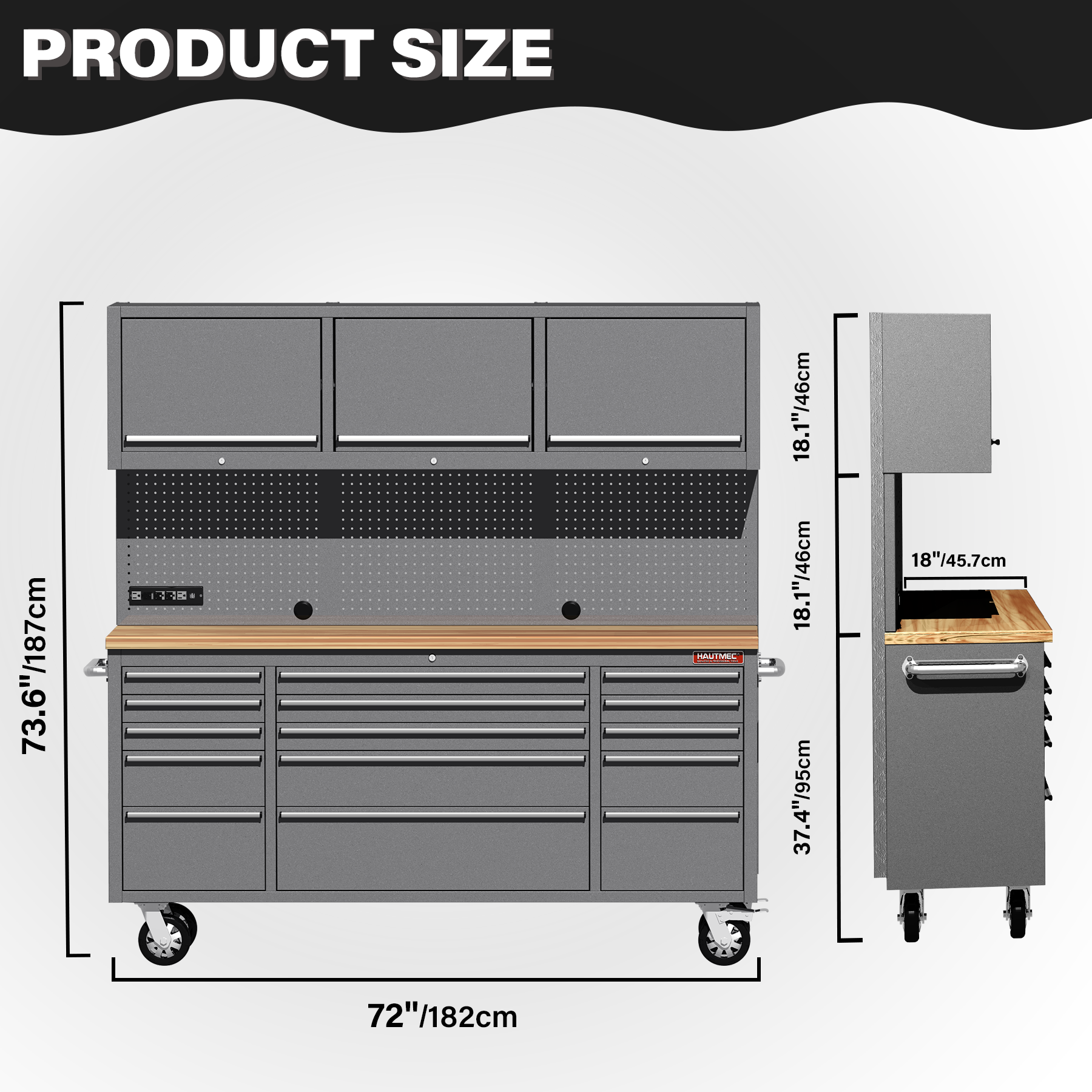 HAUTMEC 72-Inch Mobile Workbench, Rolling Tool Box, Heavy-Duty Stainless Steel Tool Cabinet with 51 Pegboard Hooks,15 Drawers, 3 Upper Cabinets, Pegboard, ETL-Certified Power Strip & Oak Work Surface HT0428