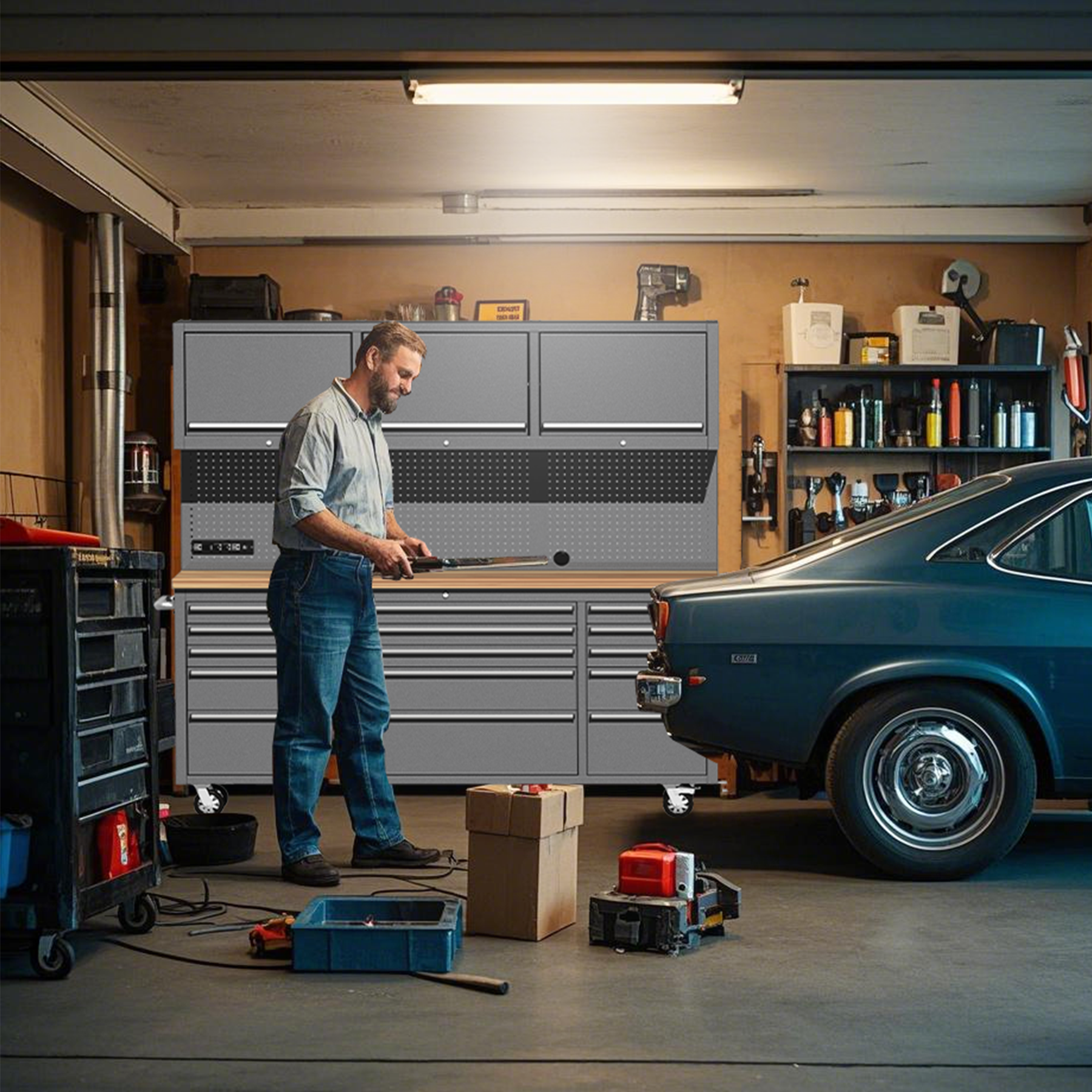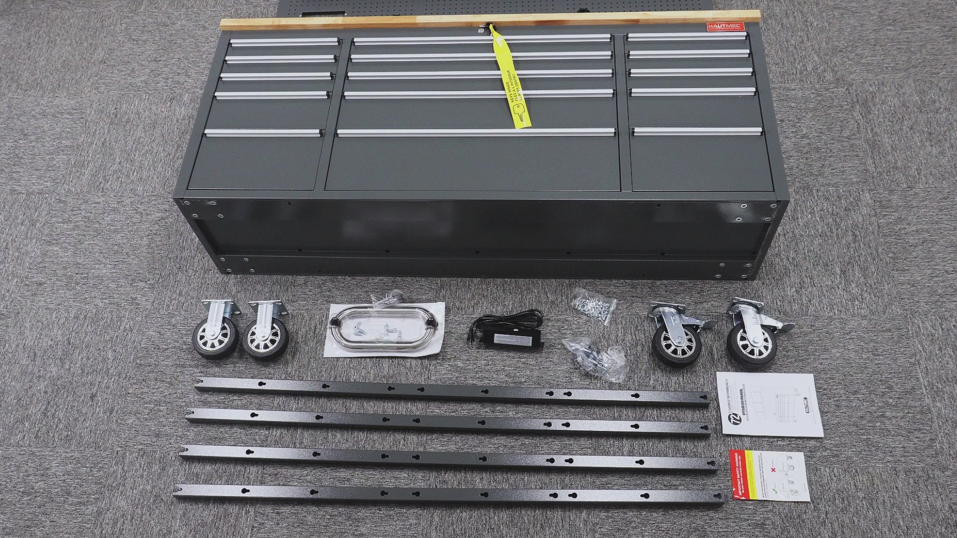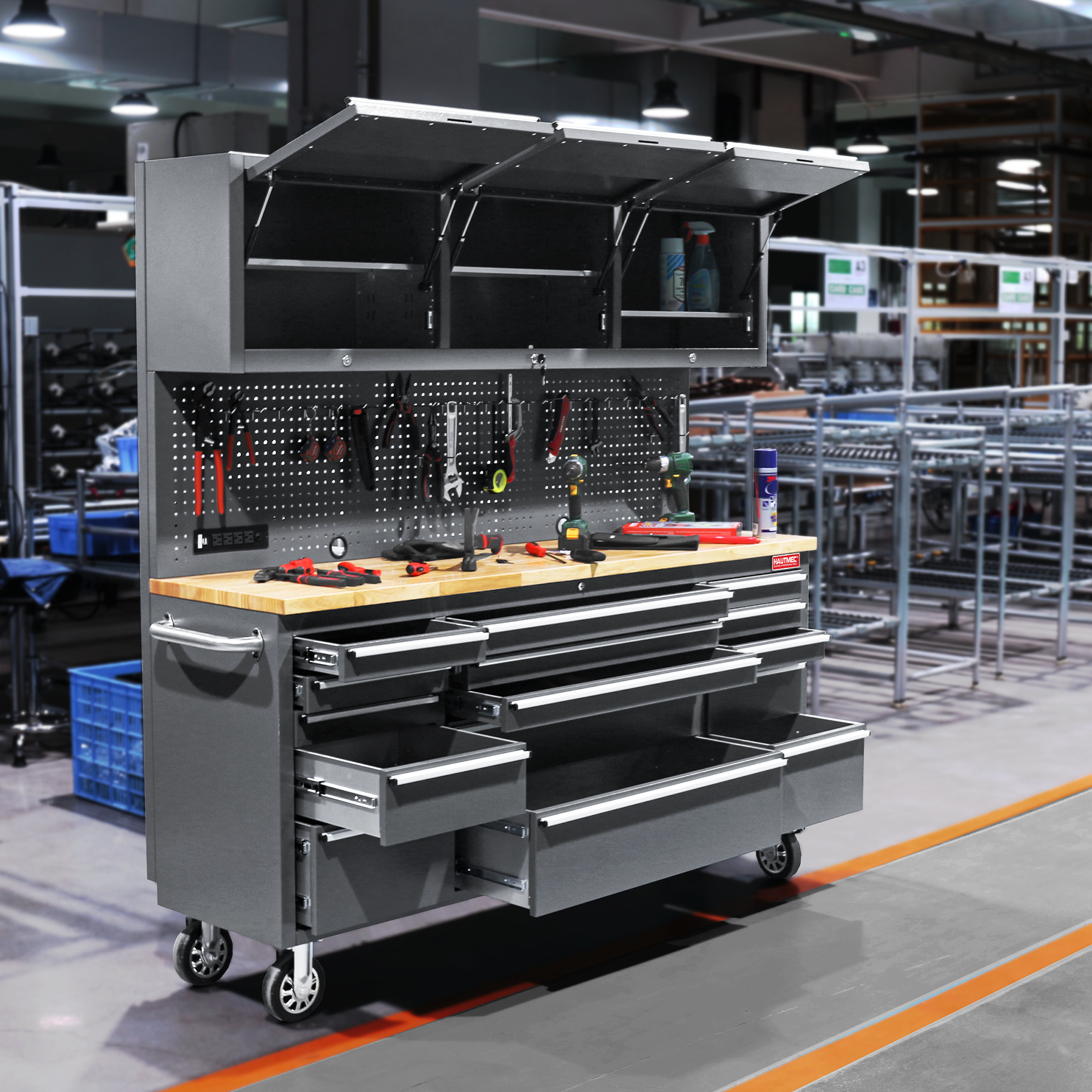 - 【Smooth, Silent Drawer Operation】Each of the 15 drawers features silent guide rails, ensuring smooth and quiet operation. Lined with EVA cotton, these drawers keep your tools securely in place while preventing scratches. The gas support rods in the 3 upper cabinets allow for easy, quiet opening and closing