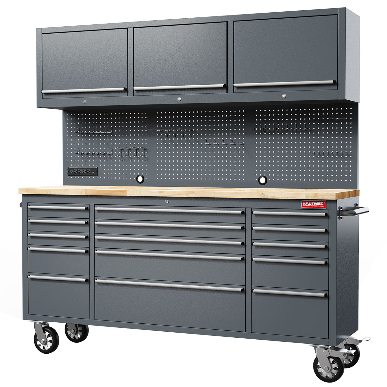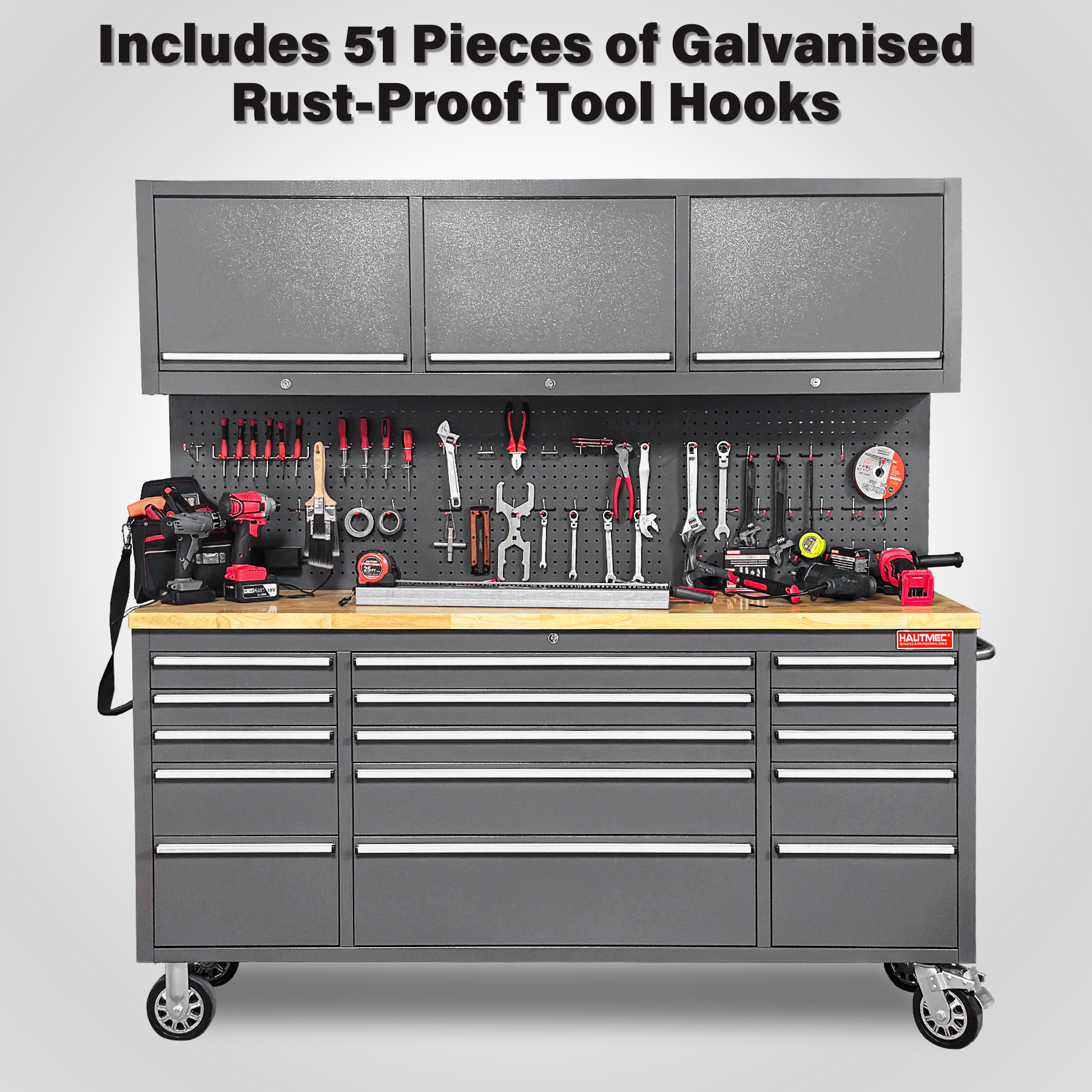 HAUTMEC 72-Inch Rolling Tool Chest with 51 PCS Pegboard Hooks & ETL-Certified Power Strip, Mobile Garage Workbench with 15 Drawers, 3 Upper Cabinets, Pegboard & Heavy-Duty Oak Work Surface HT0428-TC