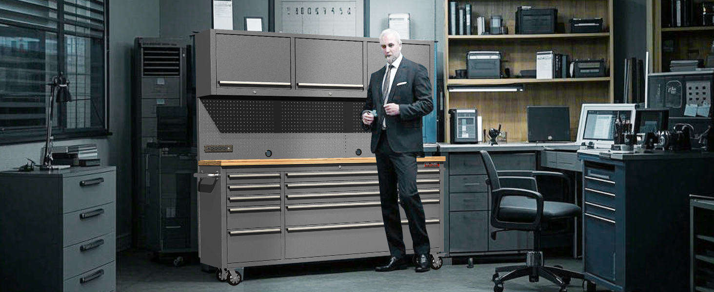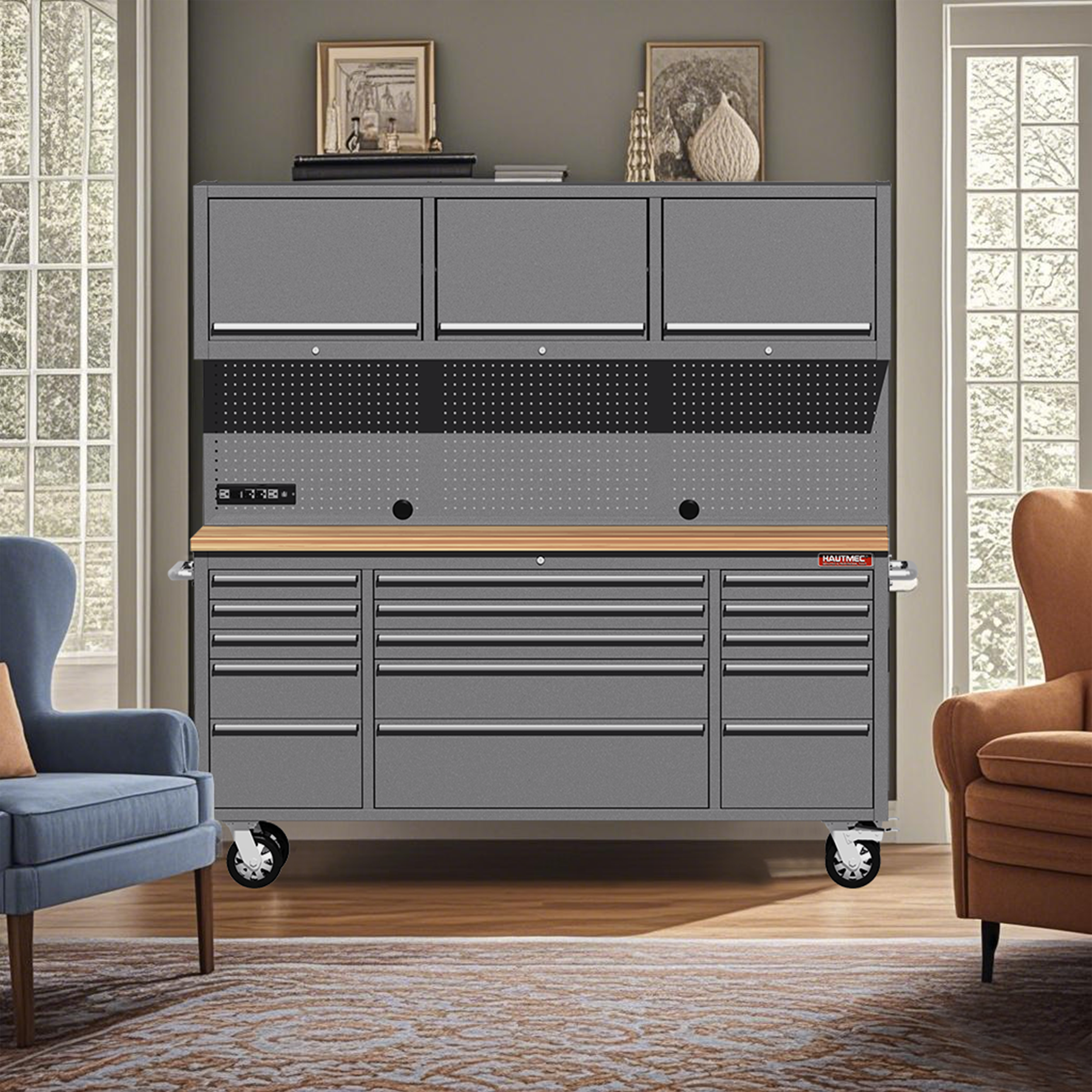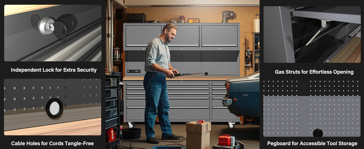 - 【Smooth & Silent Drawer System】Each drawer features premium ball-bearing slides and EVA-lined interiors to reduce noise, prevent scratches, and keep tools in place. Upper cabinets include gas struts for Smooth, controlled opening and closing