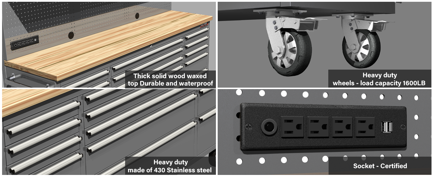 - 【ETL-Certified Power Strip & Convenient Mobility】Equipped with an ETL-certified power strip that features 2 USB ports and 4 outlets, this workbench makes powering your tools and devices easy. Two round holes in the middle of the cabinet allow you to route power cords through to the back, ensuring clean and organized cable management. The 4 heavy-duty casters (2 with locks) allow for easy mobility, and the 4 lockable cabinets keep your tools safe and secure