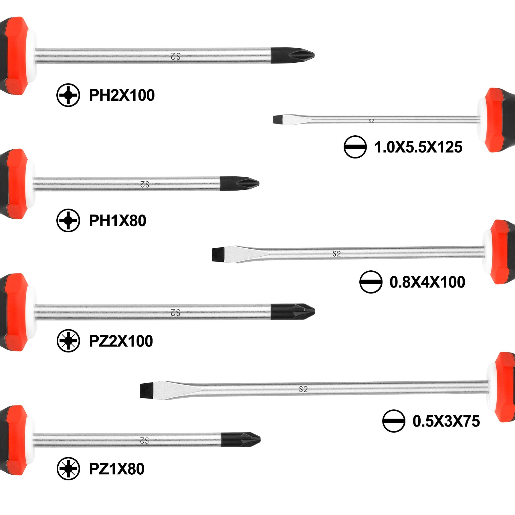 - Includes 7 common size screwdrivers for professional and DIY etc wide use : 2 Phillips screwdrivers(80mm/100mm), 2pcs Pozidrov screwdrivers(80mm/100mm) and 3pcs flathead screwdrivers(3*75mm/4*100mm/5.5*125mm)