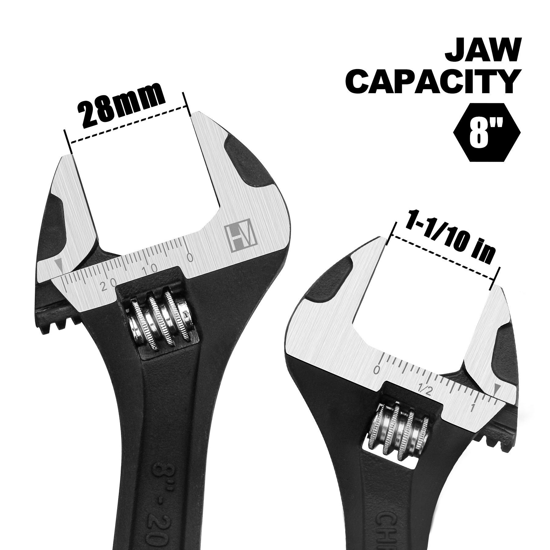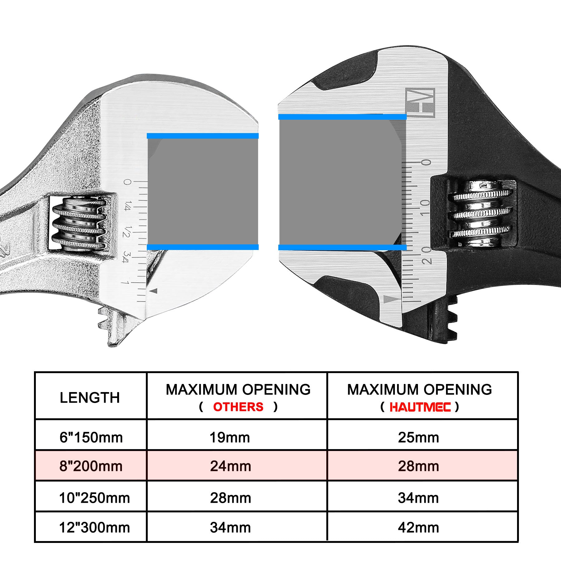 HAUTMEC 8 inch Adjustable Wrench Extra Wide Jaw Black Finish Adjustable Wrenches Drop-Forged CR-V Steel Metric & SAE Scales for Home Garage Workshop DIY, HT0373