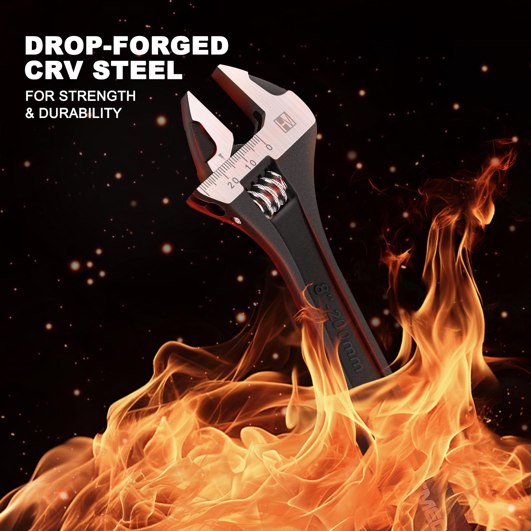 - Durability& Longevity: The materials of wrench determines their durability. Small adjustable wrench is made of premium Chrome Vanadium Steel with heat-treatment and drop-forged construction for durability and toughness. Corrosion-resistant black oxide finish prolongs its life.