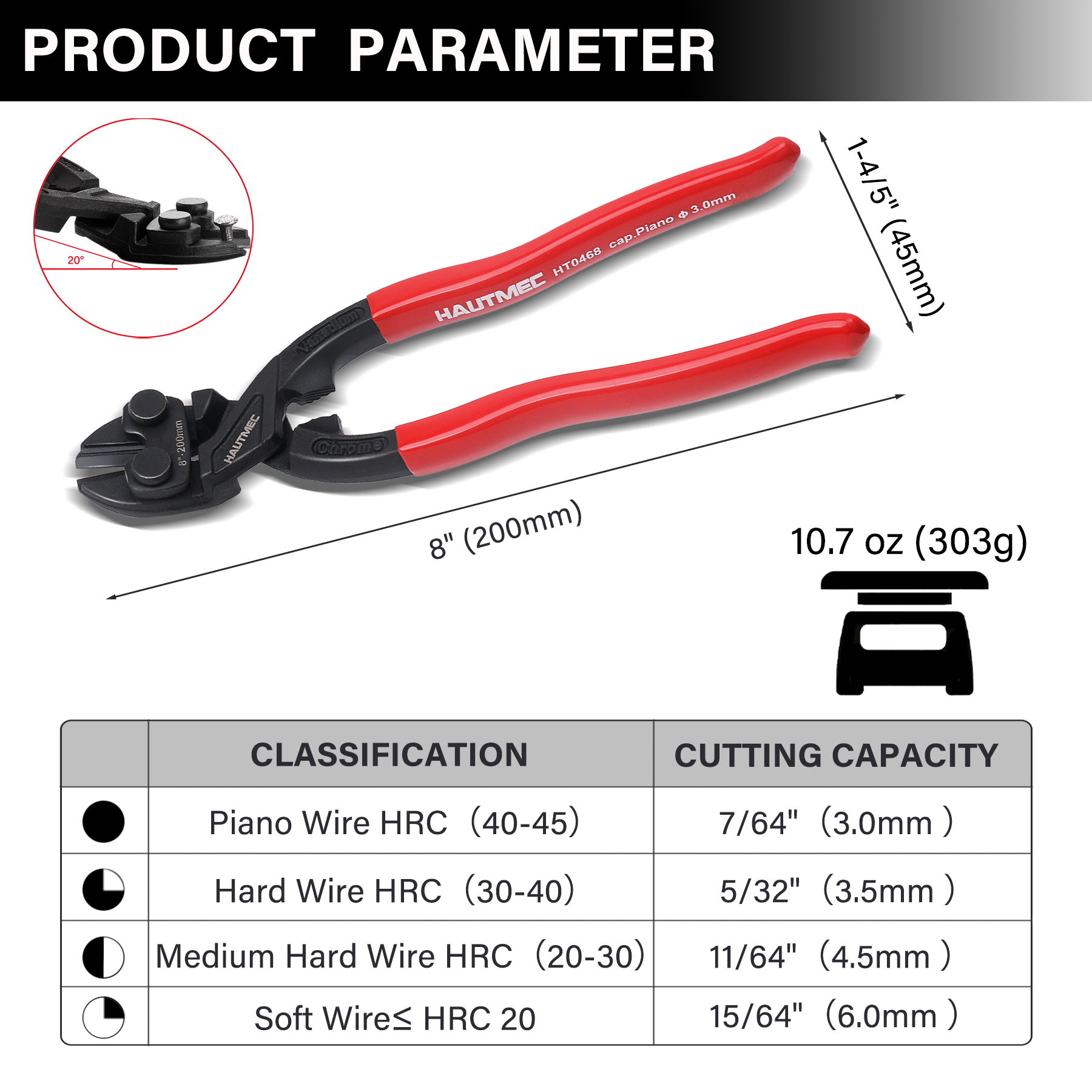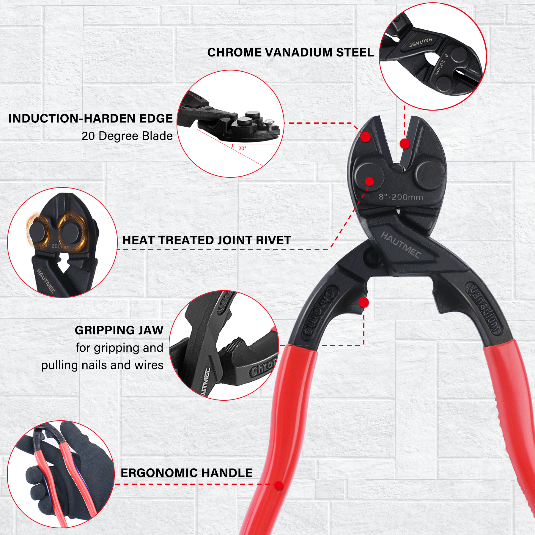 HAUTMEC 8 Inch Mini Bolt Cutters, High Leverage Diagonal Plier with 20° Angled Head, CRV Steel Nail Puller Pliers Tool for Pulling or Cutting Nails, Small Bolts and Wires, HT0468