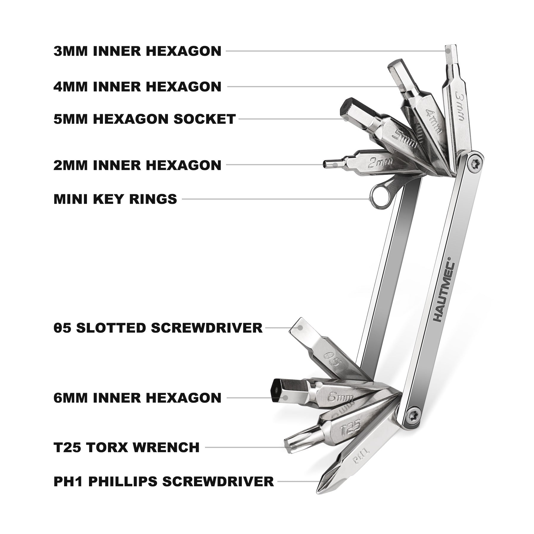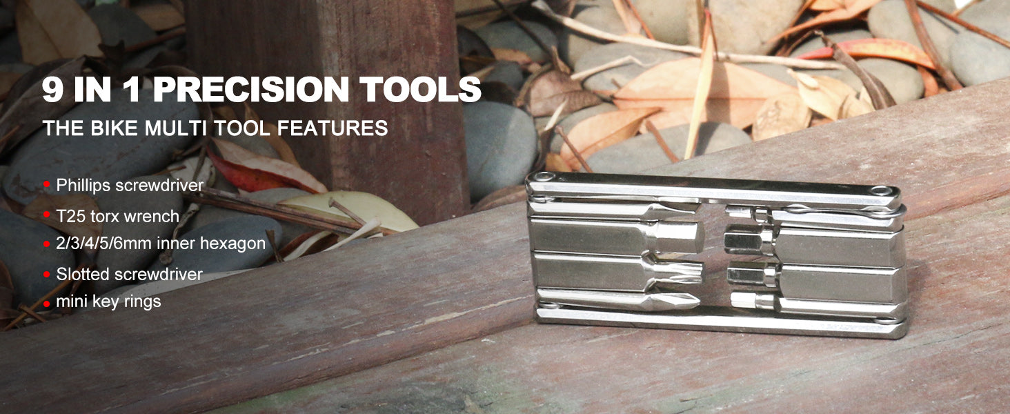 - 【9 in 1 PRECISION TOOLS】The bike multi tool features 2/3/4/6mm inner hexagon, phillips screwdriver, T25 torx wrench, slotted screwdriver, 5mm hexagon socket and a mini key rings, suitable for a wide range of needs.