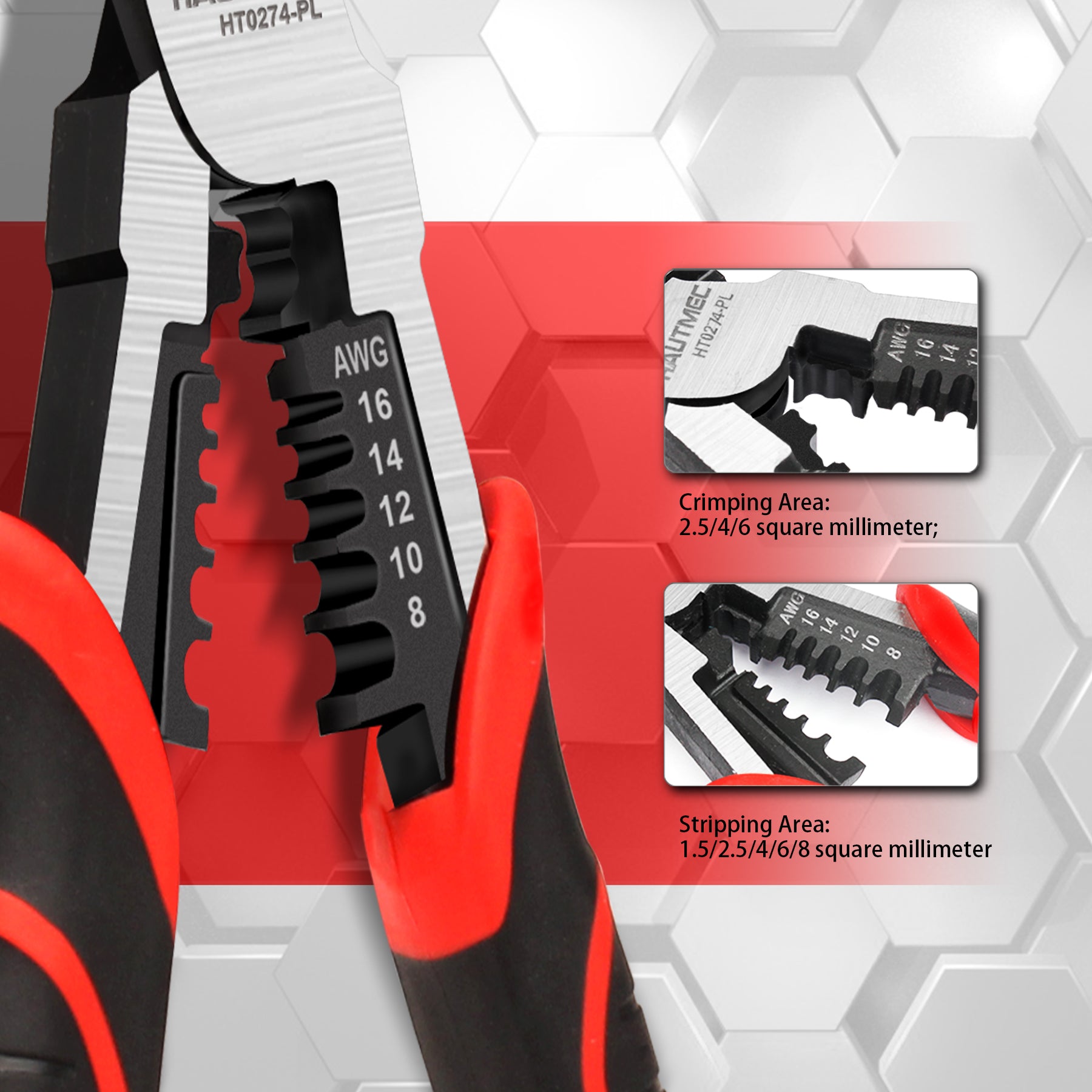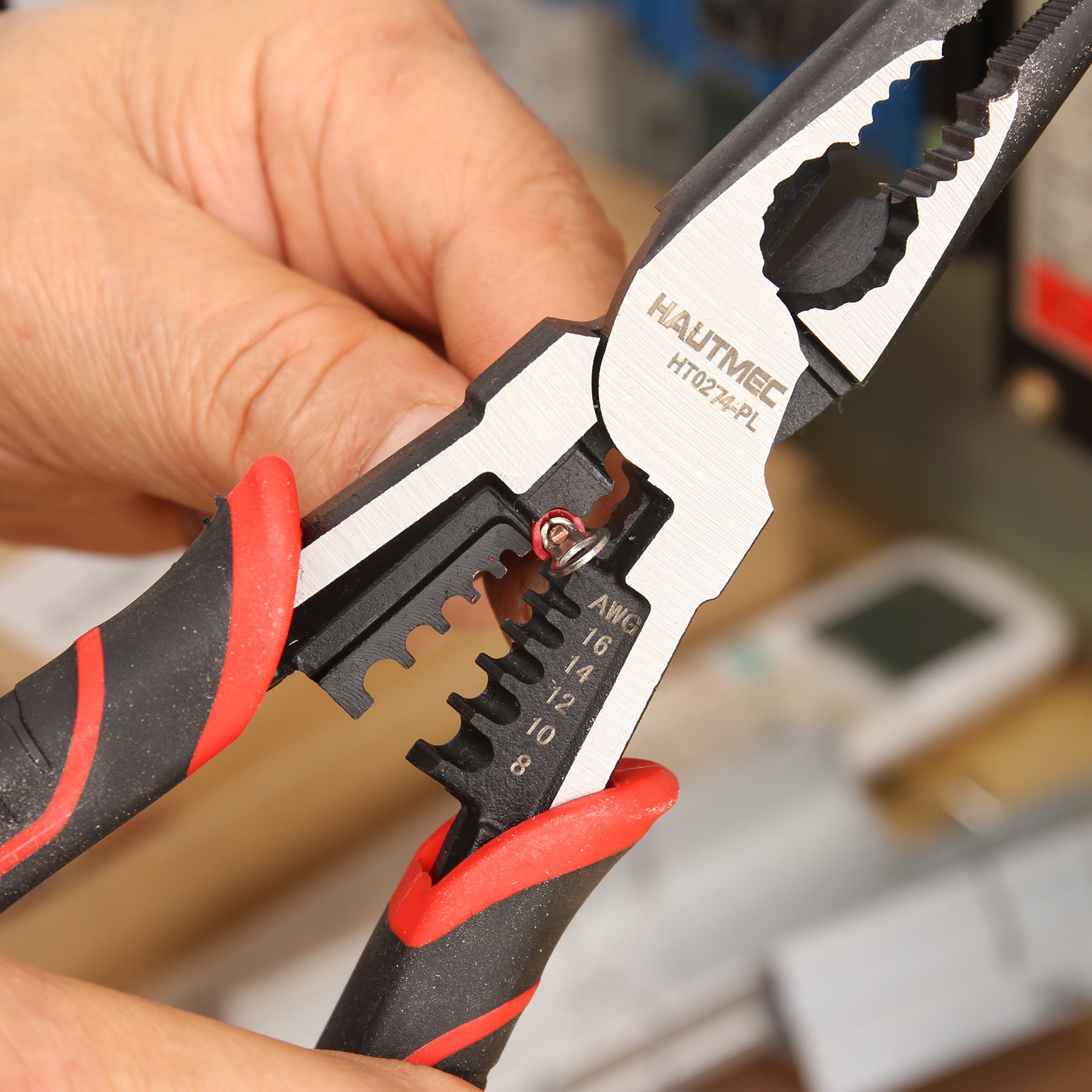 - Professional multifunction linesman pliers with wire cutters,wire stripping and terminal crimping,crimping area:2.5/4/6 square millimeter;stripping area:1.5/2.5/4/6/8 square millimeter