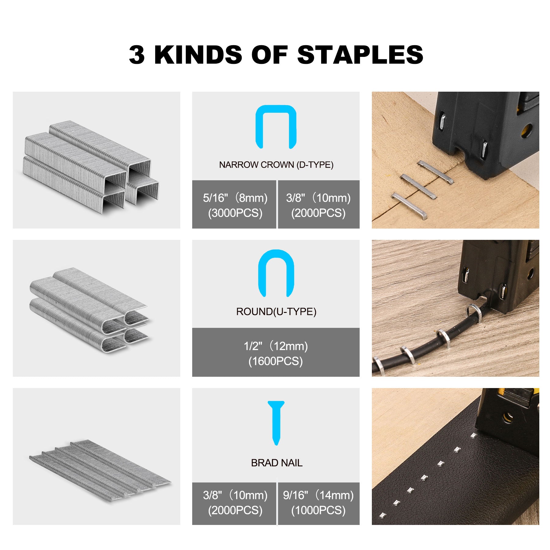 - 【Versatile 9600-Piece Set】Includes 5000 narrow crown (5/16" D-Type 3000 Pcs, 3/8" D-Type 2000 Pcs ), 1600 round (1/2" U-Type), and 3000 brad nails (9/16" T-Type 1000 Pcs, 3/8" T-Type 2000 Pcs) to suit a wide range of applications from upholstery and carpentry to packing and roofing.