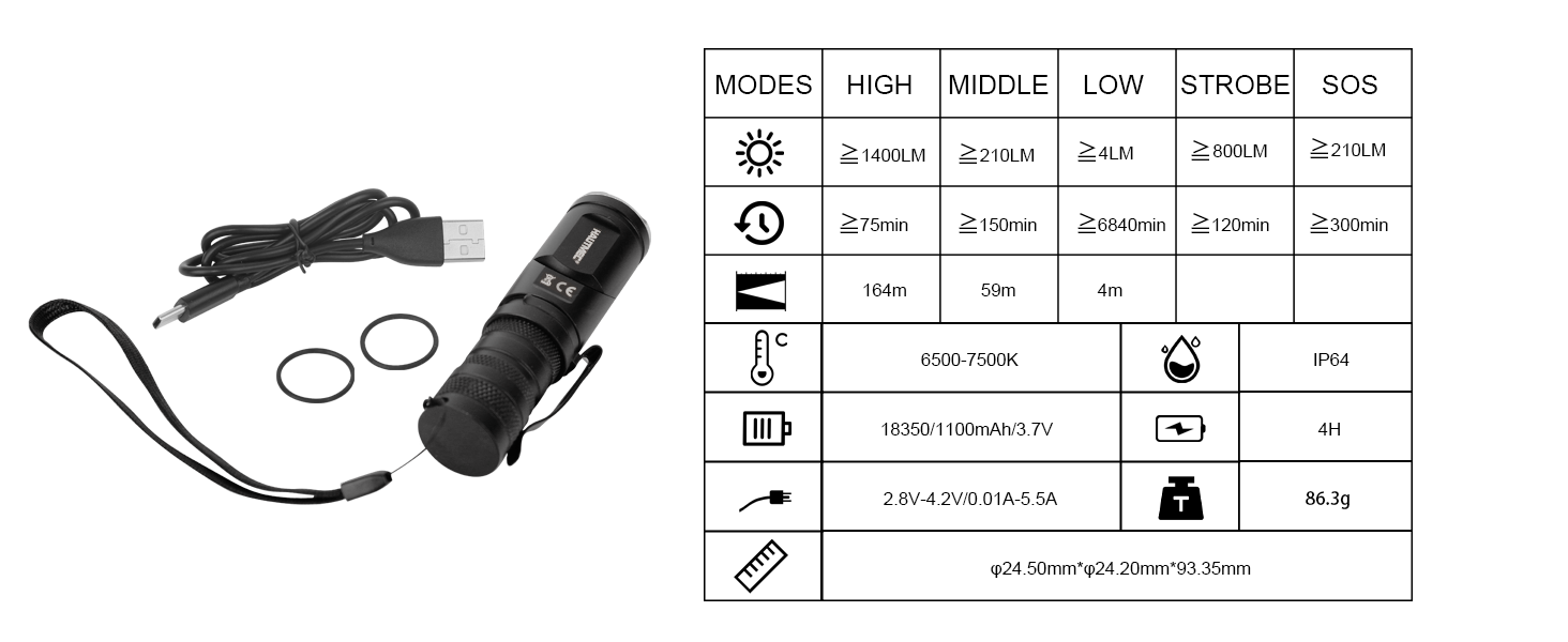 - Versatile LED light: Rechargeable flashlight transitions 5 light modes, including the 1,400 lumen High Mode,middle(210LM), low(4LM), strobe(800LM), SOS(210LM), multifunctional in a variety of environments.