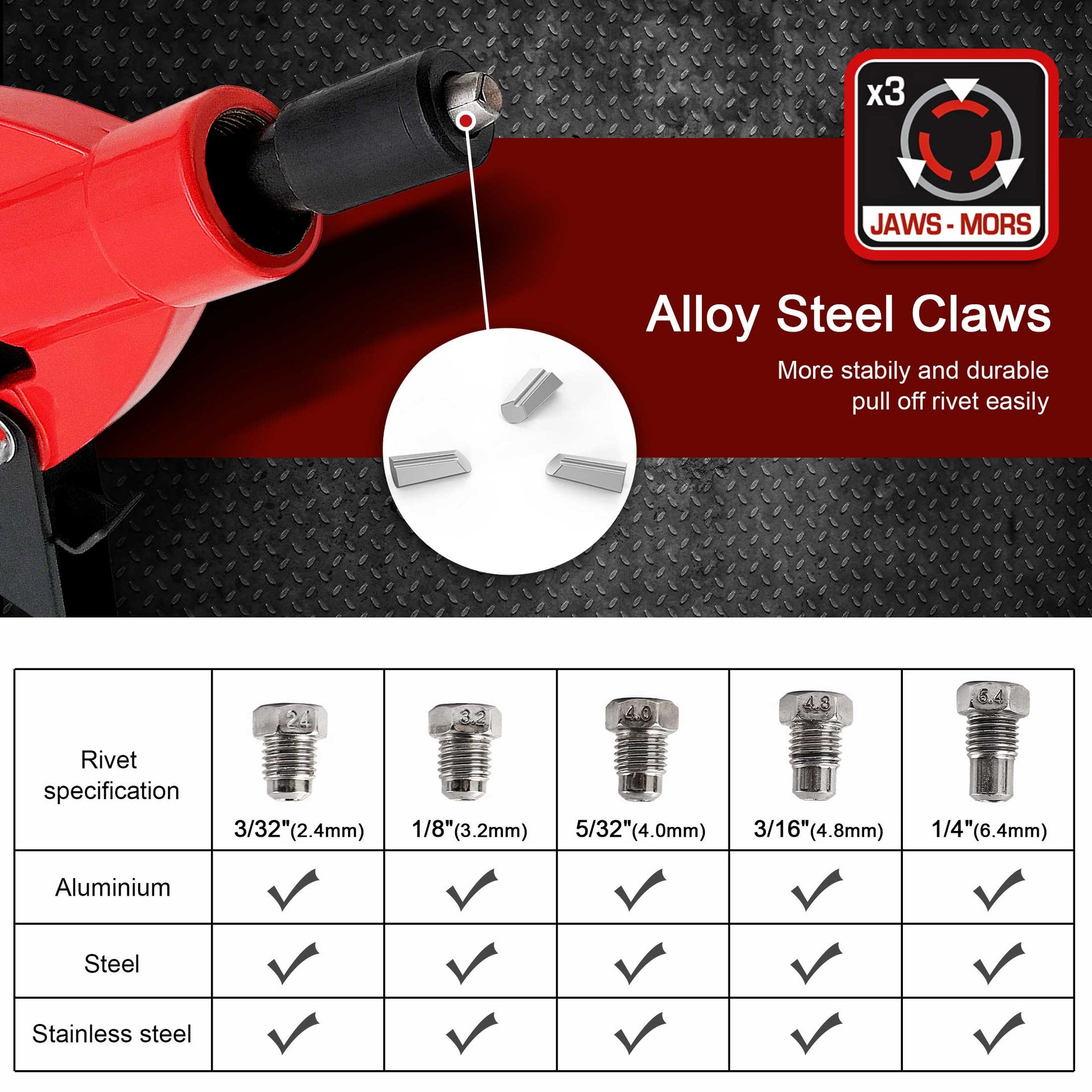 - 5 Replaceable Nosepieces:Our rivet gun with portable wrench can easily quick change among 5 sizes nozzles 3/32"(2.4mm), 1/8"(3.2mm), 5/32"(4mm), 3/16"(4.8mm) and 1/4-Inch (6.4mm).Suitable for aluminium, stainless steel or steel blind rivets