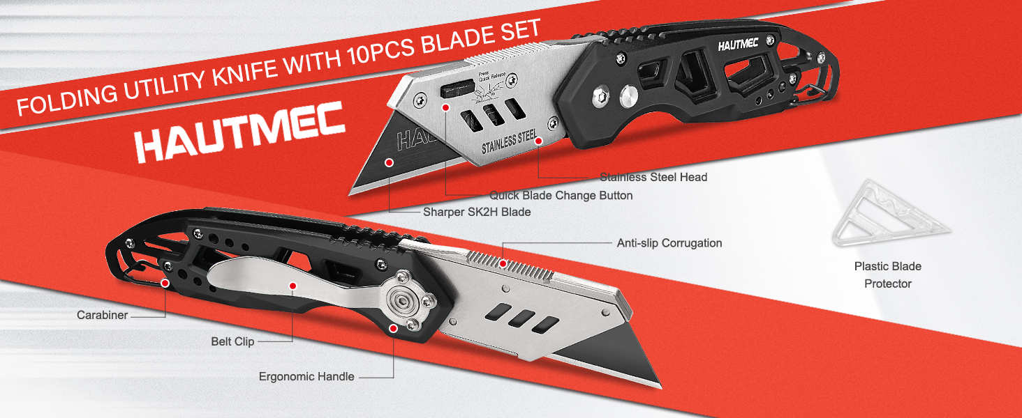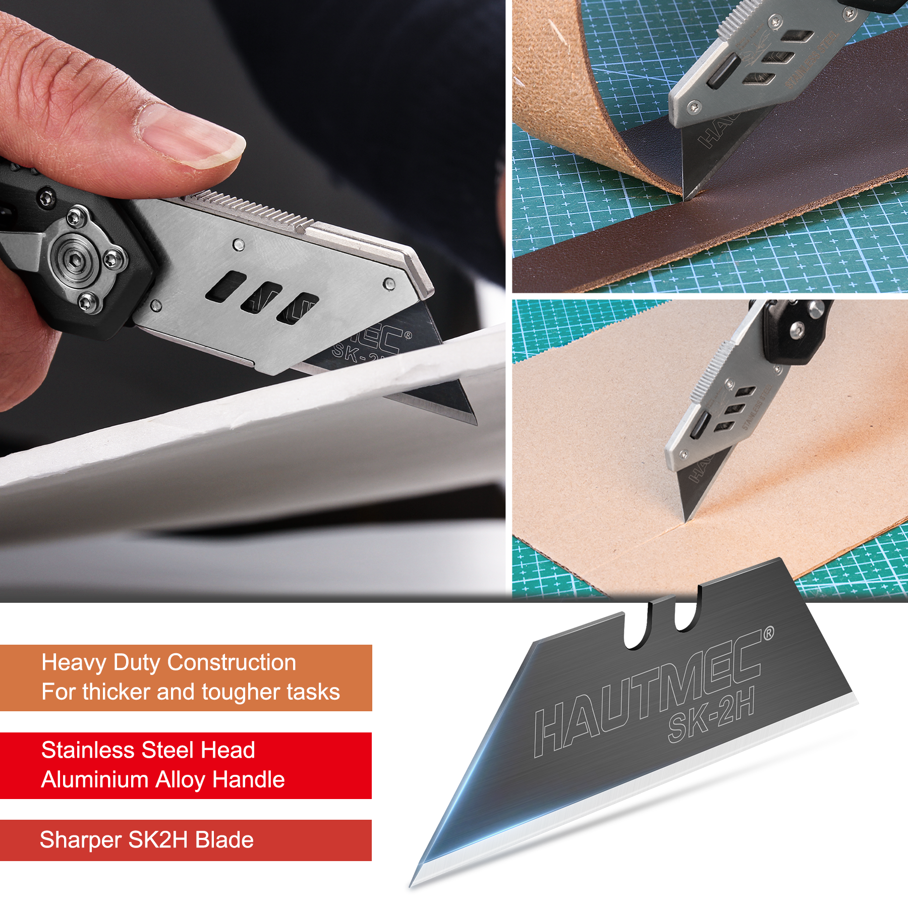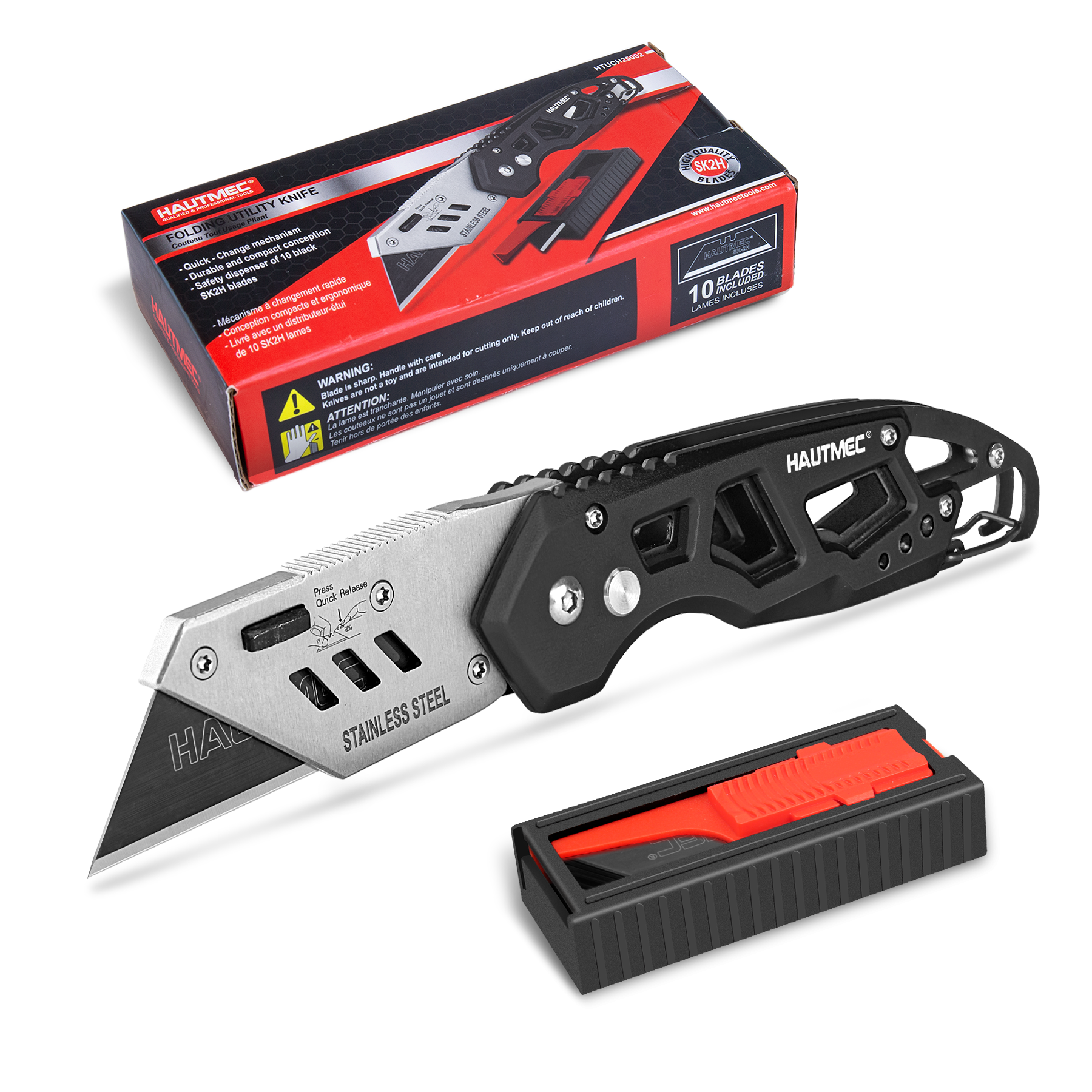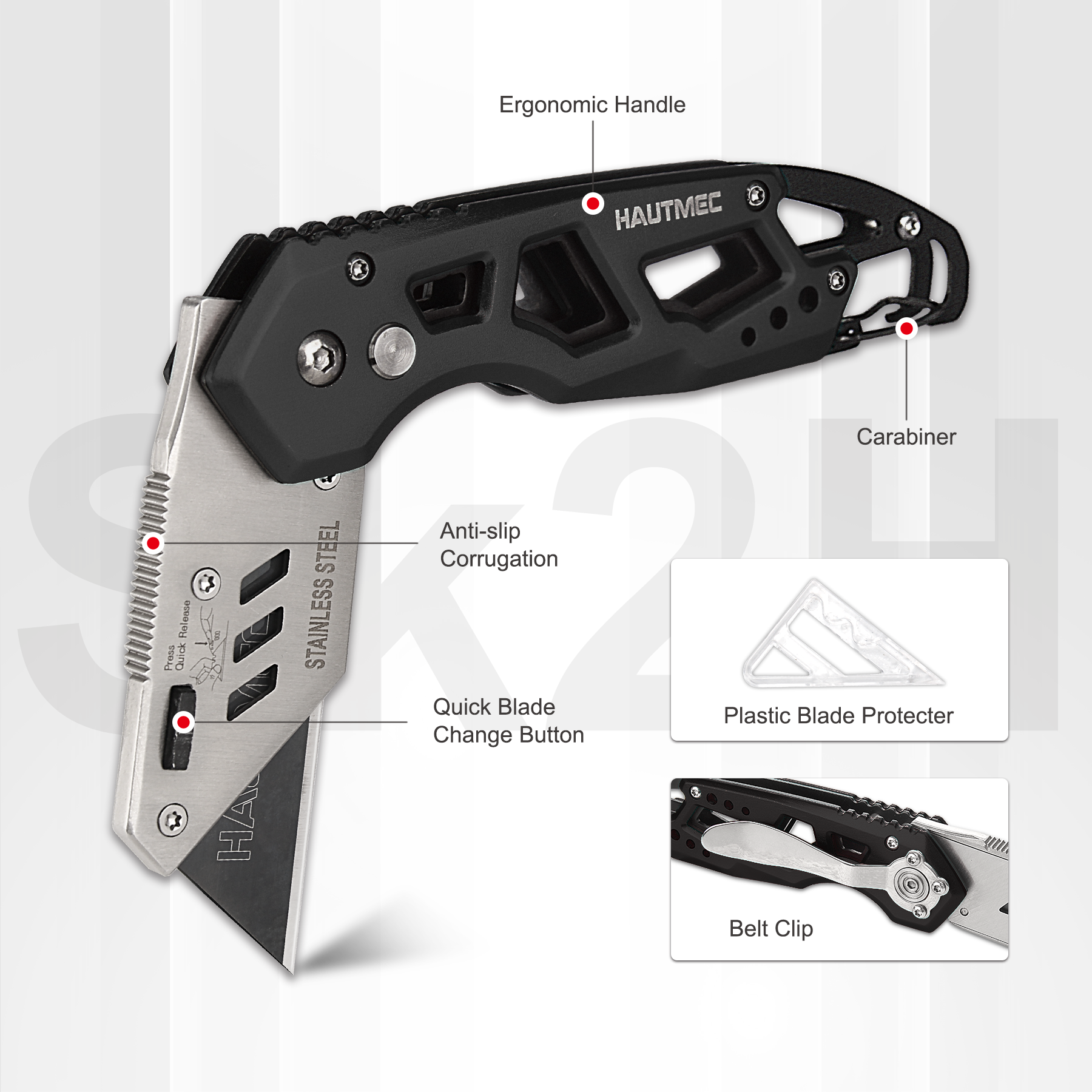 HAUTMEC Folding Utility Knife with 10-Pack SK2H Blades, Heavy-Duty Aluminum Alloy Box Cutter with Belt Clip, Carabiner, Quick-Change Blades & Safety Lock – HTUCH25002