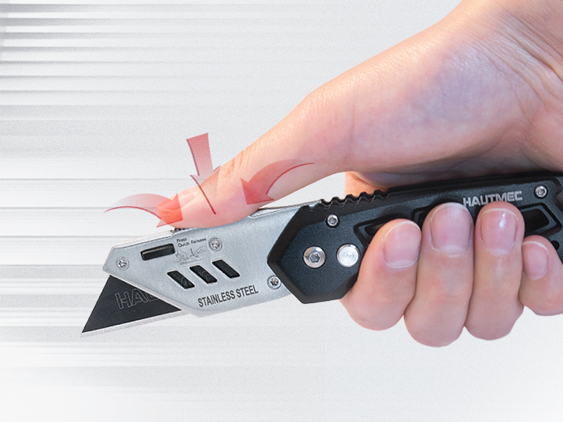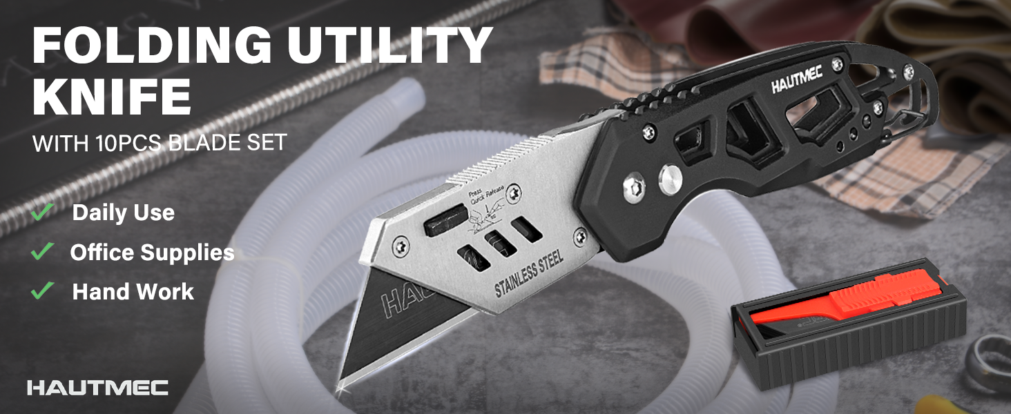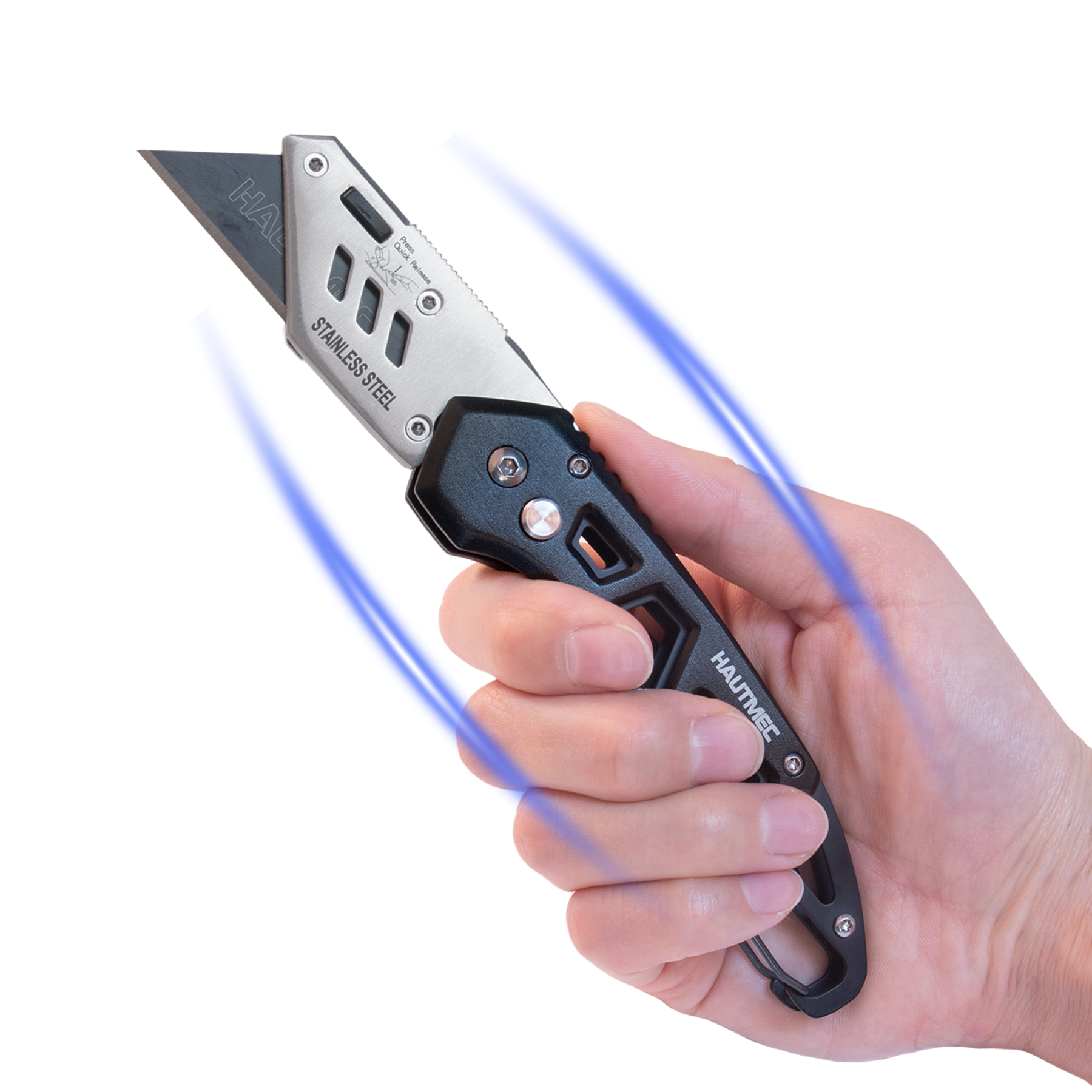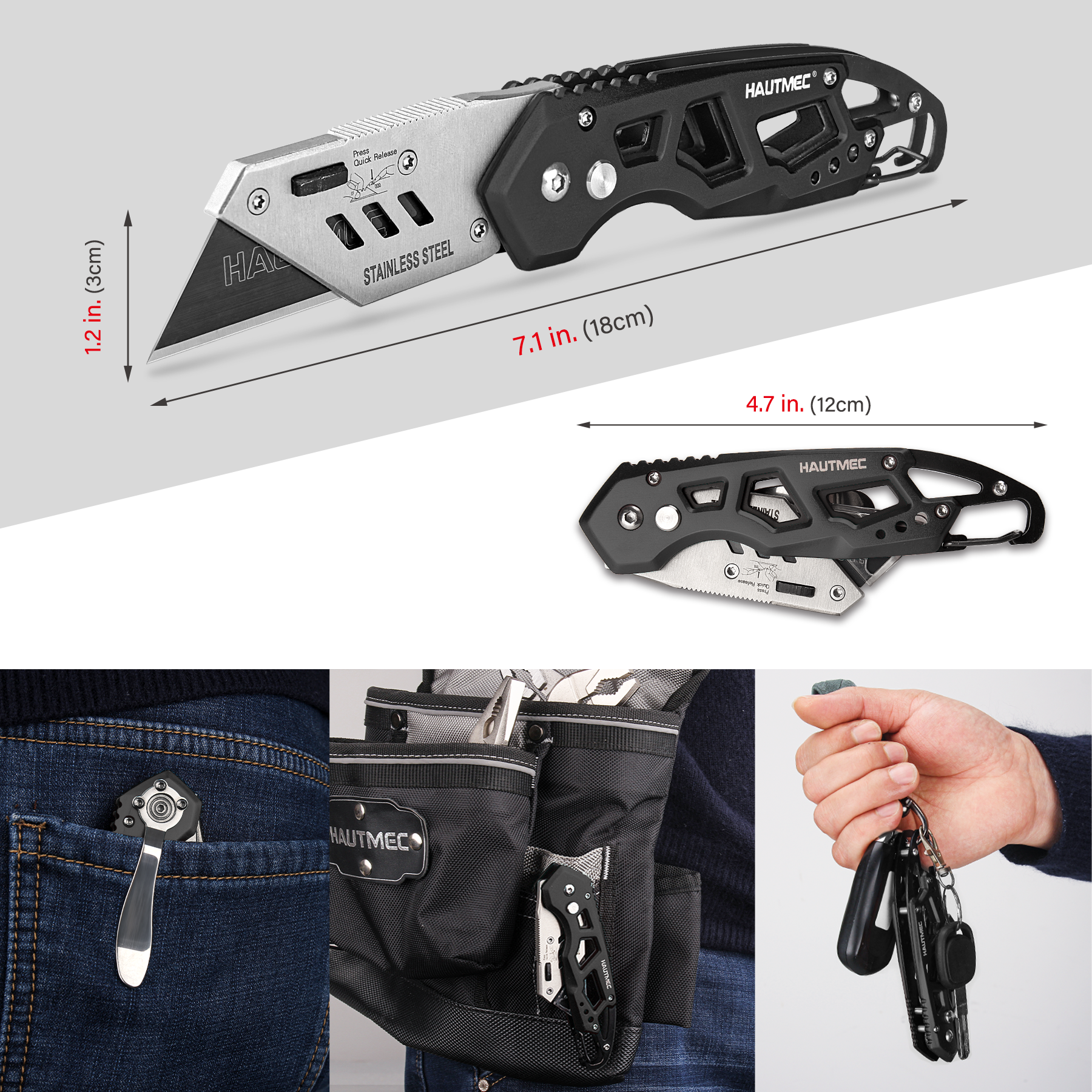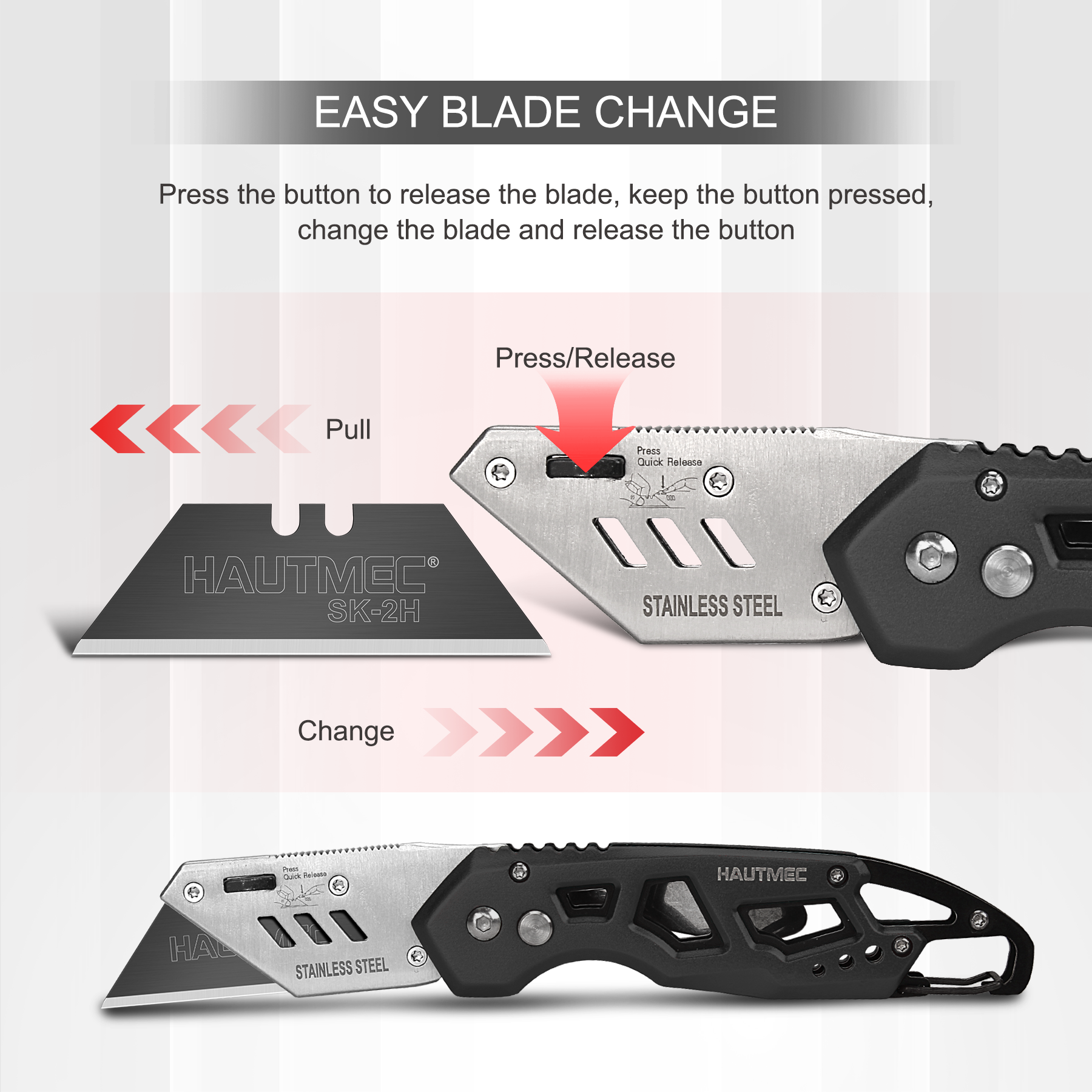 HAUTMEC Folding Utility Knife with 10-Pack SK2H Blades, Heavy-Duty Aluminum Alloy Box Cutter with Belt Clip, Carabiner, Quick-Change Blades & Safety Lock – HTUCH25002