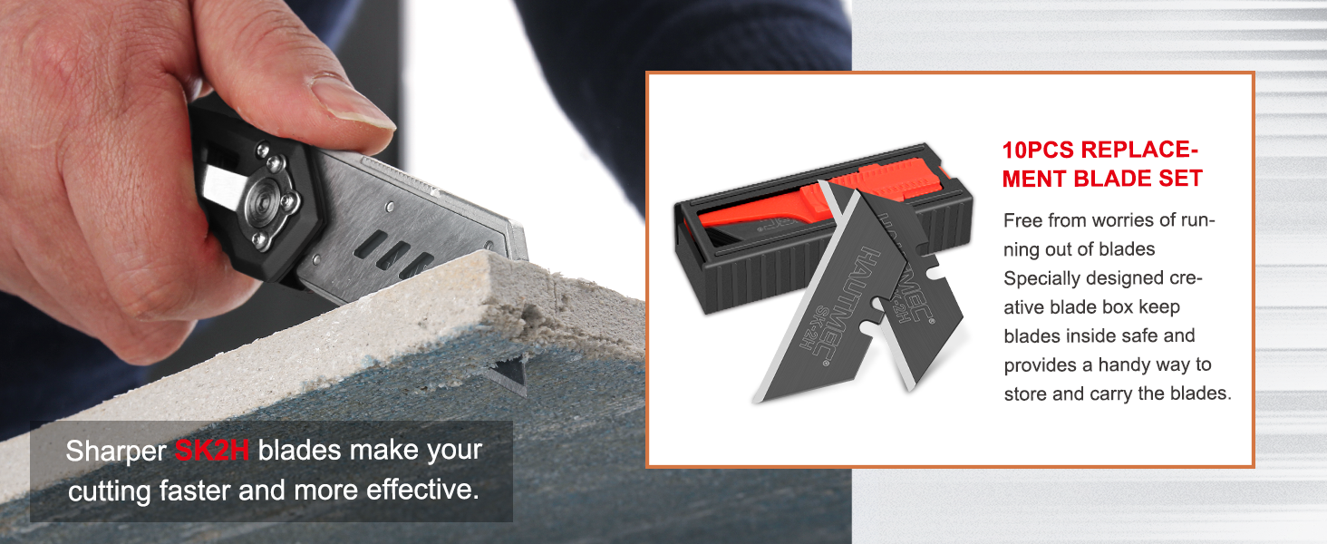 - 【Quick & Easy Blade Change】Swap blades in seconds with the quick-release button—no tools needed. Includes 10 ultra-sharp SK2H blades with anti-rust black coating, housed in a reinforced storage box for protection and easy access