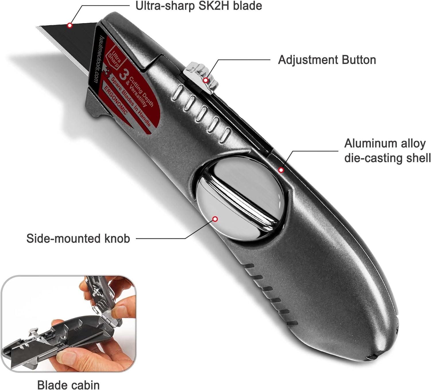 HAUTMEC Heavy-Duty Retractable Utility Knife, one-piece 3 Position Fixed Blade Box Cutter, Aluminum Alloy Shell with 3 extra blades HT0247-KN