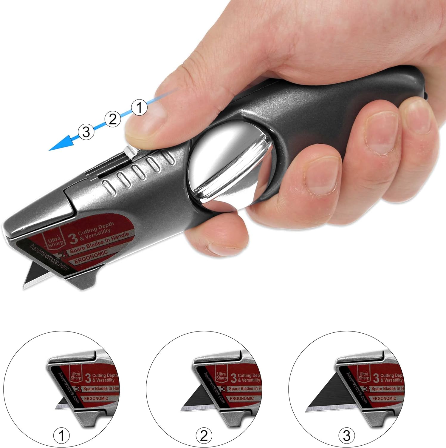 - PRECISE CUTTING - The retractable blade can be switched to 3 different cutting depths for precise cuts and automatically locks after adjustment; high-quality buttons for smooth blade retraction. The blade extends fully for deep cuts or extends only a little for shallow cuts such as opening a box