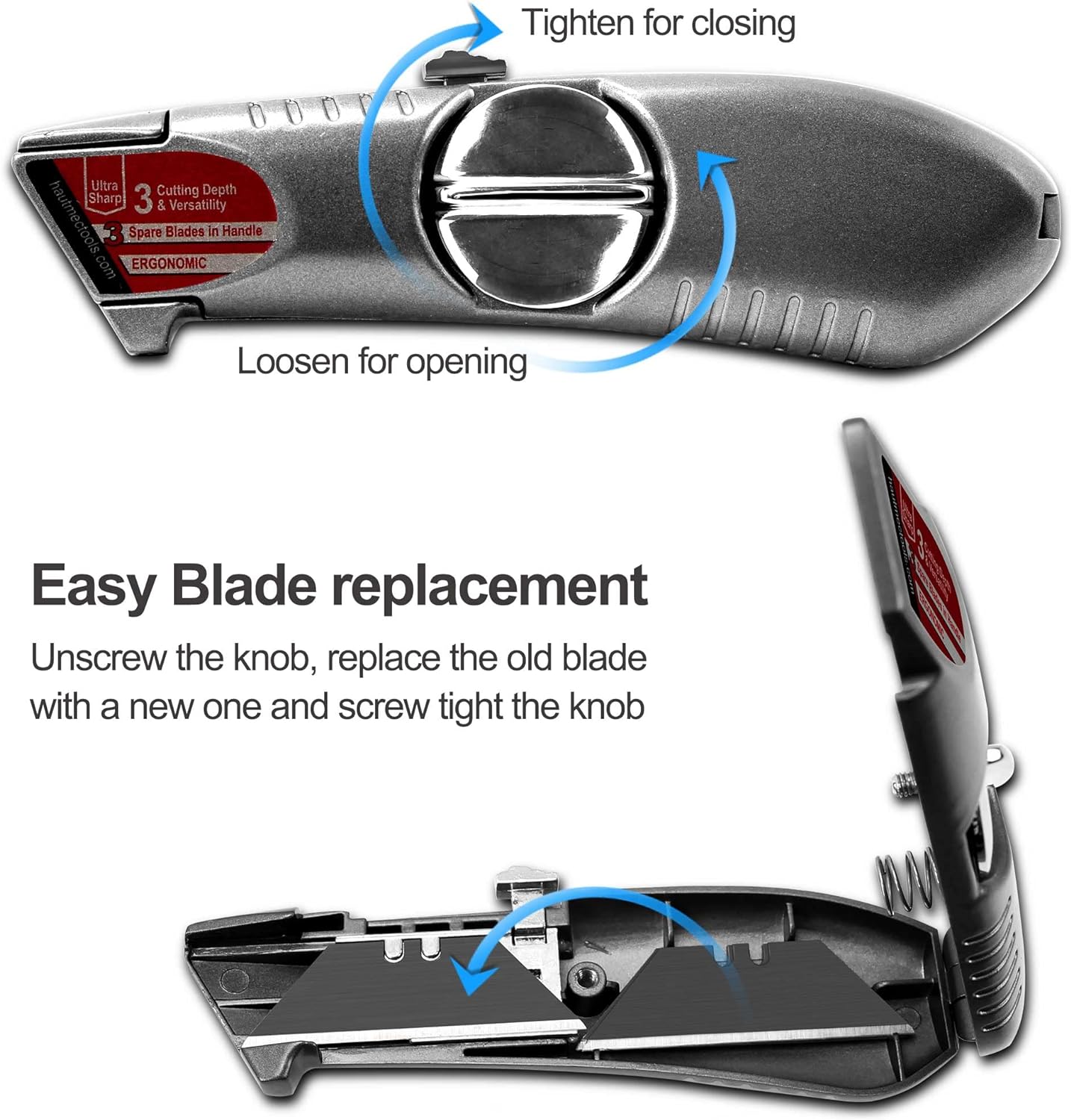 - INNOVATIVE DESIGN - One-piece design makes it nice-looking and easy to be found in your drawer. Advanced side-mounted knob design requires nothing but your hand to change the blades out (4 bladeds included). Loosen the knob to open the utility knife body and the using blade and extra blades are here for replacement