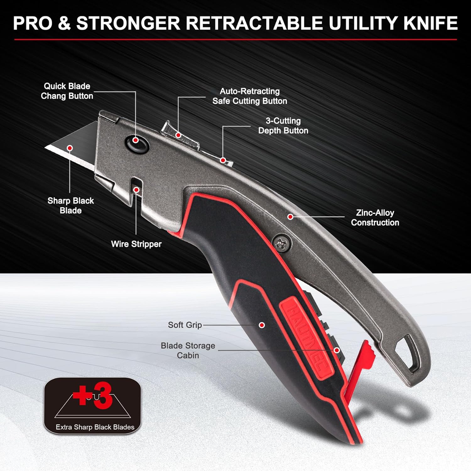 HAUTMEC Heavy Duty Utility Knife With Dual Cutting Mechanism: Safety Auto-Retracting Cutting + Precision 3 Position Depth Tough Cutting, Professional Box Cutter With 3 Black Sk4 Blades, HT0311