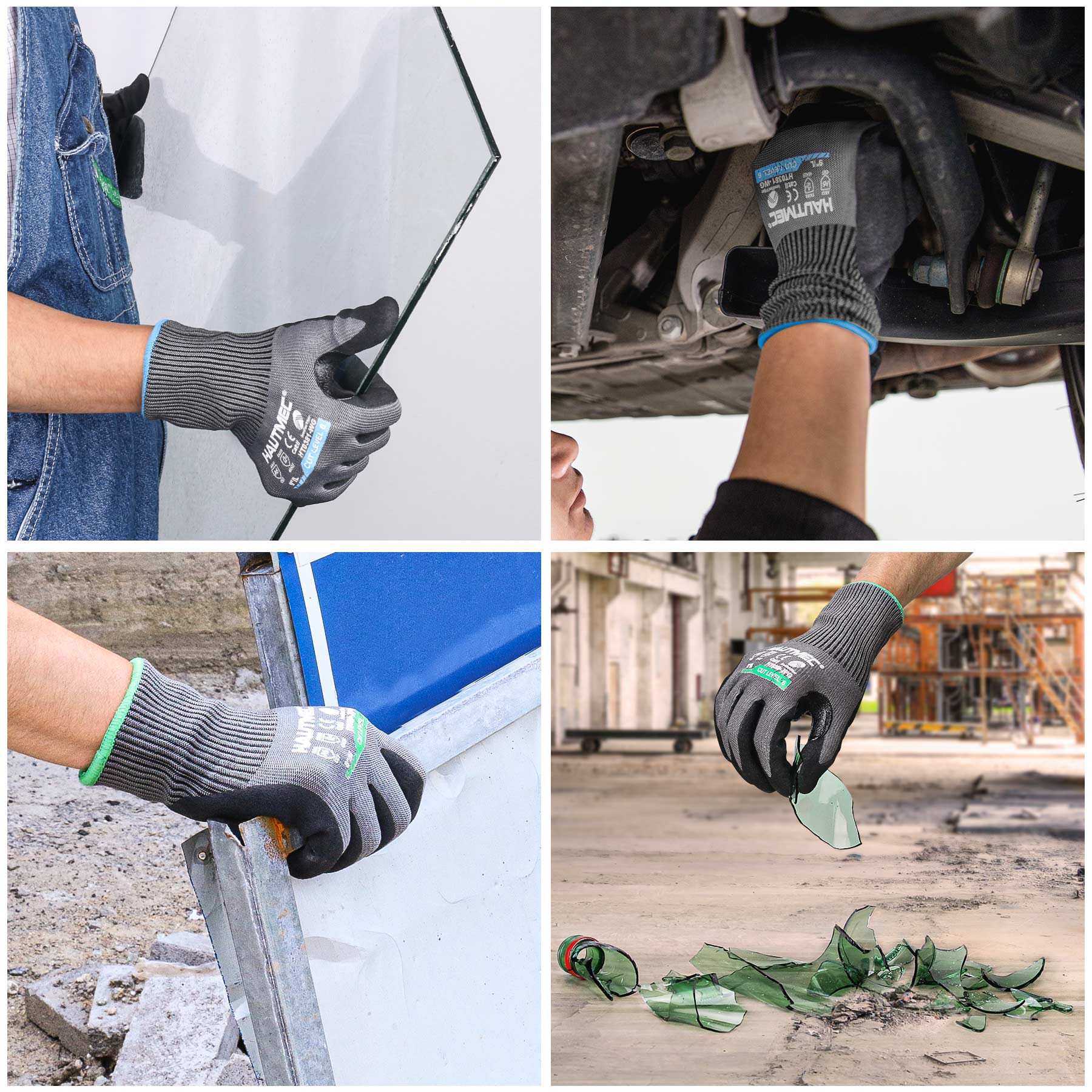 - The safety gloves for men feature 13-gauge HPPE knit outer shell for breathability and cut resistance , nitrile coating and dip for gripping efficiency and effectively resisting abrasion, cuts and punctures.