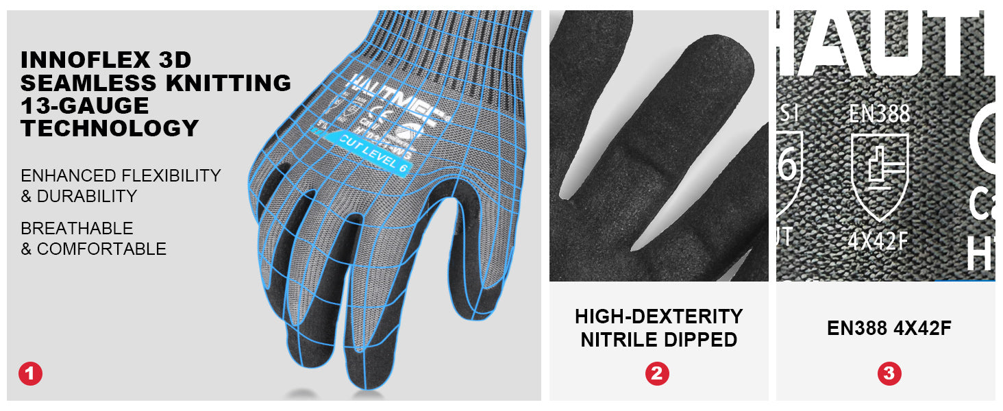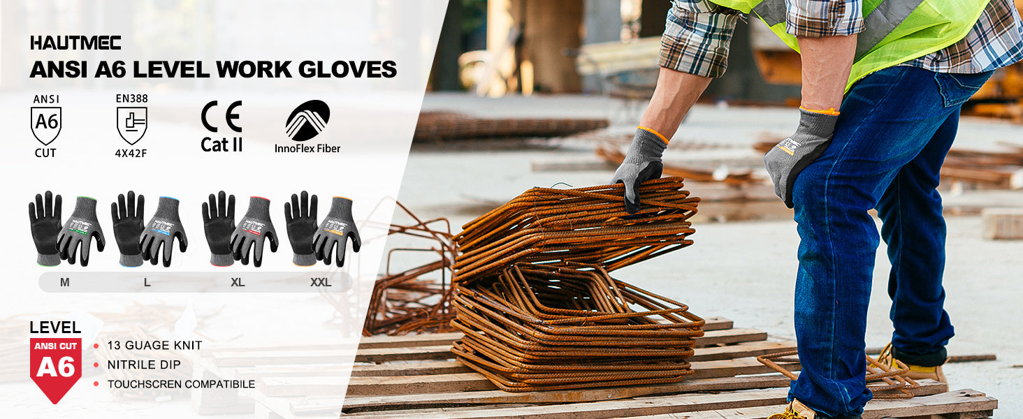 HAUTMEC ANSI A6 Cut Resistant Work Gloves, EN 388 4X42F Cutting Proof Gloves for Men, InnoFlex 13-Gauge Knit Nitrile Dipped, Touchscreen, Breathable for Construction/Machinery/Glass/Garden(M) HT0380