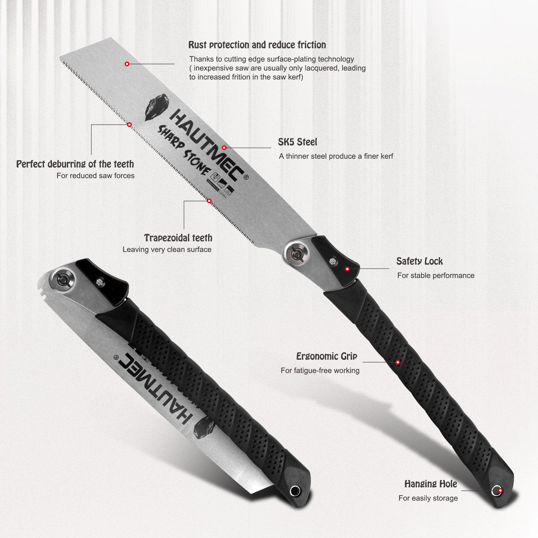 HAUTMEC Folding Japanese Pull Saw, 9-Inch Hand Wood Saw with SK5 Blade, 17TPI Sharp Trapezoid Teeth, Dual Cutting Angle, Pro Handsaw for Fine & Fast Cuts – HT0312