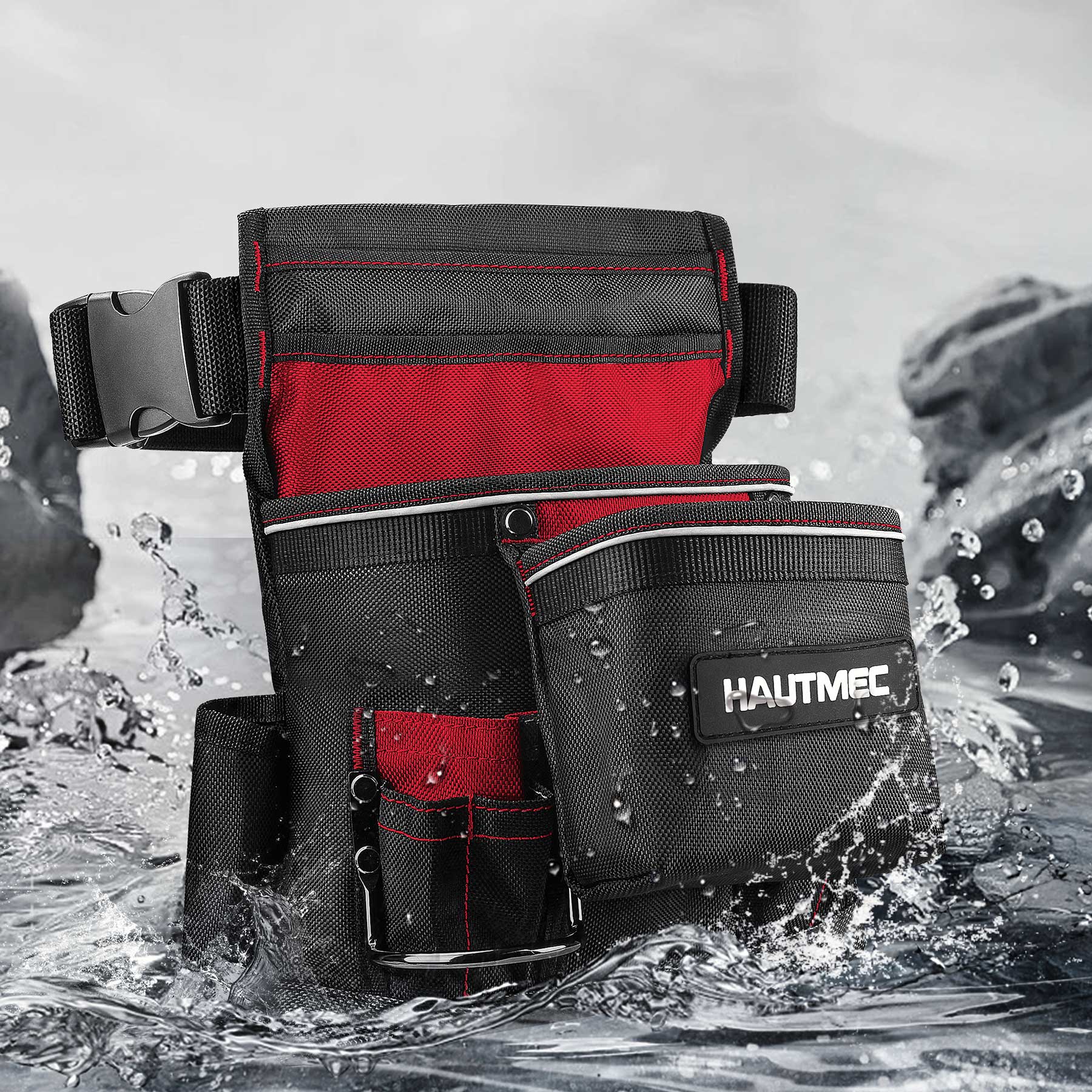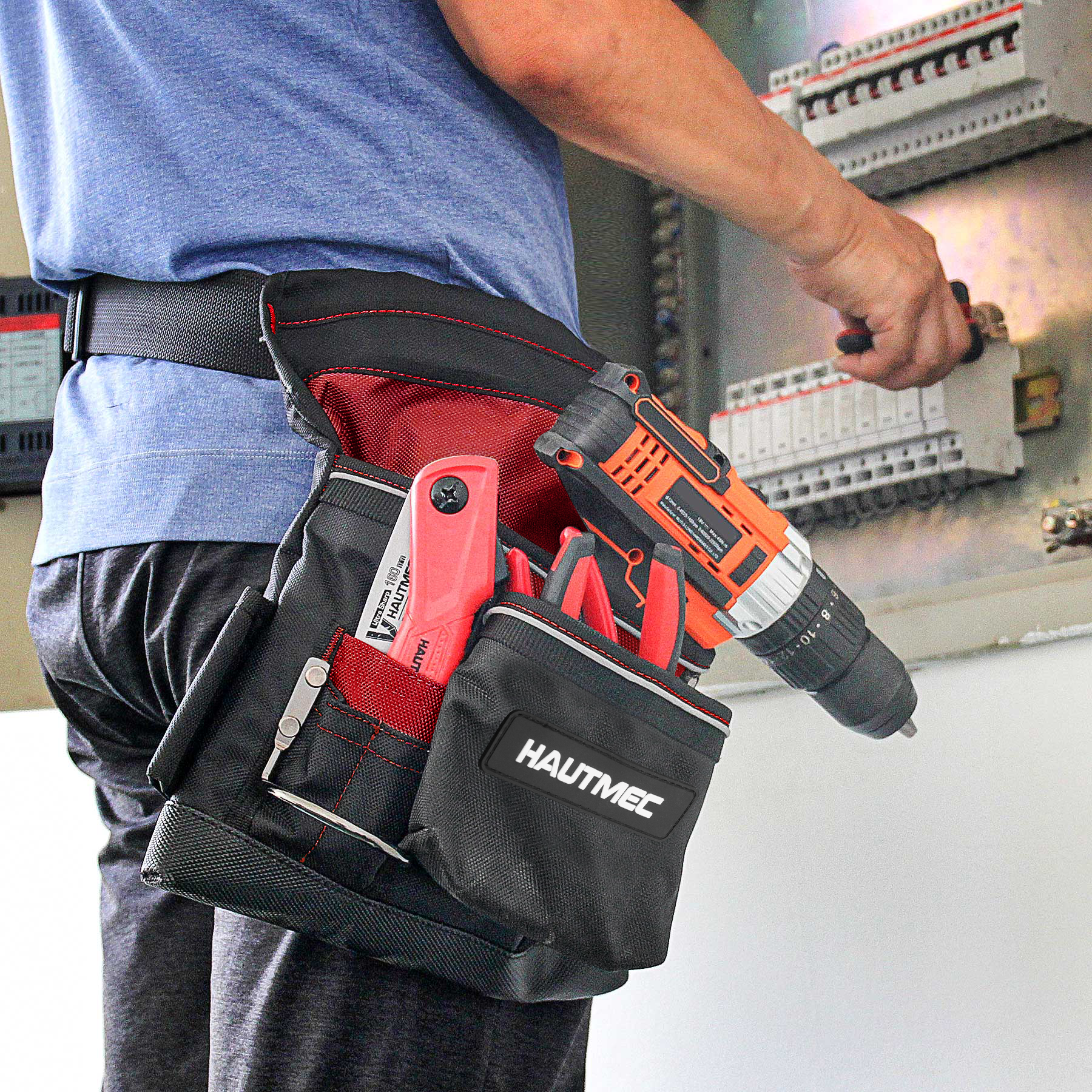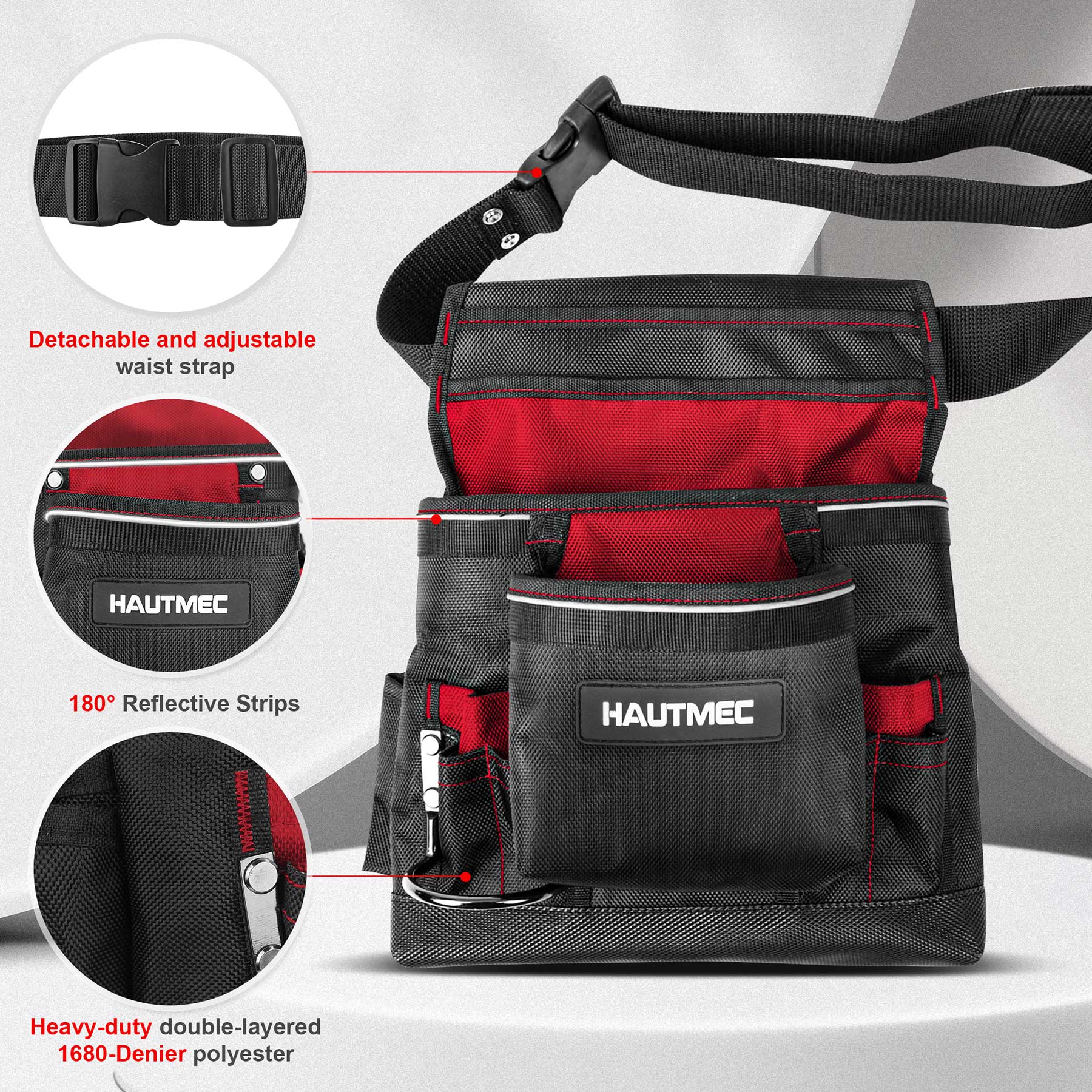 HAUTMEC Heavy Duty Framing Tool Belt Electrician Tools Pouch Organizer Work Belts For Men, 12-Pocket 1680D Tool Bag with Waist Strap Hammer Holder and 360°Reflective Strips, Black & Red HT0220-TBR