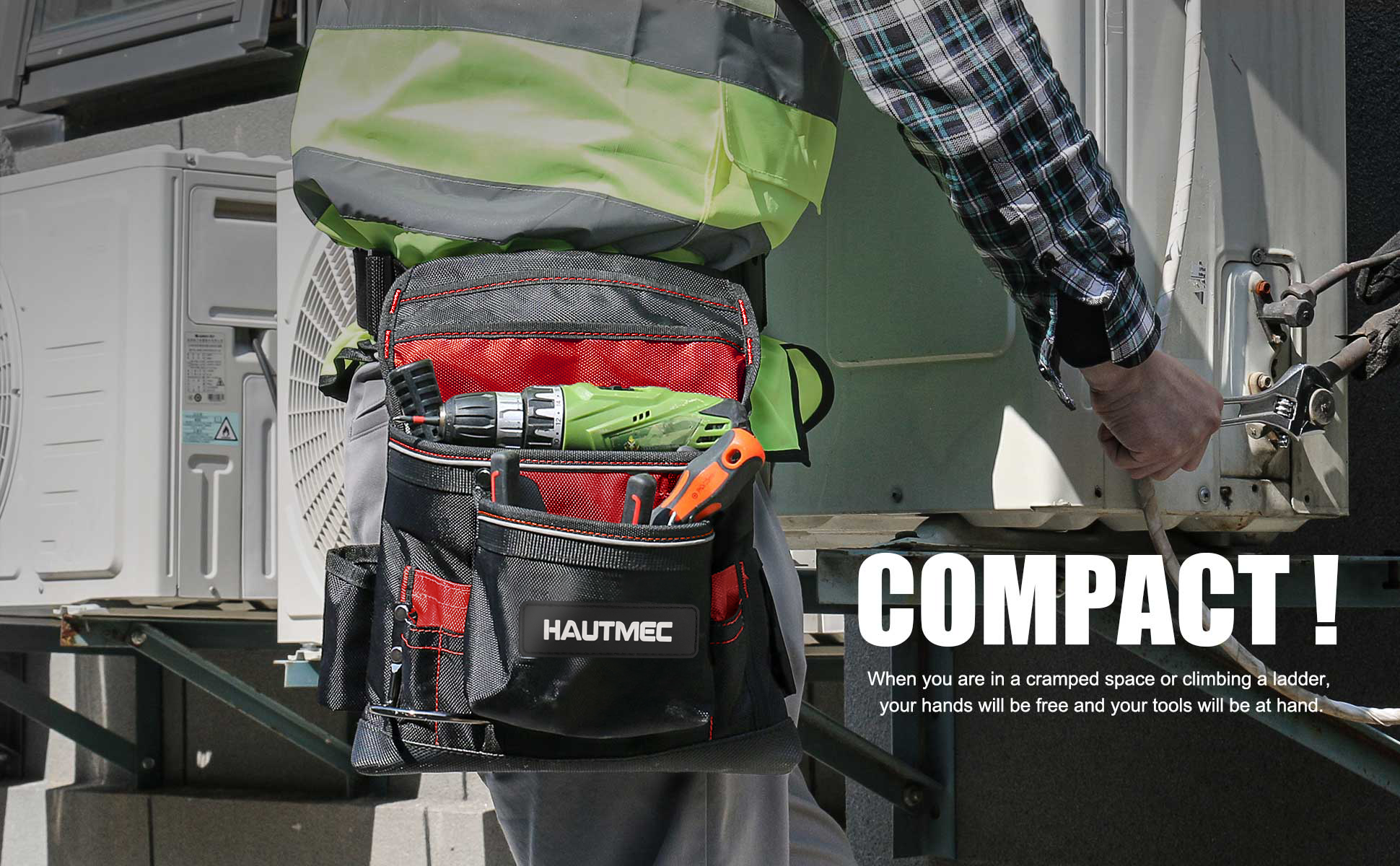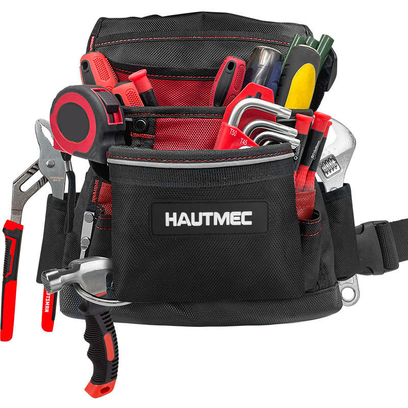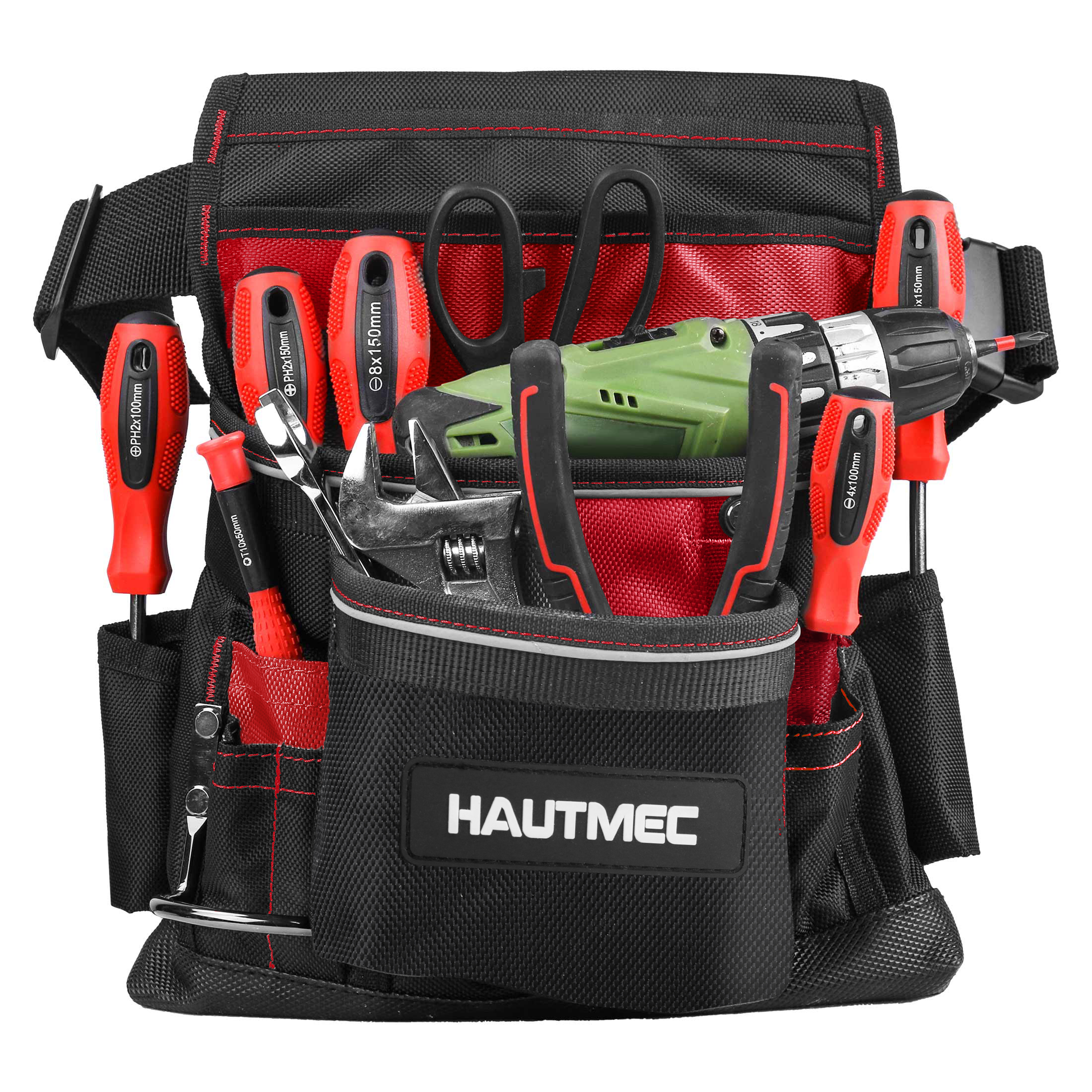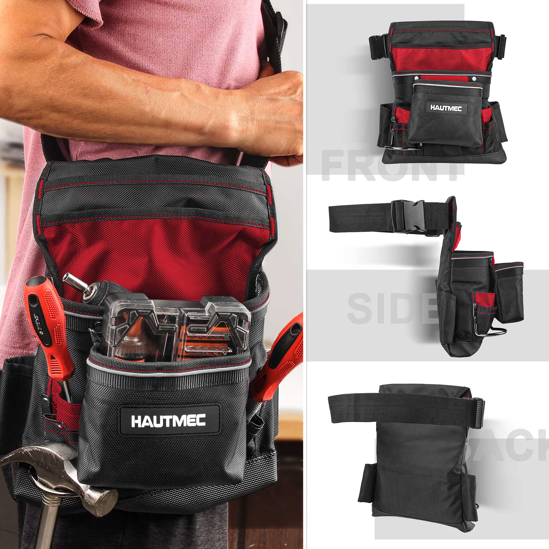 HAUTMEC Heavy Duty Framing Tool Belt Electrician Tools Pouch Organizer Work Belts For Men, 12-Pocket 1680D Tool Bag with Waist Strap Hammer Holder and 360°Reflective Strips, Black & Red HT0220-TBR