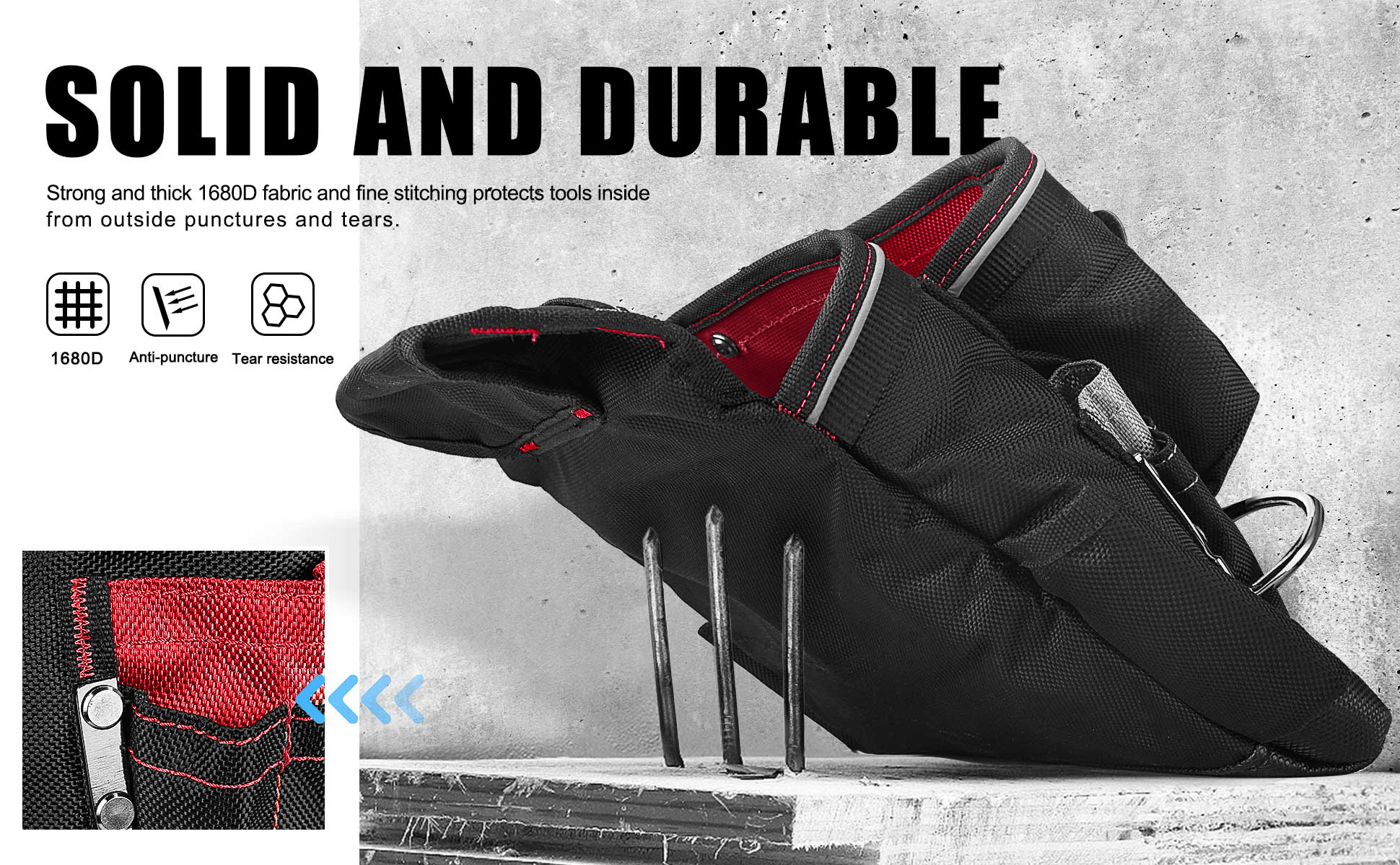 - Premium Material - Made from heavy-duty double-layered 1680-Denier polyester, this tool bag is super resistant to abrasions, punctures, and tears. Built to withstand the roughest conditions.