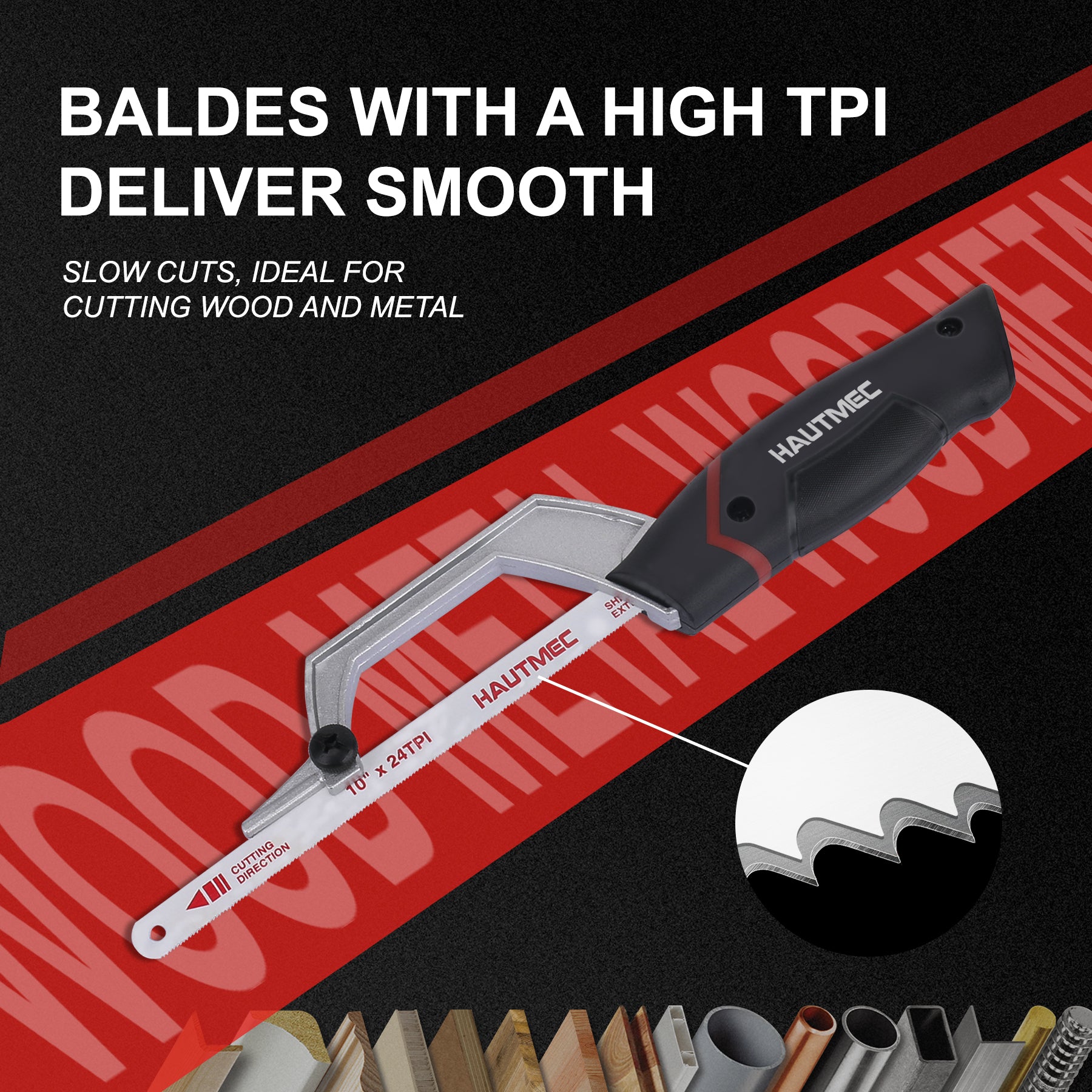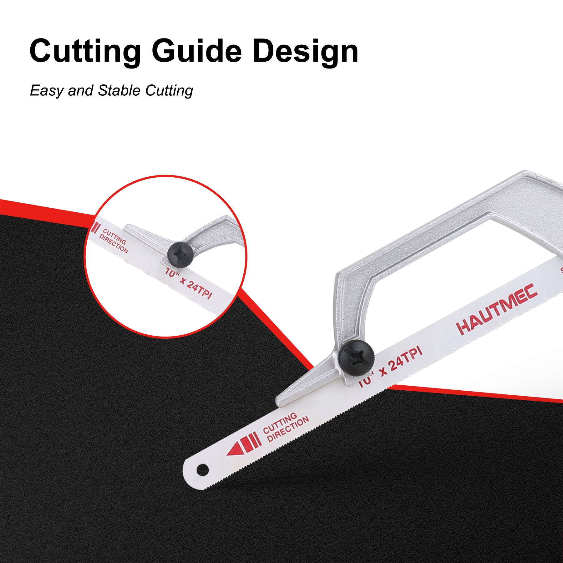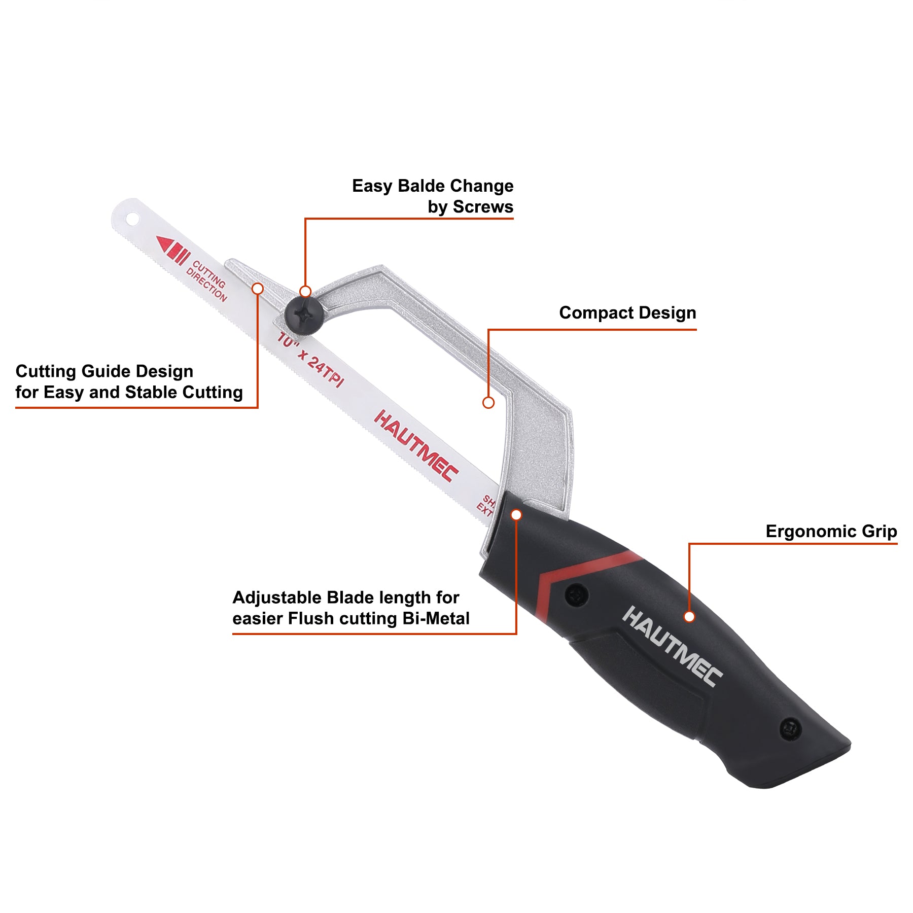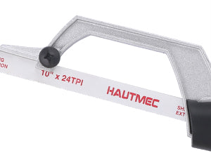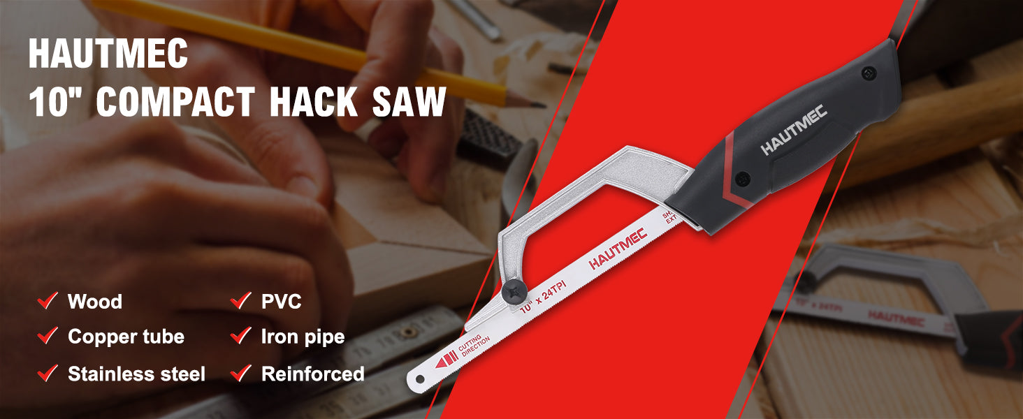 HAUTMEC Mini Hacksaw, 10" Compact Hacksaw with Cutting Guide Design, Tool-Free Blade Change, Compatible with 10"/12" Blades, Lightweight Hack Saw for Metal, PVC & Wood Cutting – HT0426
