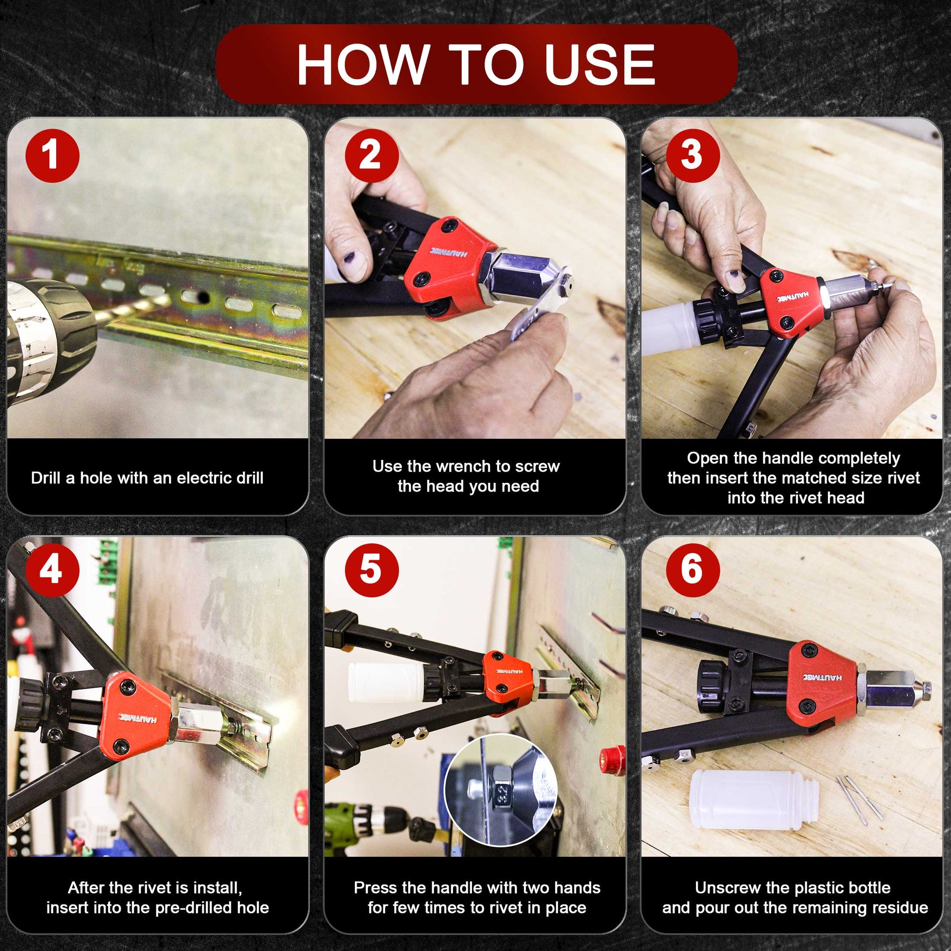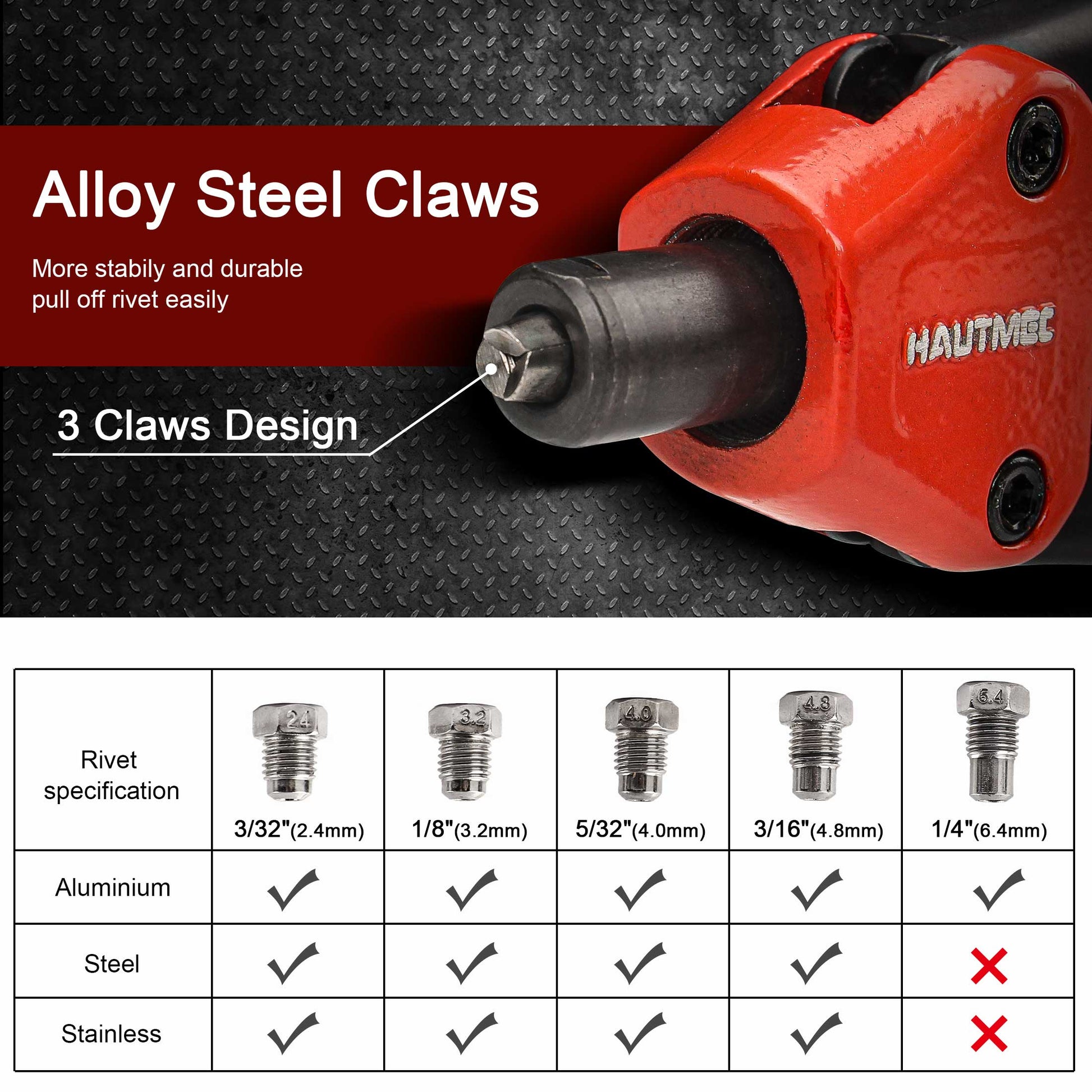 - Wide Application: Can fit rivets that are made from various materials such as steel, stainless steel and aluminum rivets. It can be widely used for automotive, aviation, railway, elevator, instrument, furniture, and DIY