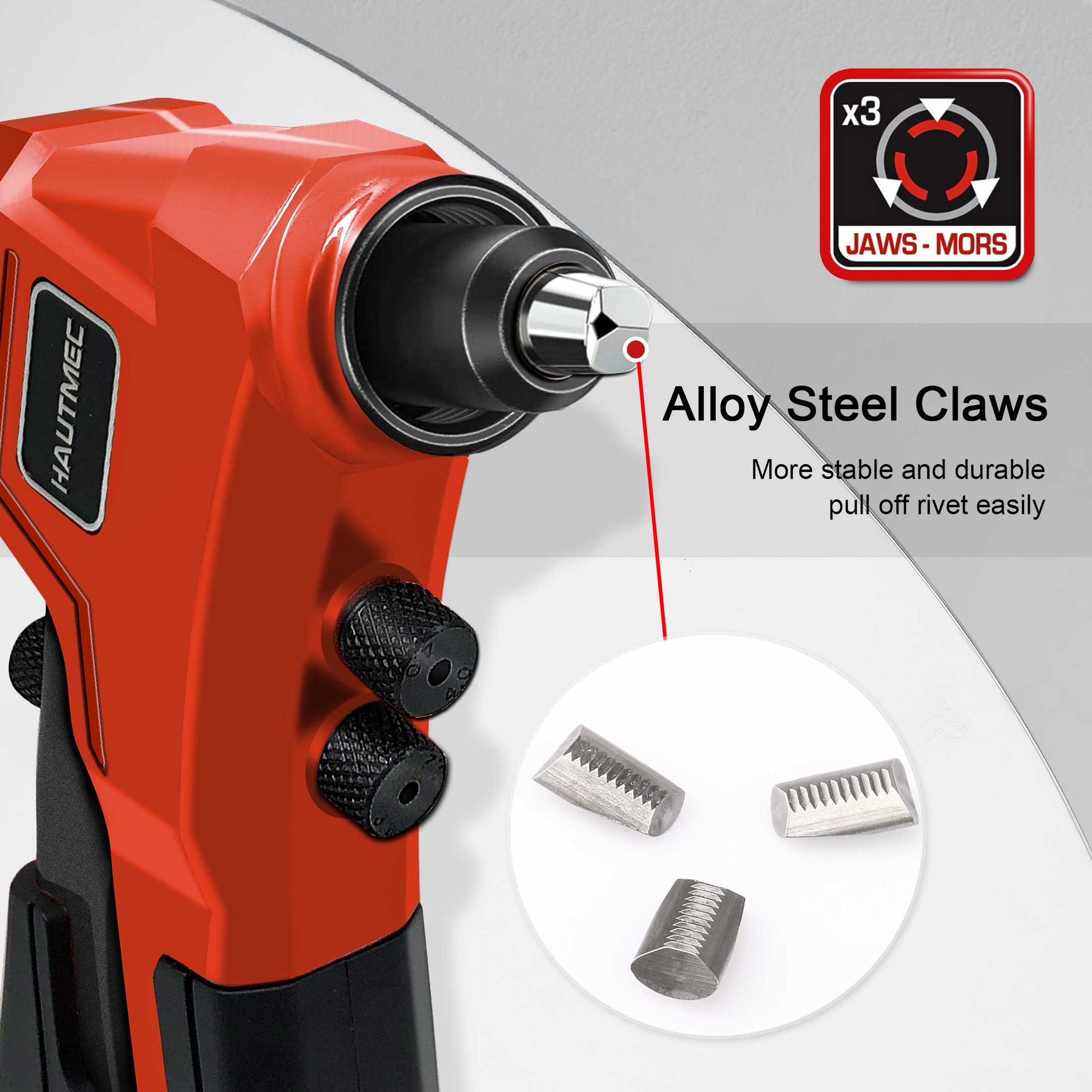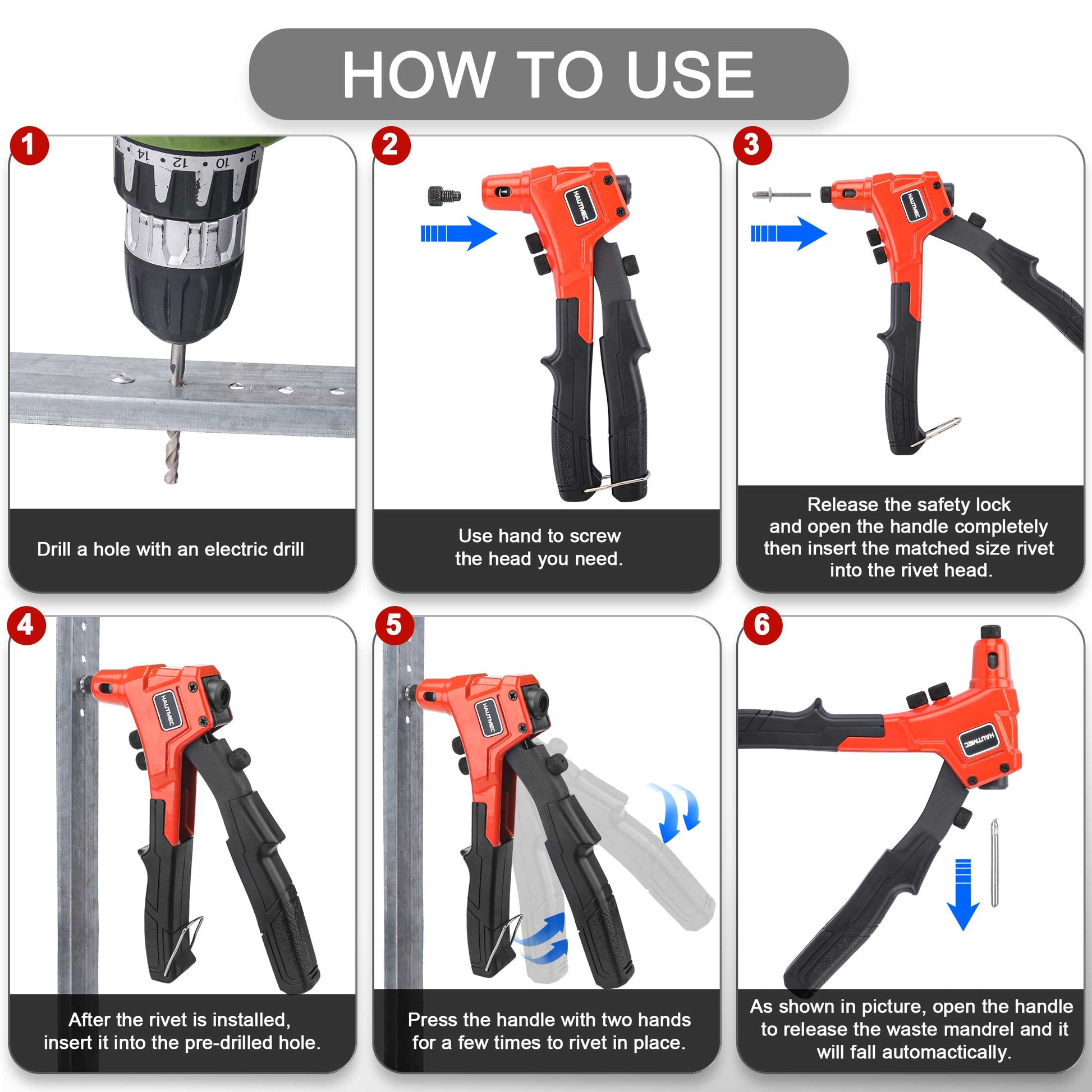 - Sturdy Material:This durable hand rivet gun in high grade aluminium die cast body and drop forged carbon steel handle, the three-piece chrome molybdenum steel chuck jaws in gun head for professional riveting power