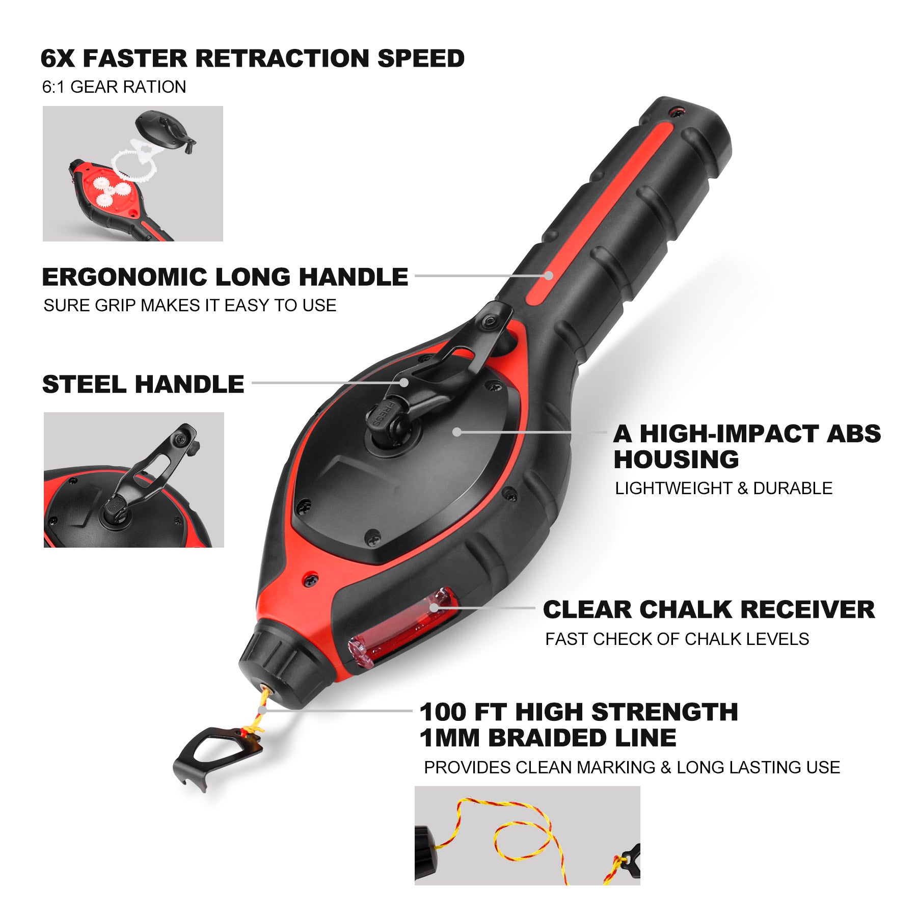 Convenient and Fast: With a gear ratio of 6:1, the handle design allows for smooth and rapid line retraction, enabling professionals to quickly and efficiently mark job sites