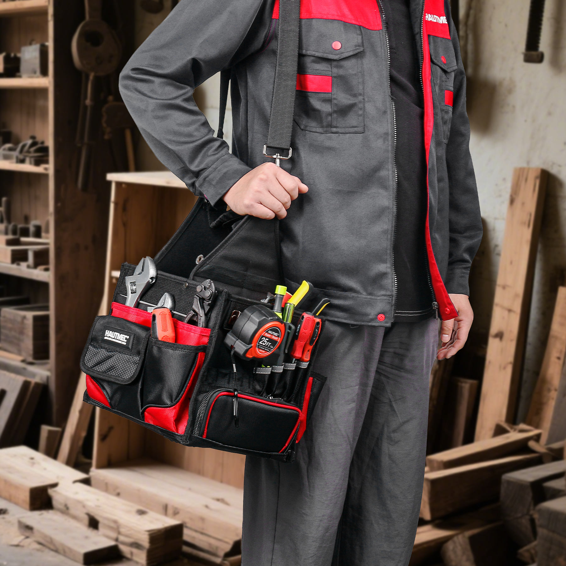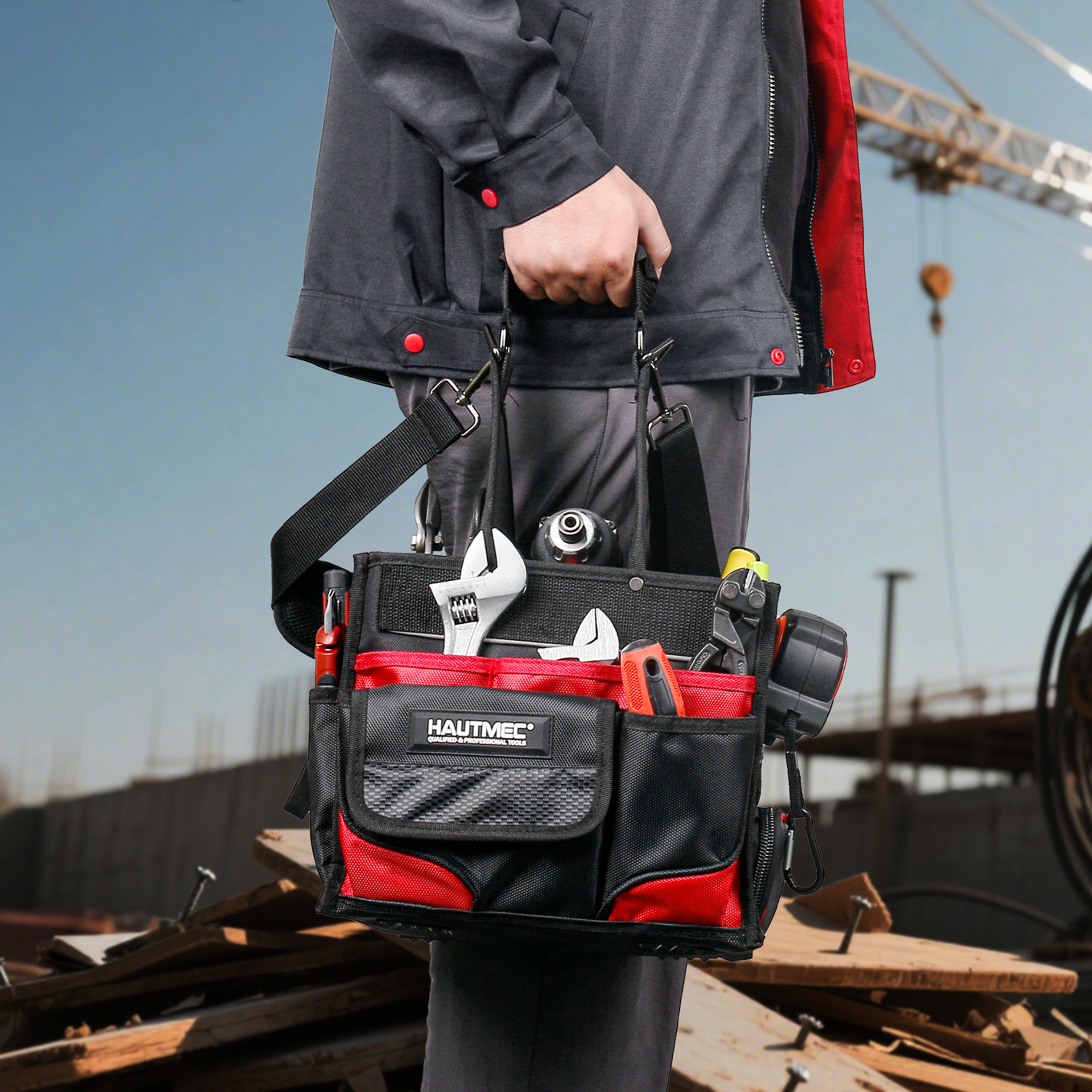 HAUTMEC Electrician Tool Bag with Parts Tray, Water-Resistant HVAC Tool Bag, Heavy-Duty 37-Pocket Open Top Tool Tote with Reinforced Base, Adjustable Shoulder Strap – HT0174