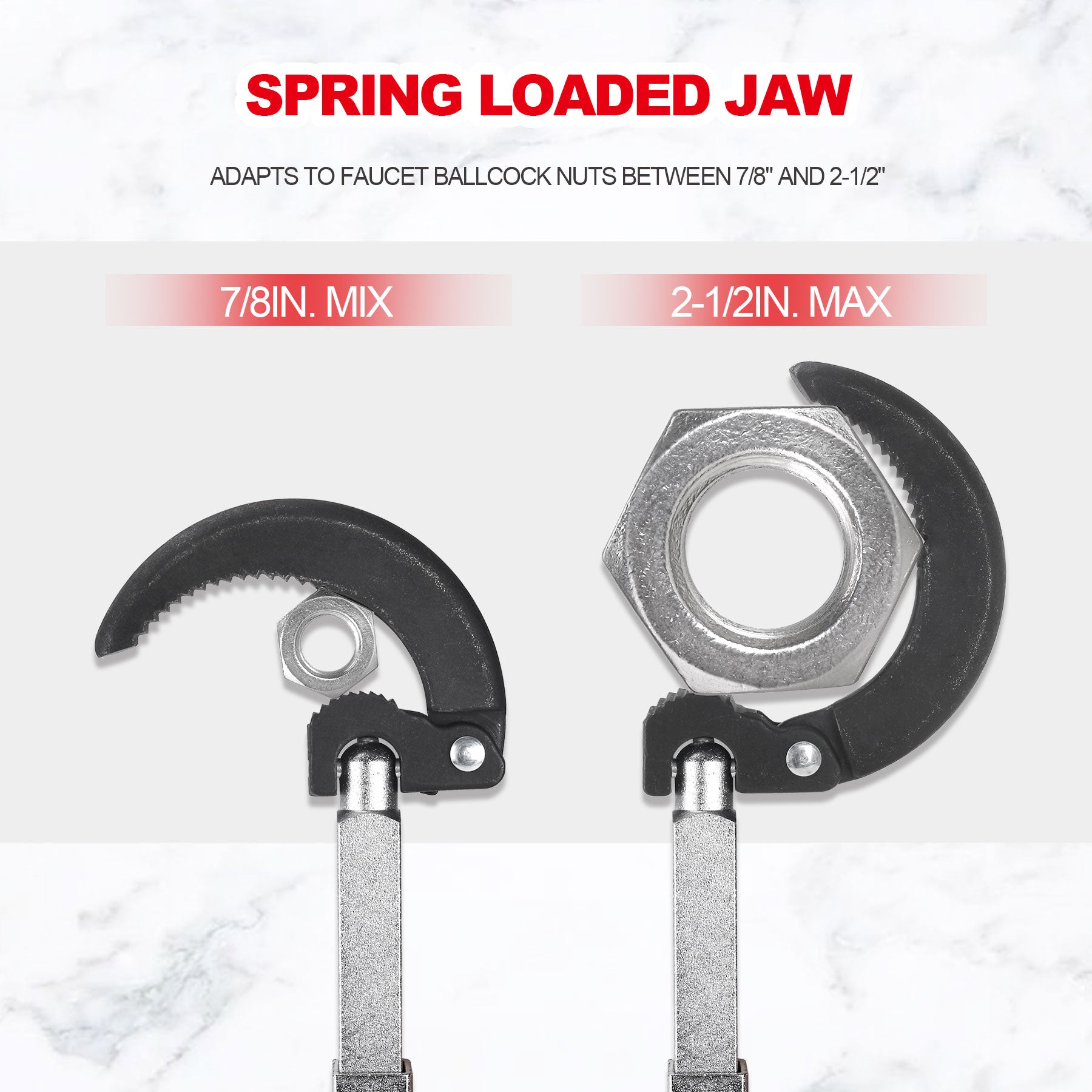 - LARGER ADJUSTABLE JAWS - Fits 7/8" to 2-1/2" in. Dia nuts; spring loaded jaws; features auto-adjustment to varied sizes and creates continuous ratcheting actions to stay engaged with the nut, facilitating one-handed operation without requiring re-fitting after each turn
