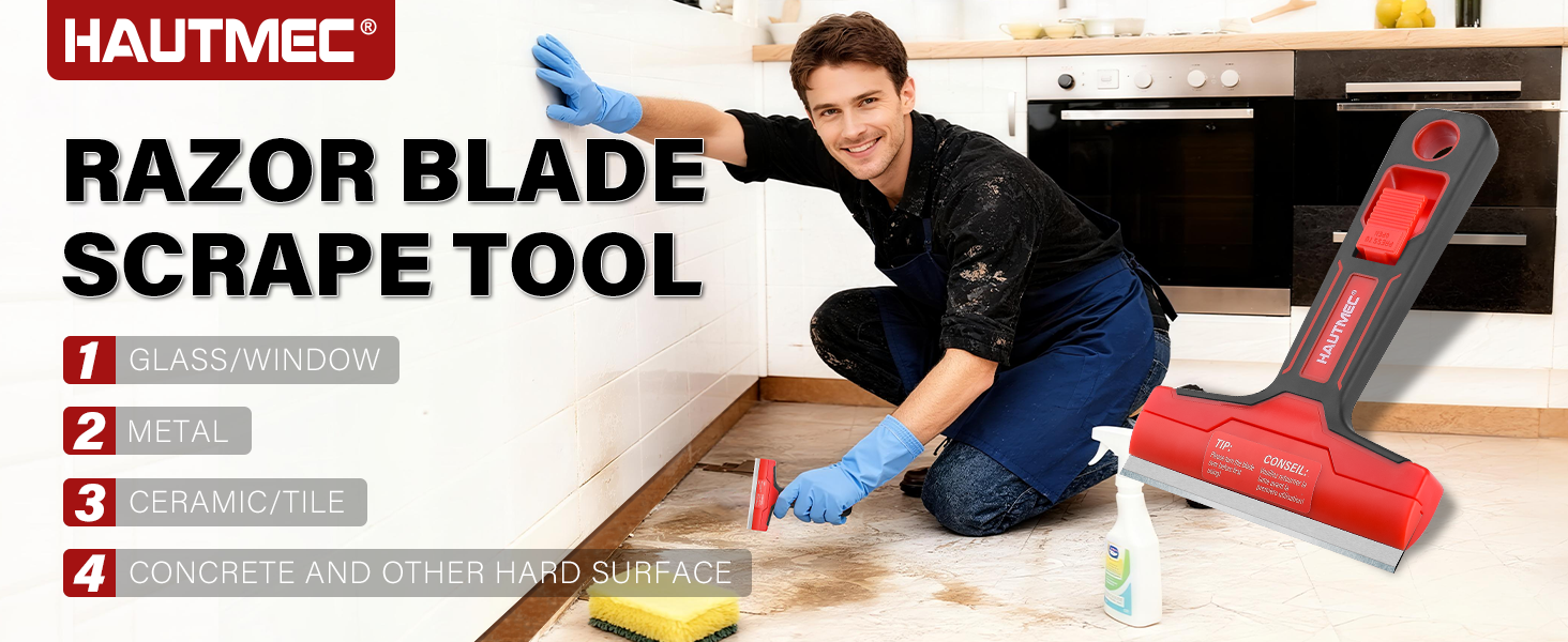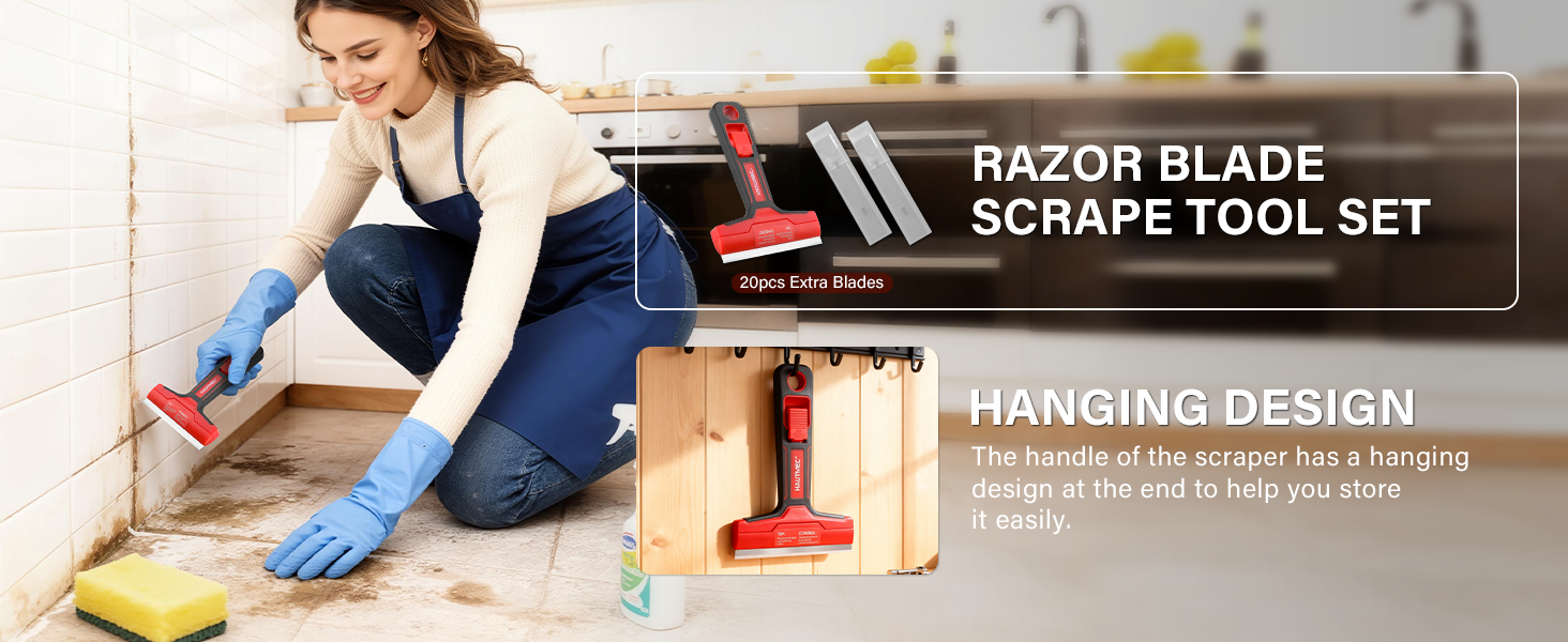 HAUTMEC Razor Blade Scraper Tool, 4" Wider Scraper Tool with 20 Extra Carbon Steel Blades, Razor Scraper for glass scraper, Adhesive, Label, Sticker from Window, Glass, Tile, Floor, Stove HTPBM25033