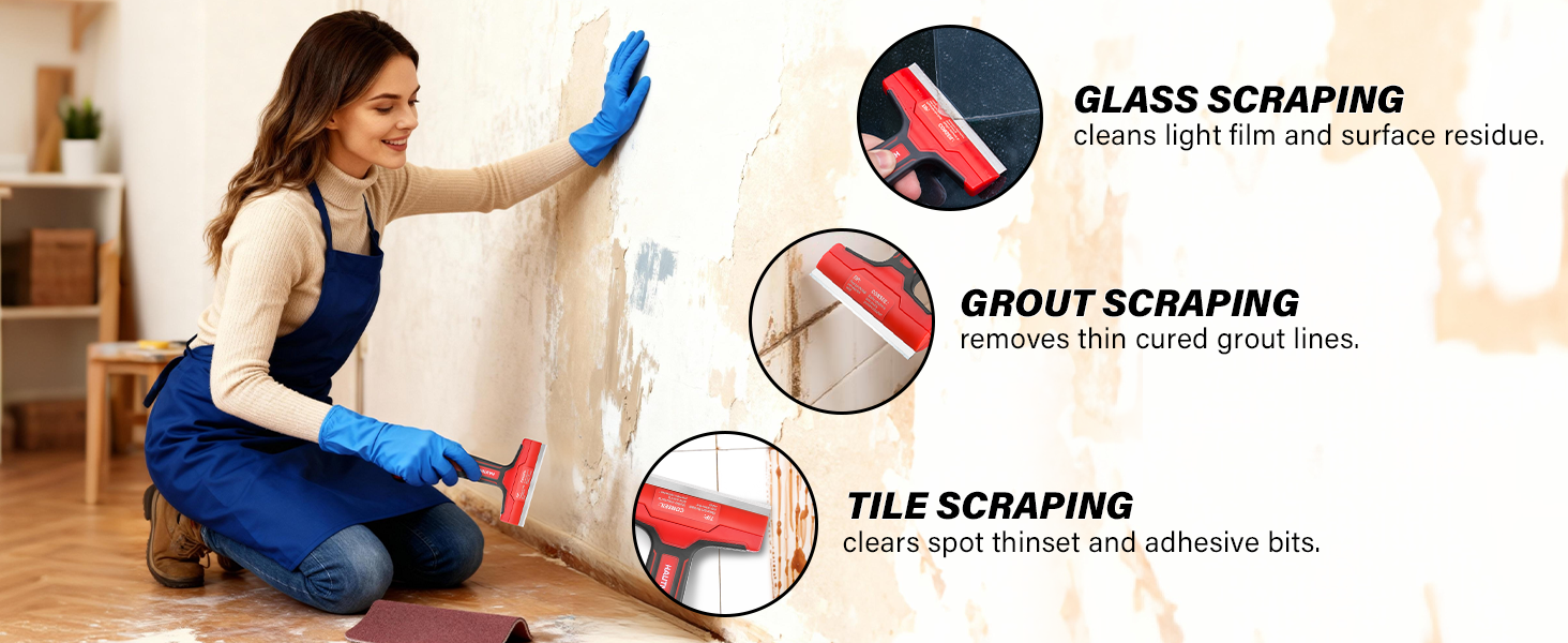 - Extra-Wide Scraping Efficiency: Experience 40% faster cleaning with our 4" wide scraper blade design. Perfect for large-scale paint removal, wallpaper remover tasks, and floor scraping projects. The broad surface coverage makes it highly effective for window scraper applications and oven scraper jobs on flat surfaces