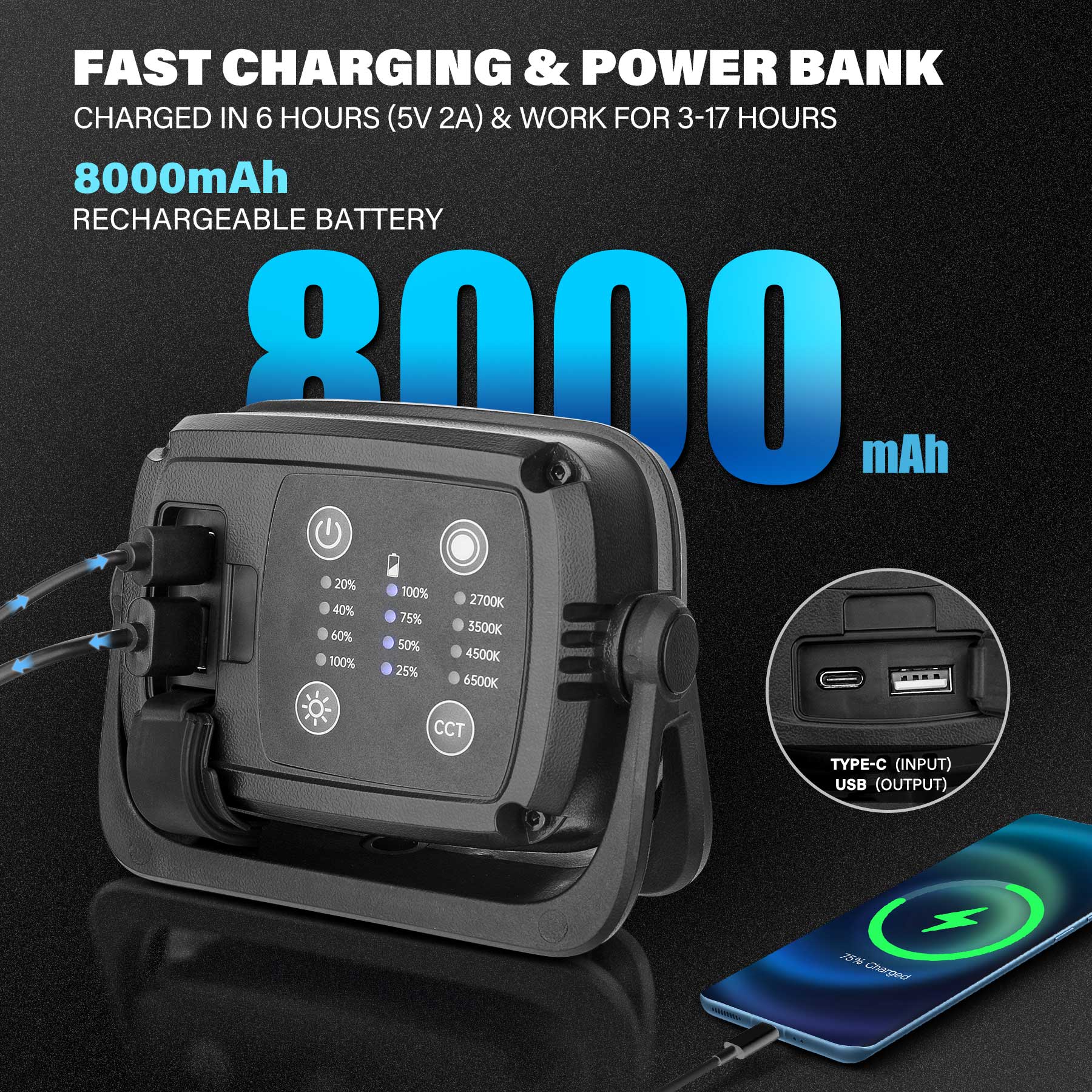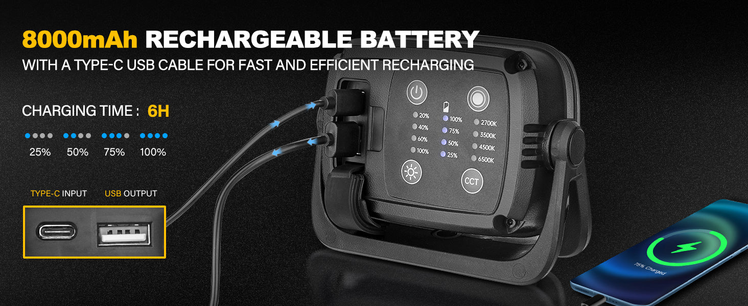 - 【USB Charging & Power Output】A built-in 8000mAh rechargeable battery and a TYPE-C USB cable allow the light to work for 3 hours with the highest lumen and 17 hours with the lowest lumen after a full charge; 4 power indicator lights to facilitate an easy check of remaining battery power; an out port to charge your mobile phone and other electronic devices in emergency as a power bank