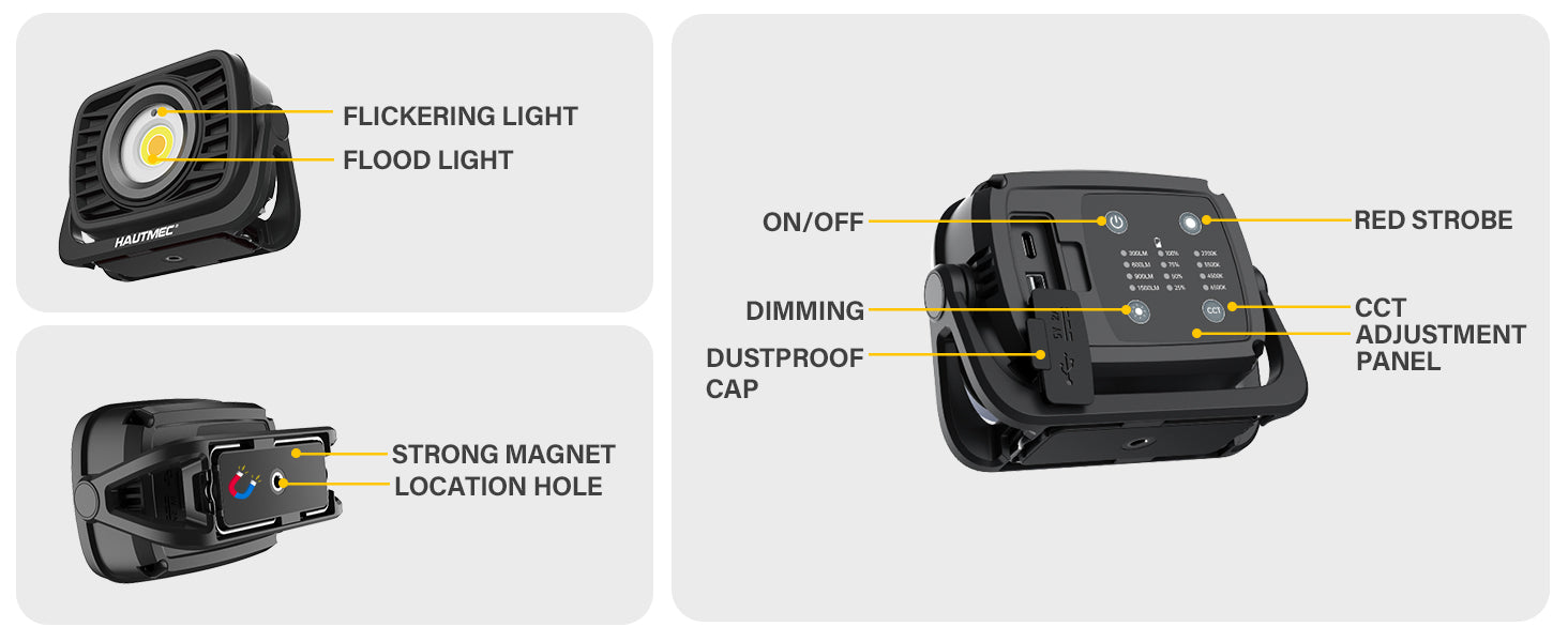 - 【4 Brightness Modes & 4 Color Temperatures】The work light features buttons for an easy adjustment respectively for 4 levels of brightness, 4 color temperatures and stay-on red light and red light flash modes.