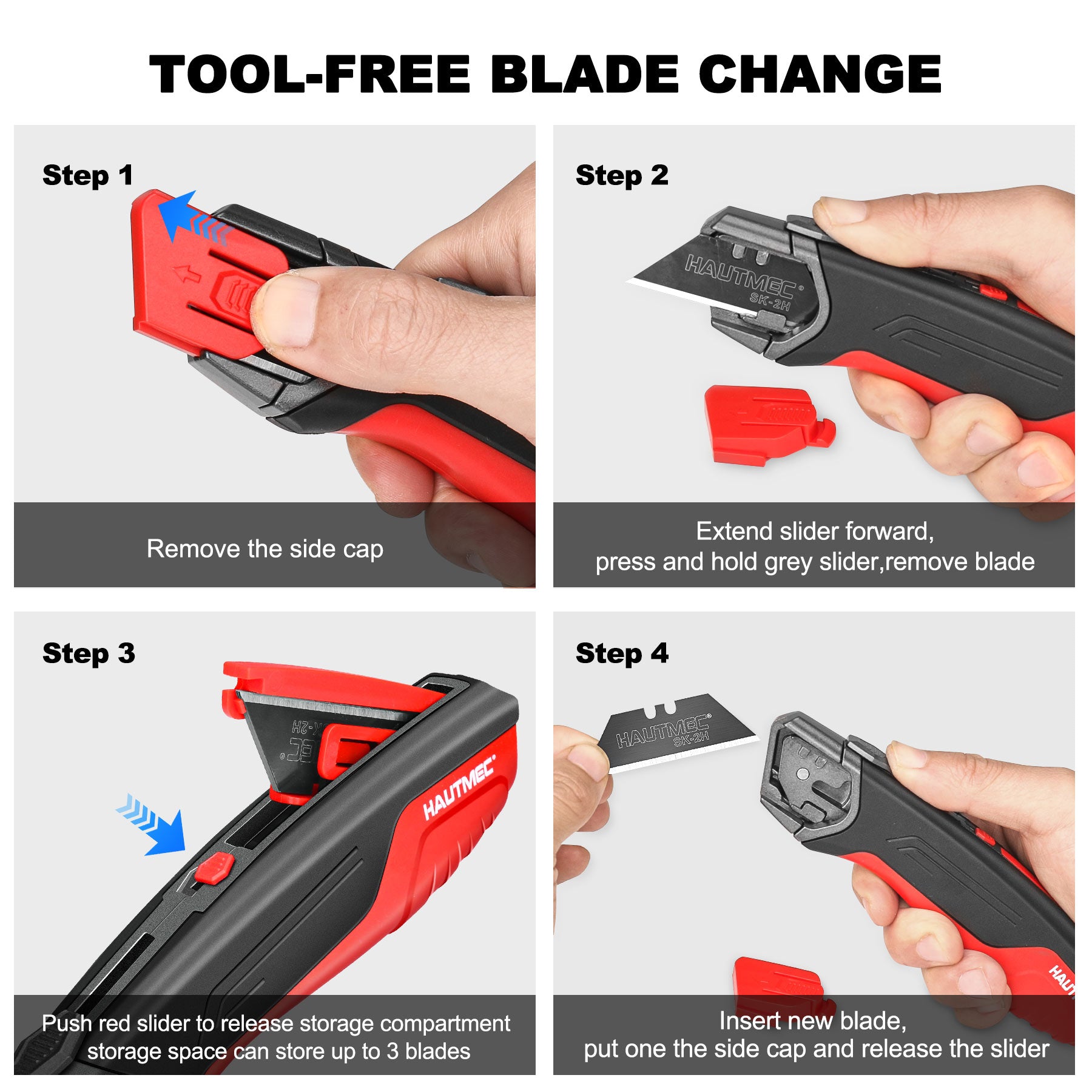 - 【Ultimate Cutting Performance】: Comes with total 4pcs Ultra sharp blak SK2H razor blades and of which 3 spare blades are stored in the storage compartment, which can be easily accessed by push red slider.they ensure better hardness, edge retention, sharpness, durability for the cutting.