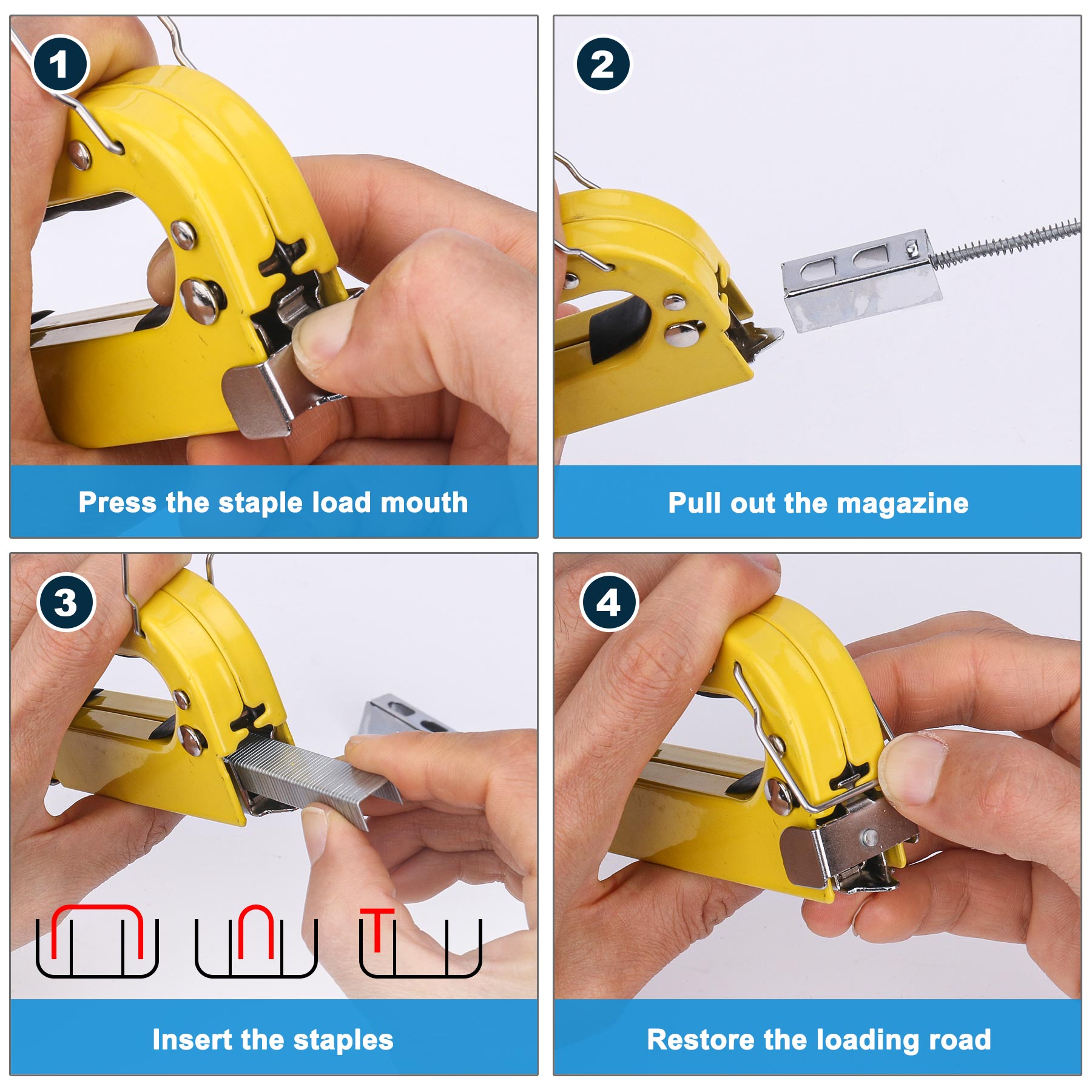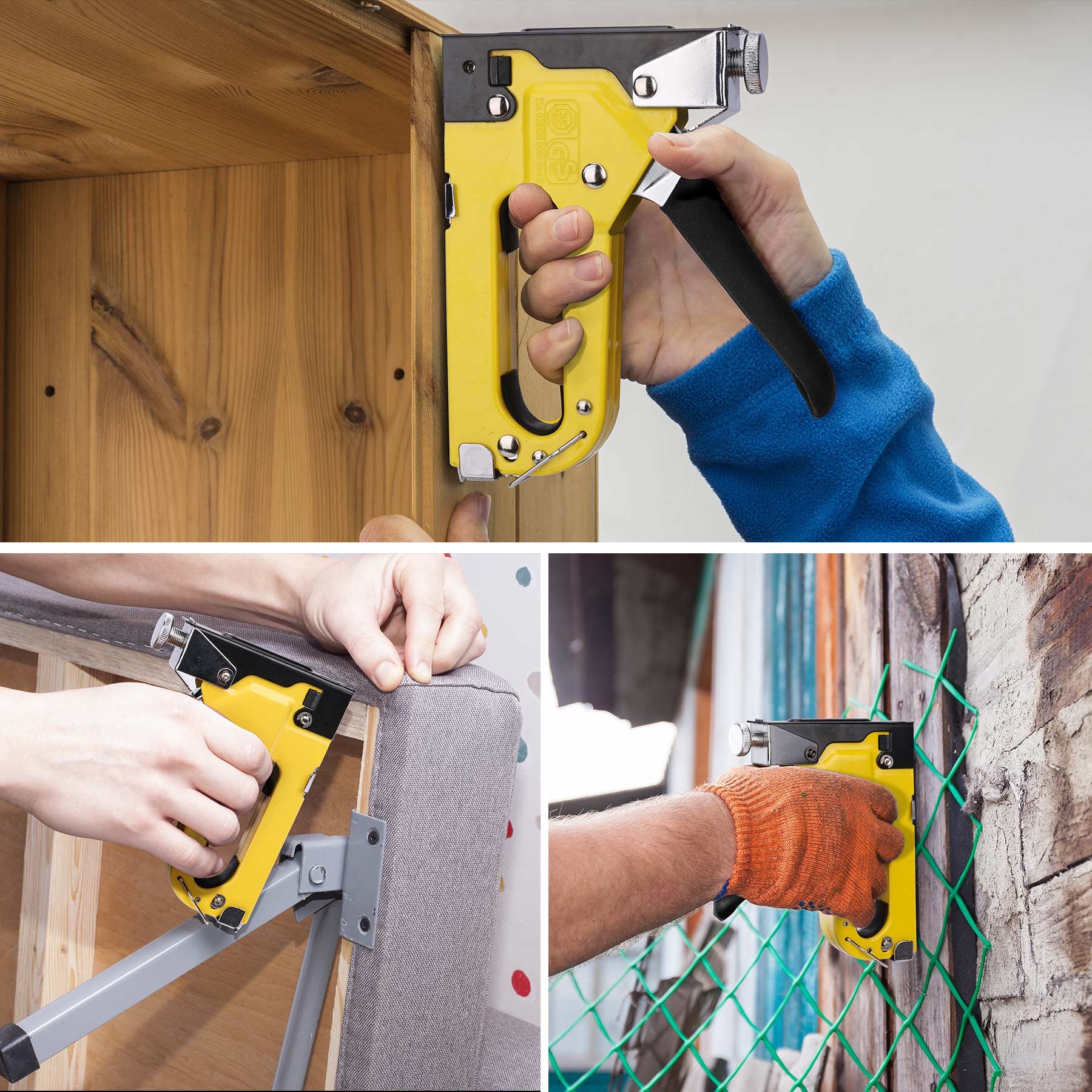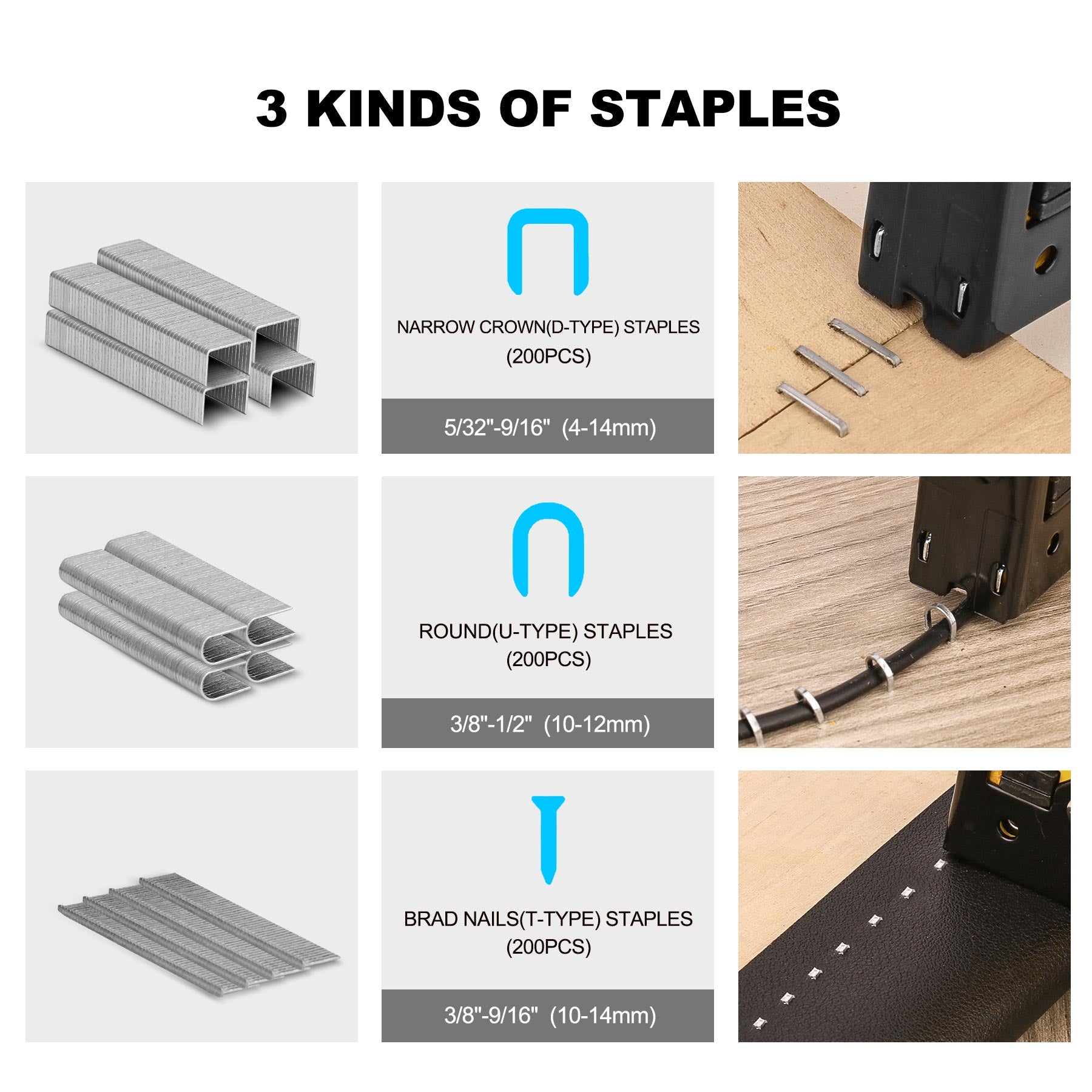 - 3-IN-1 DESIGN: It accommodates 3 types of staples: narrow crown(D-type), round(U-type) and brad nails(T-type) ,suitable for general repairs,upholstery,wood working,packing,roofing.