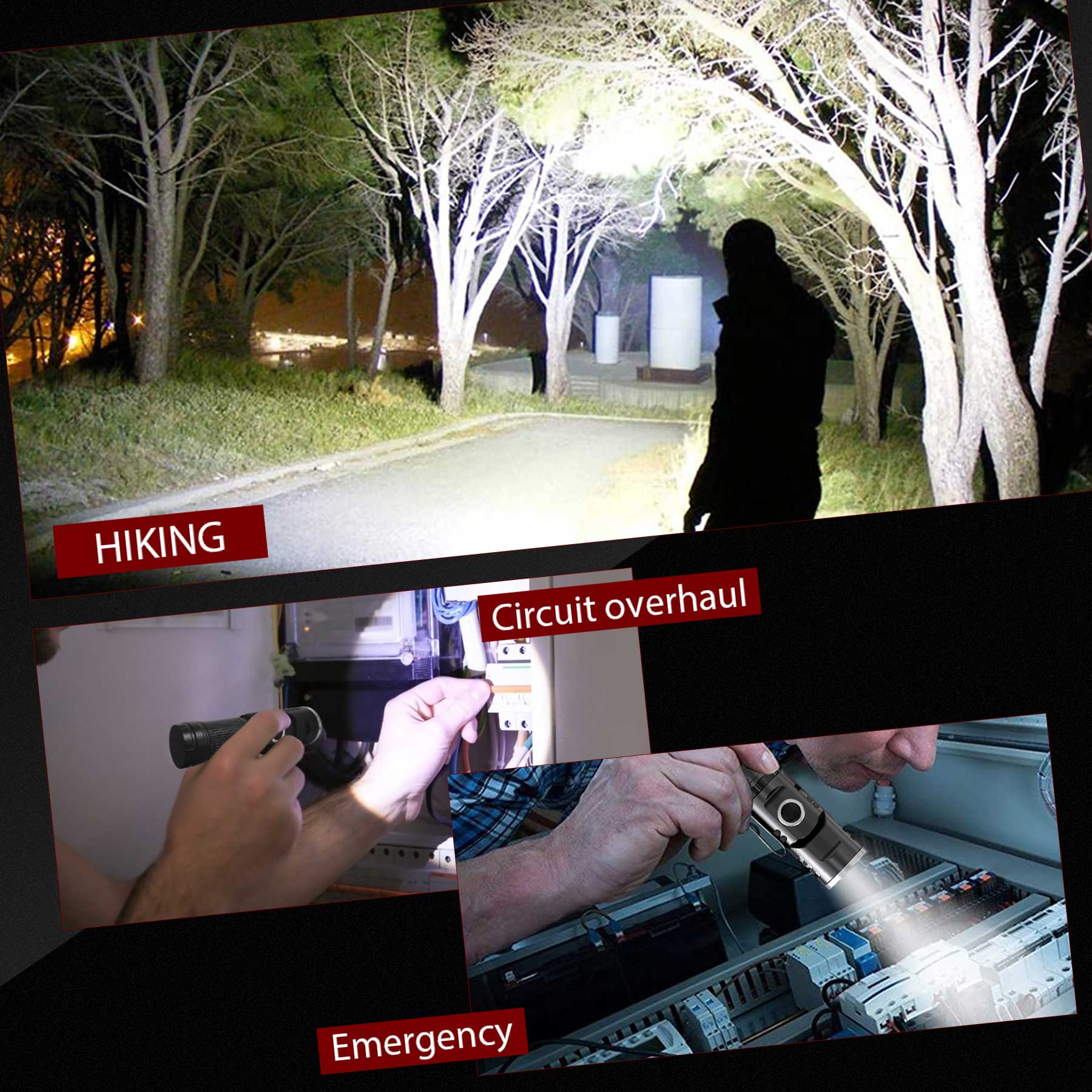 - 90°ROTARY HEAD & CLIP: This compact flashlight features 0-90°adjustable head. With 360 degree clip, you can clip the flashlight on your pocket or belt, to make hands free