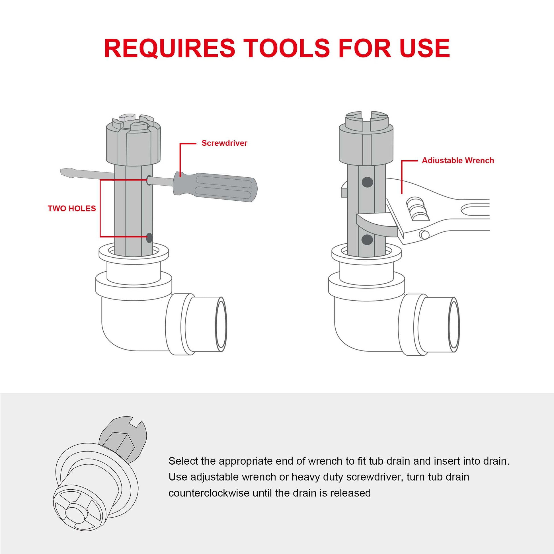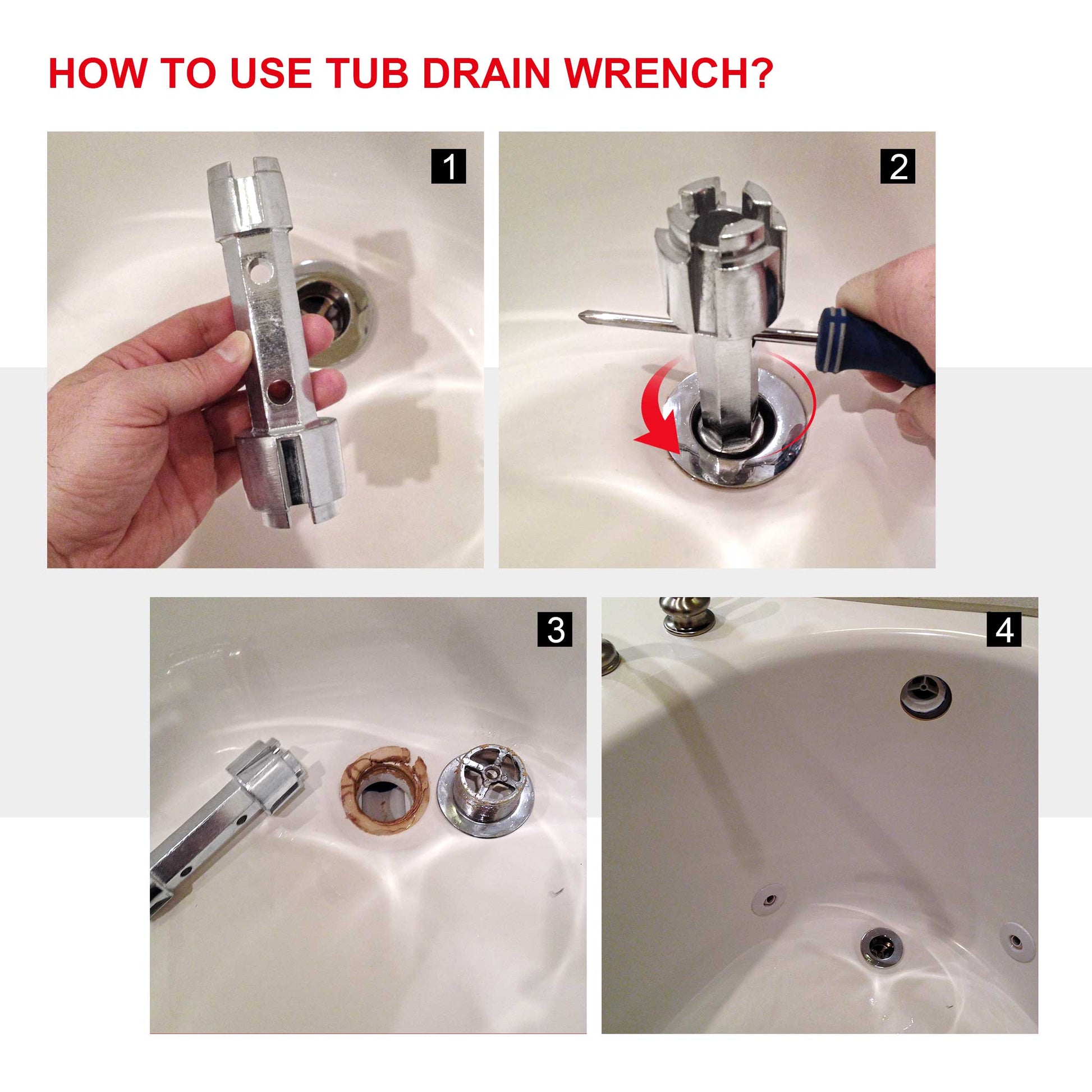 - Instructions:Select the appropriate end of wrench to fit tub drain and insert into drain;Use adjustable wrench hold the tool or heavy duty screwdriver insert the tool;turn tub drain counterclockwise until the drain removed then turn clockwise to tighten the drain.