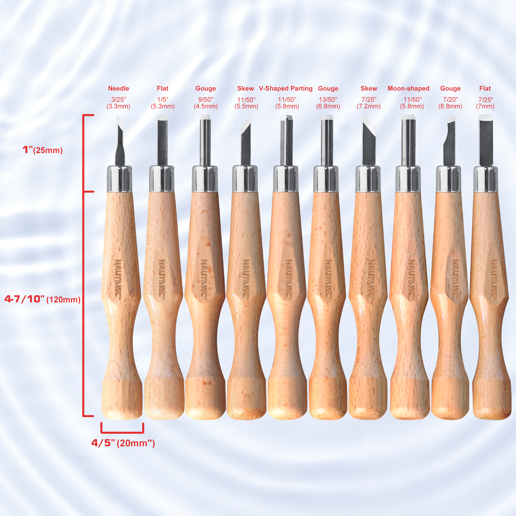 - Comes with zipperd pouch containing 2 gouges, 2 skews, 2 straight chisels,1 V-parting tool, 1 needle kinfe and 1 moon machete, with protection sleeve on each blade, the multiple sizes and shapes make fine details easy to achieve.