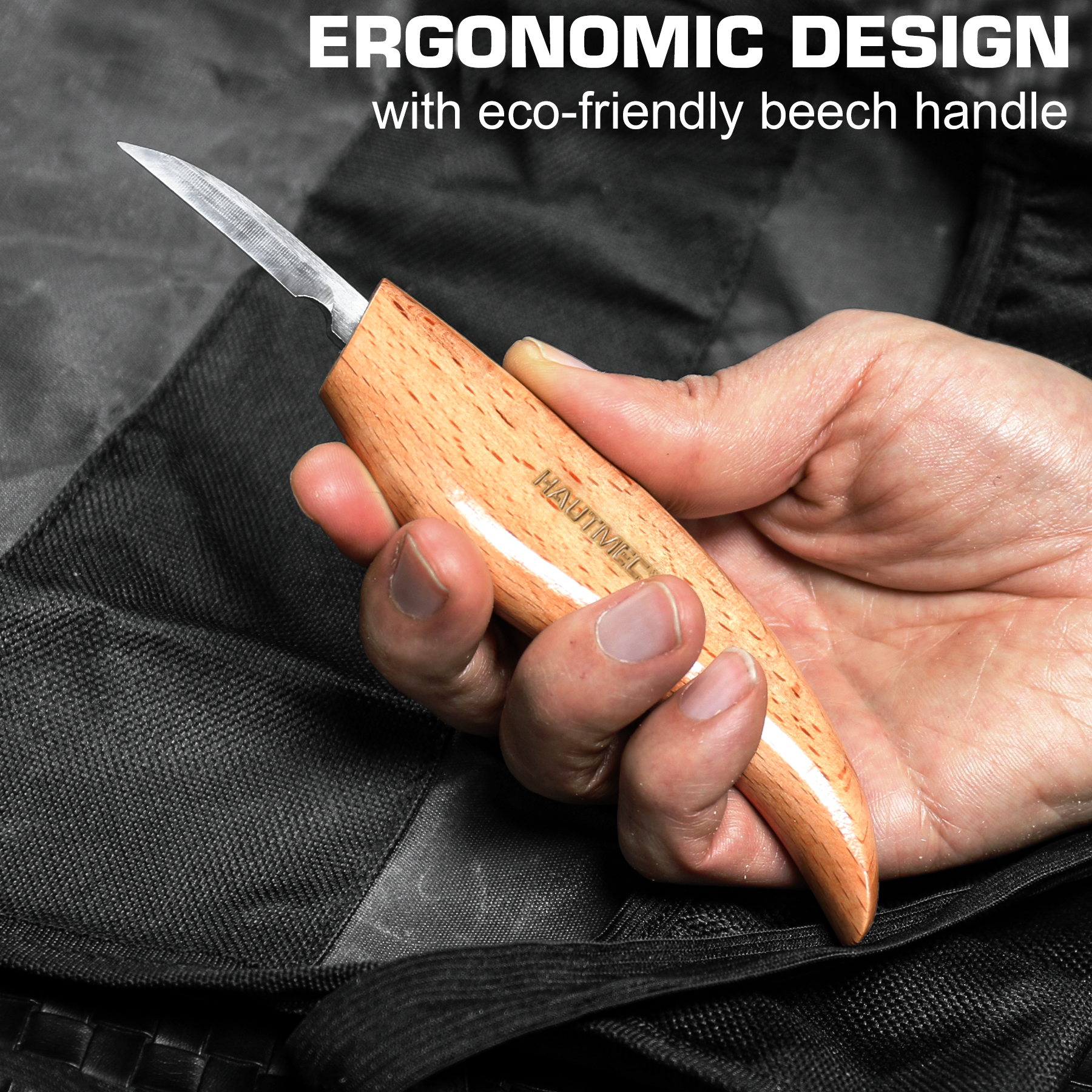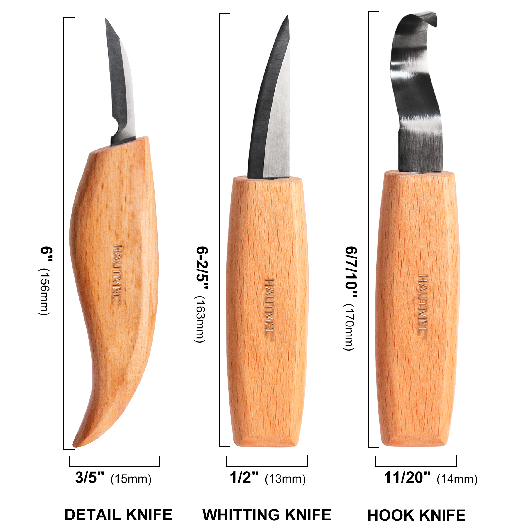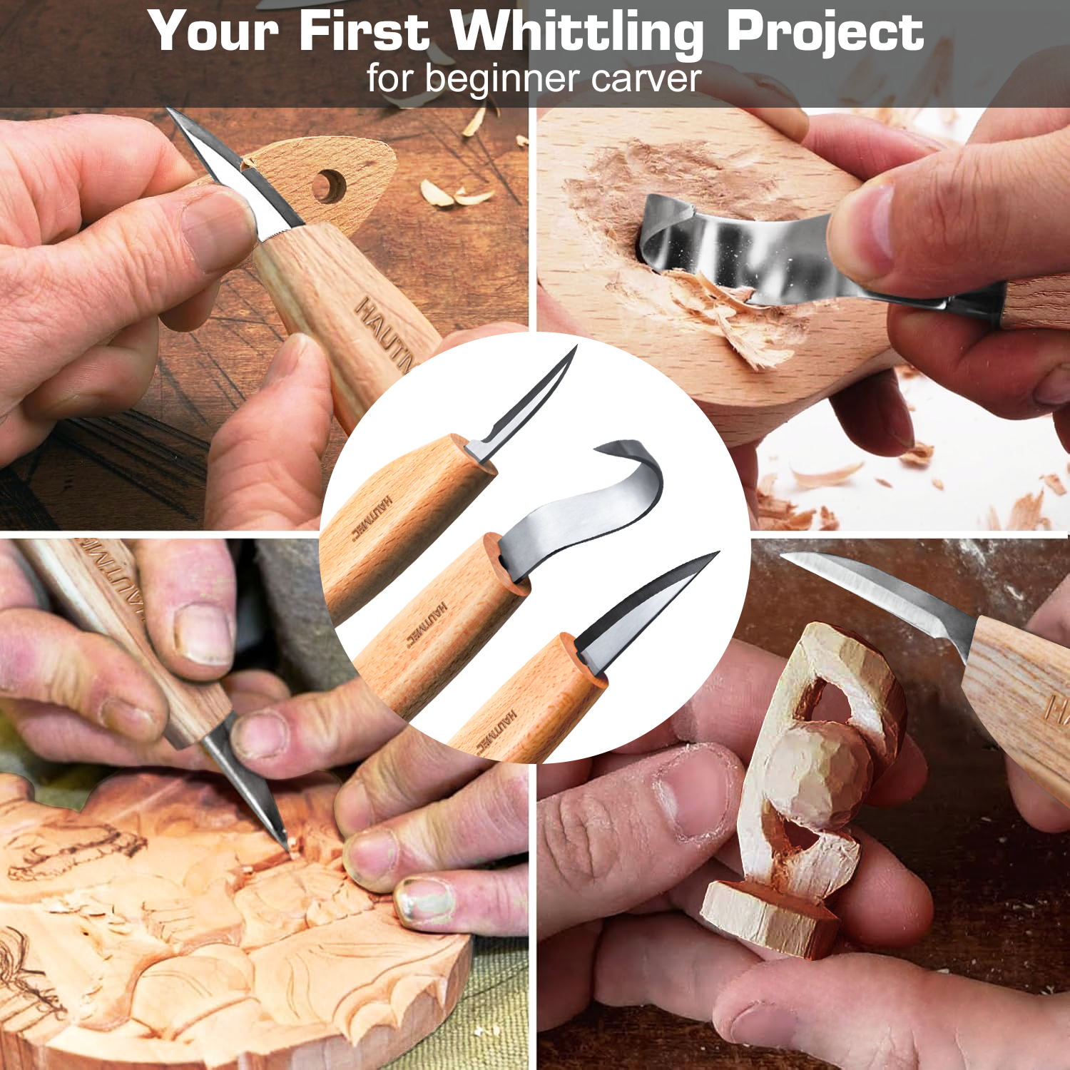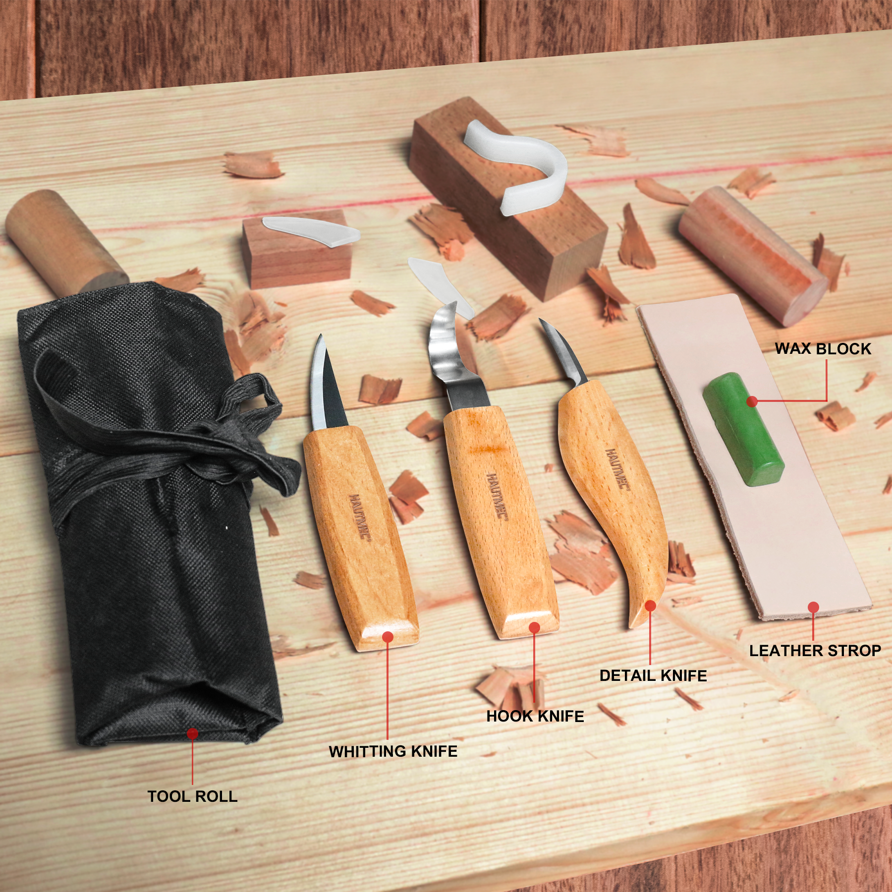 HAUTMEC Wood Carving Whittling Tools Set for Beginner Carver,Youngsters,Includes 3pcs Carving Knives And Leather Strop and Polishing Compound, HT0390