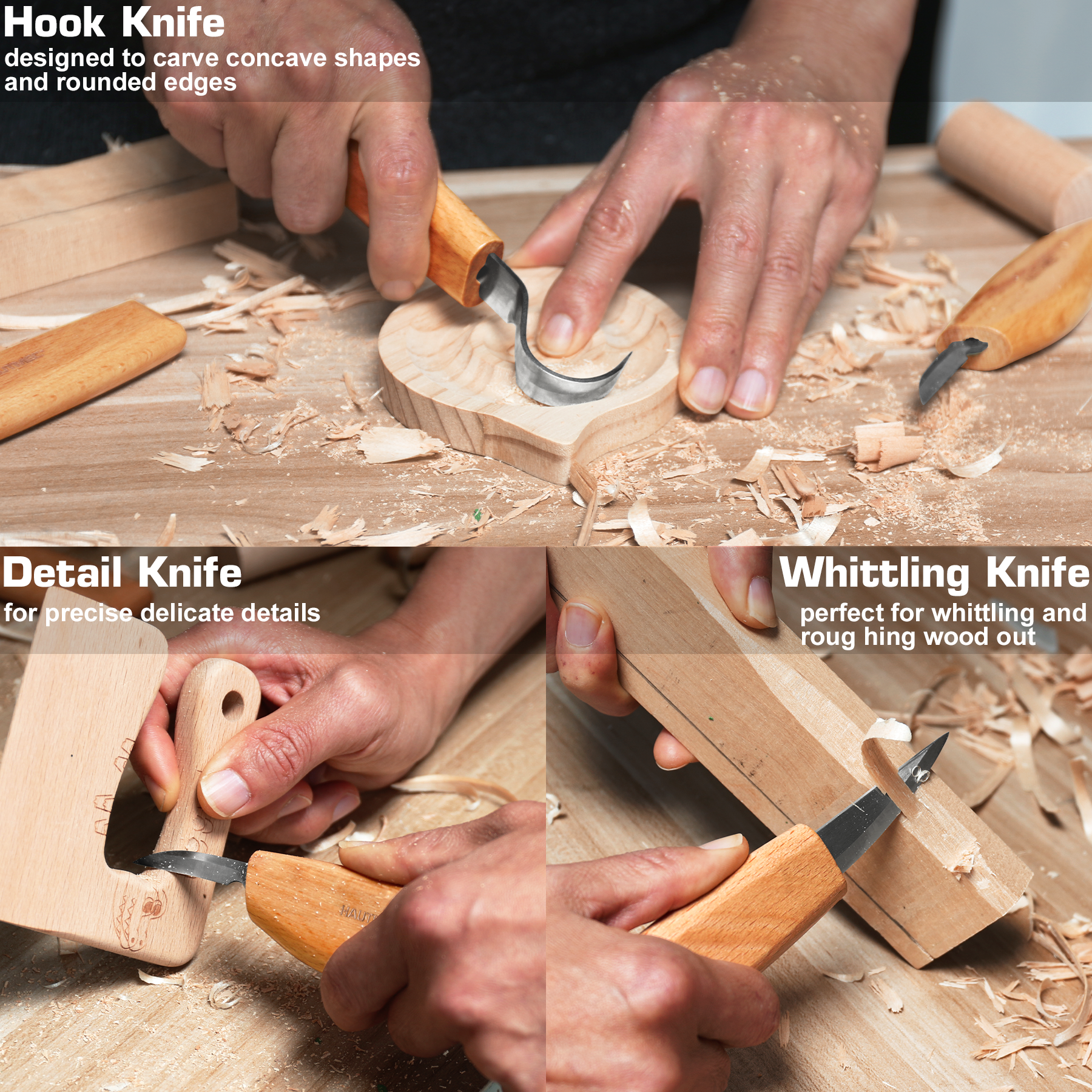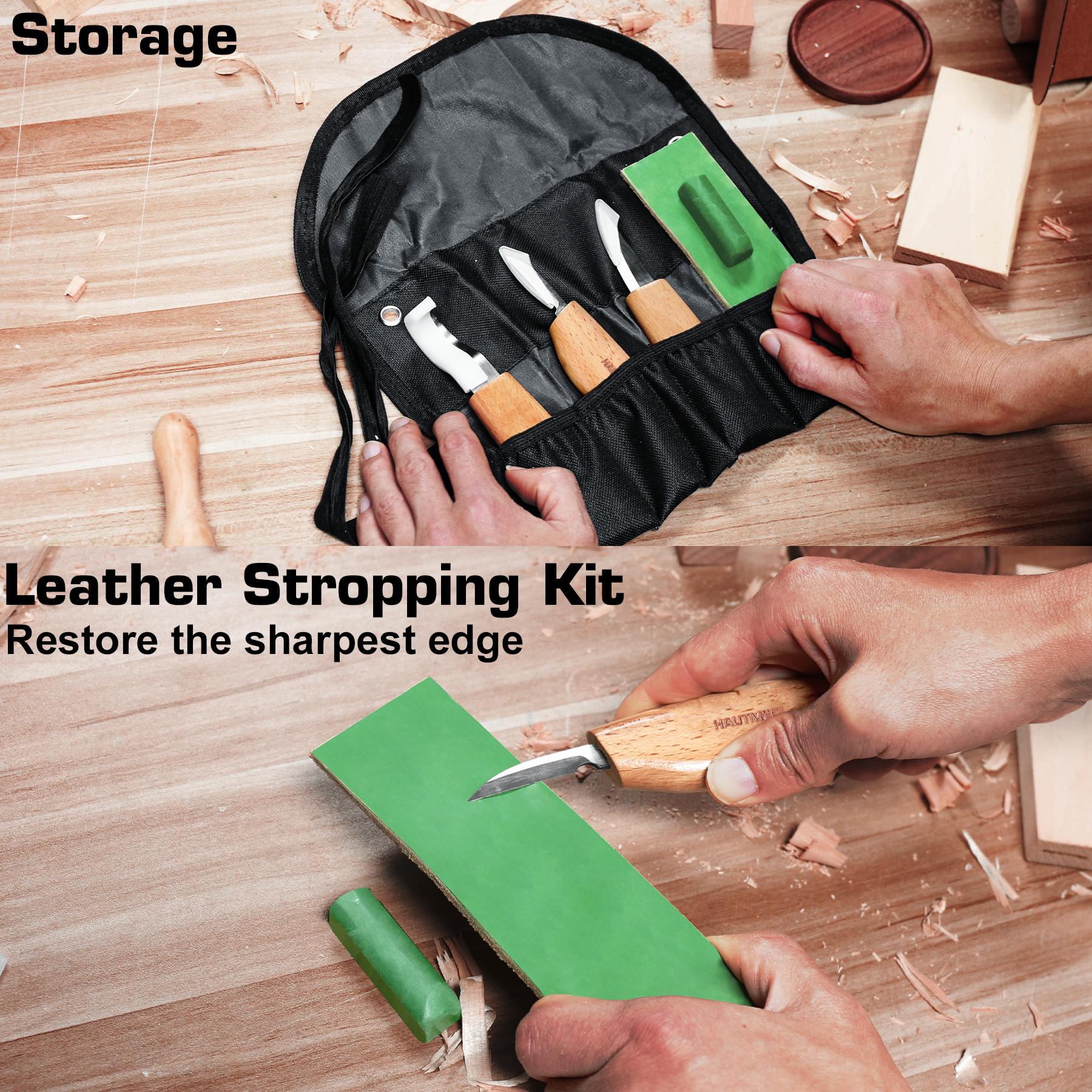 - A whittling kit includes 3 useful wood carving knives + leather strop + polishing compound for whittling, wood carving, and general woodworking,