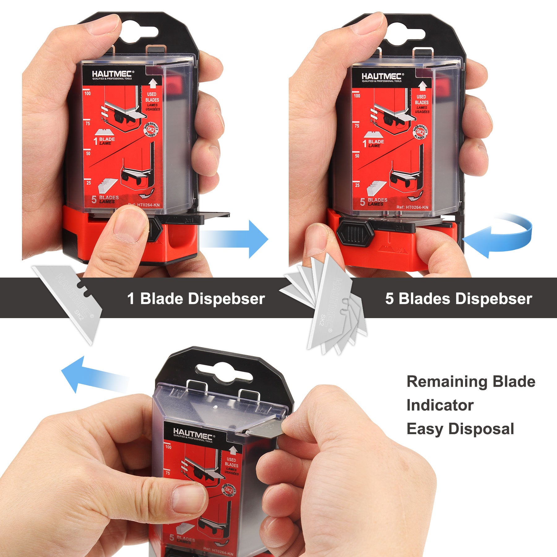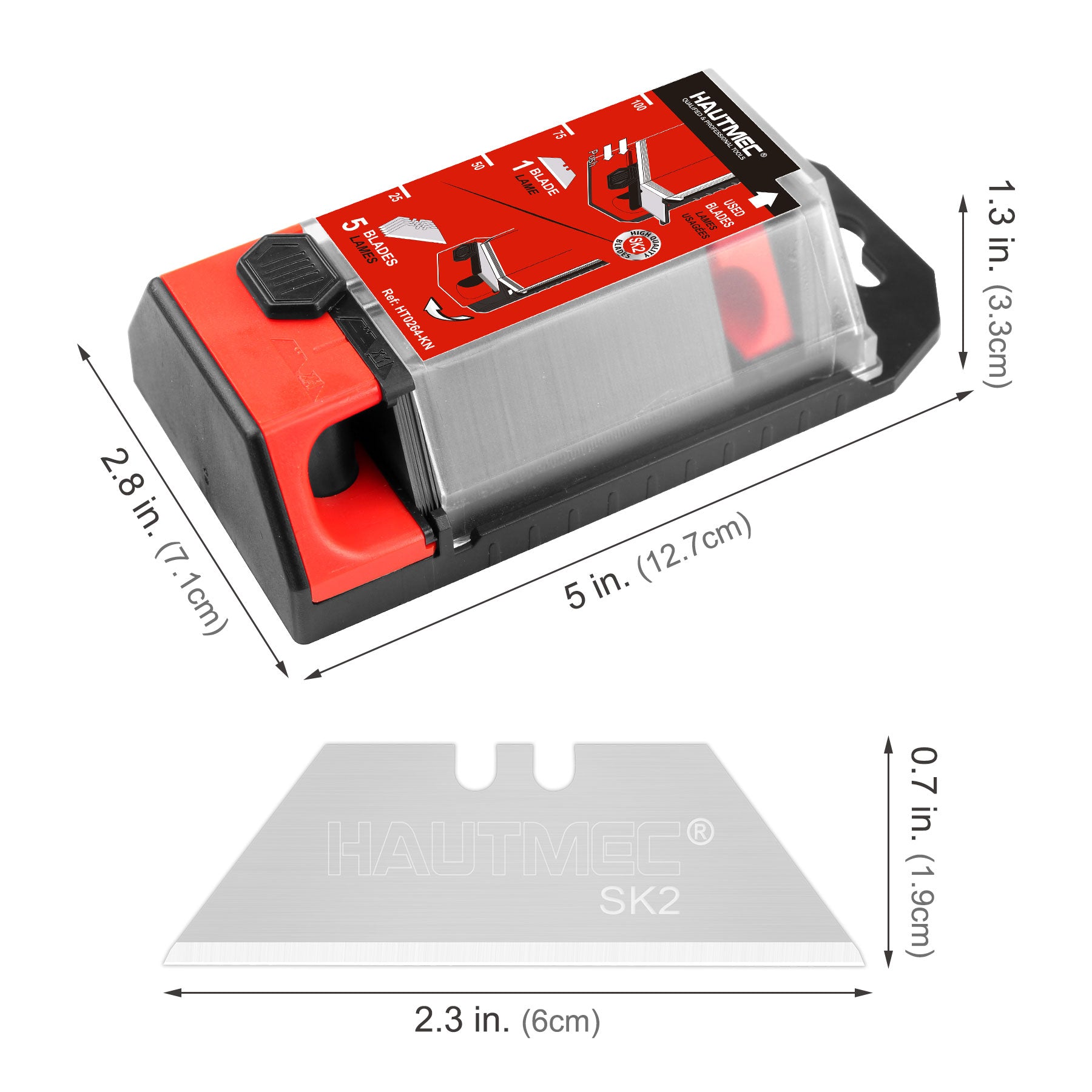 HAUTMEC 100 Pack Utility Knife Blades with Innovative Dispenser, SK2 Heavy Duty All-Purpose Blade Replacement, for Box, Carpet, Rope HT0264-KN