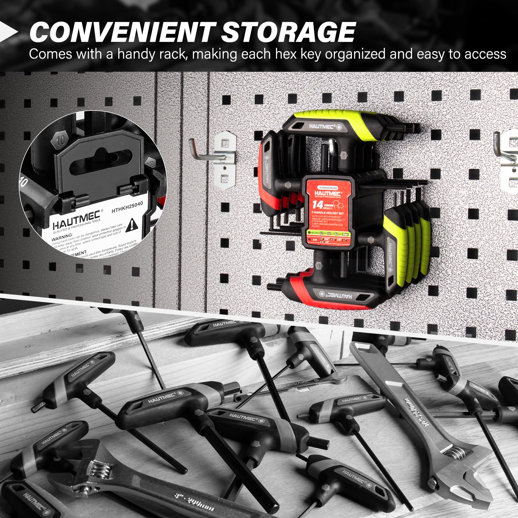 HAUTMEC 14-Piece T-Handle Allen Wrench Set, SAE & Metric T-Handle Hex Key Set, High Torque CR-V Steel Allen Key Set with Storage Rack, for Bike, Motorcycle, Furniture & Auto Repair, HTHKH25040