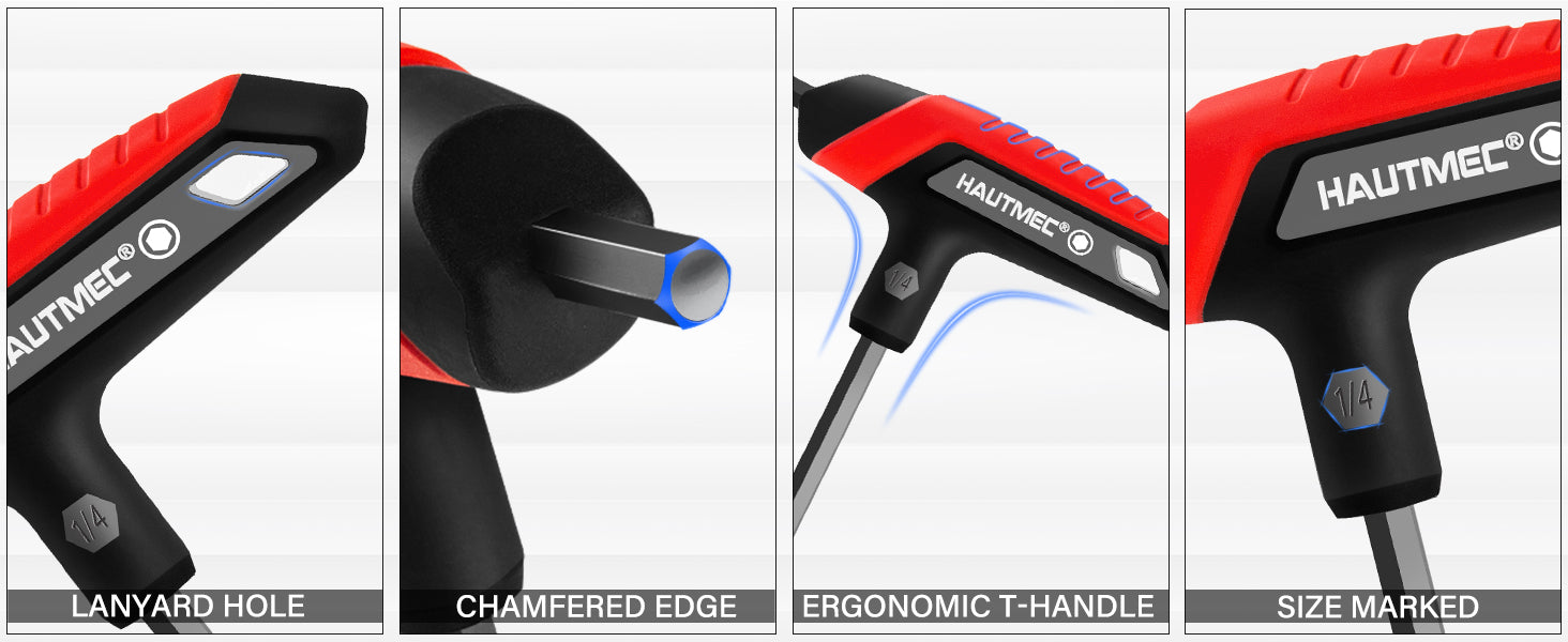 - [Superior Leverage & Control for Tough Jobs]:The Allen key set t-handle is engineered for maximum performance. The long arm delivers exceptional torque to break loose stubborn, rusted fasteners efficiently, while the short end enables precise two-handed control in confined areas. Chamfered edges guide the tool smoothly into fasteners, eliminating slippage and providing secure engagement.