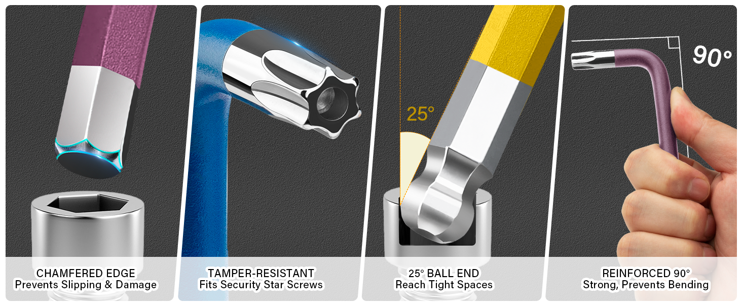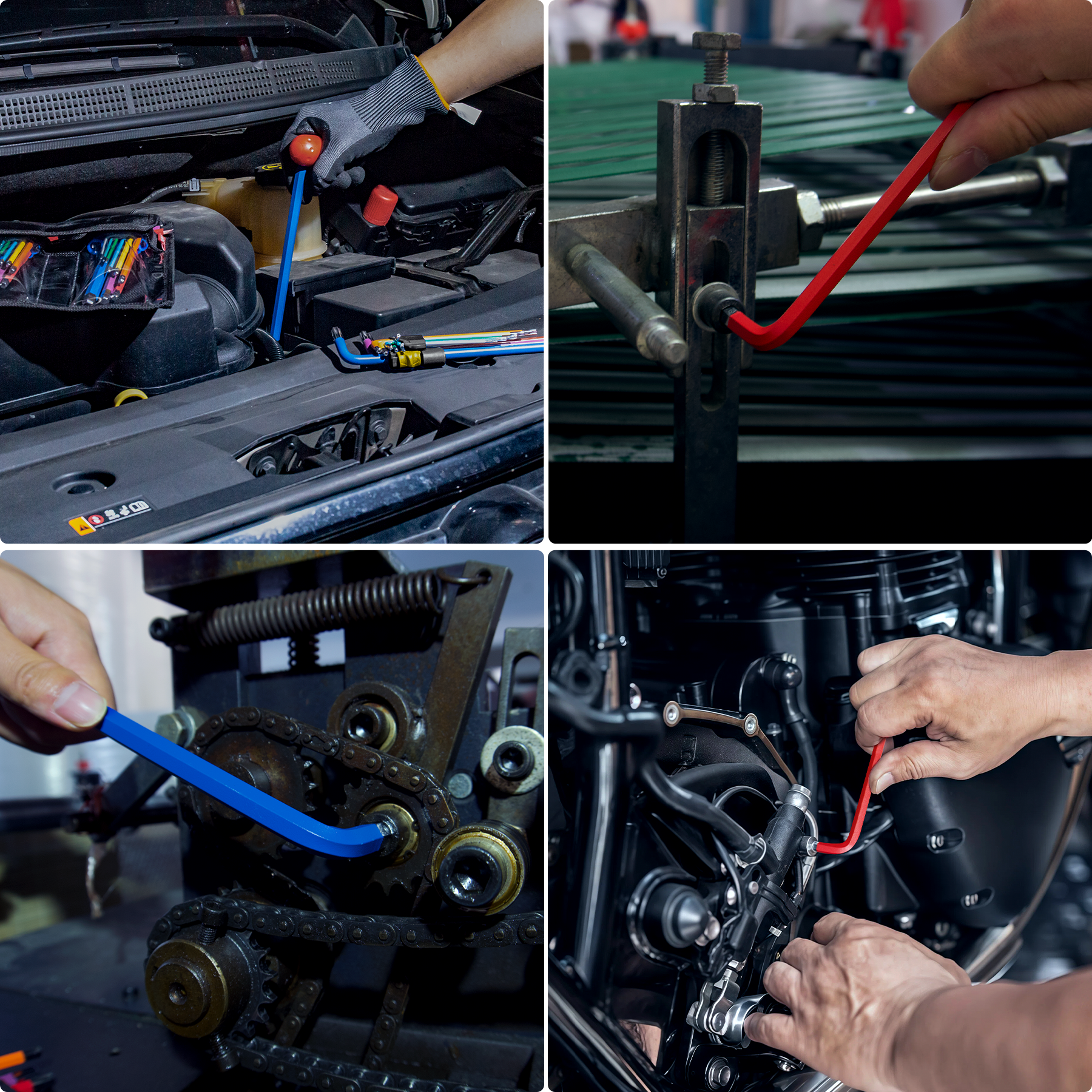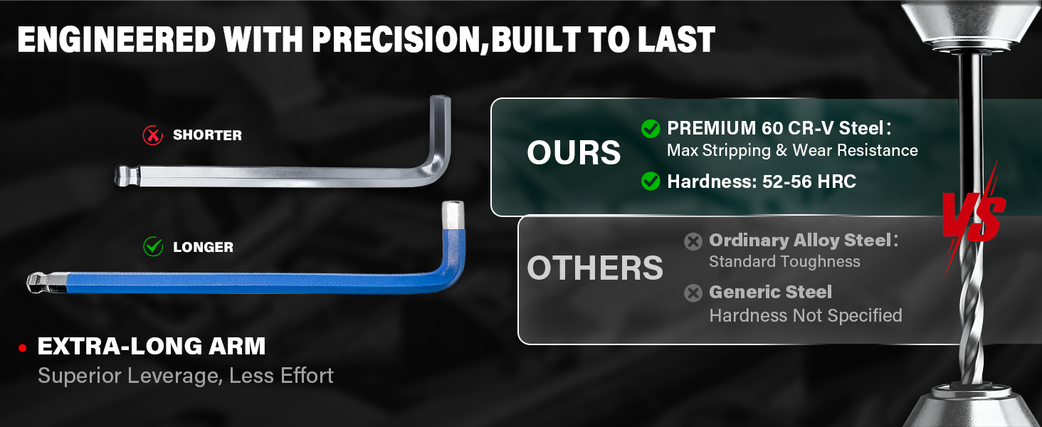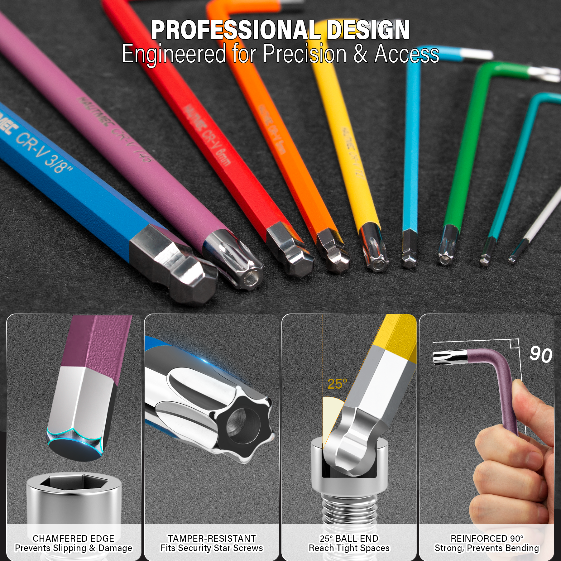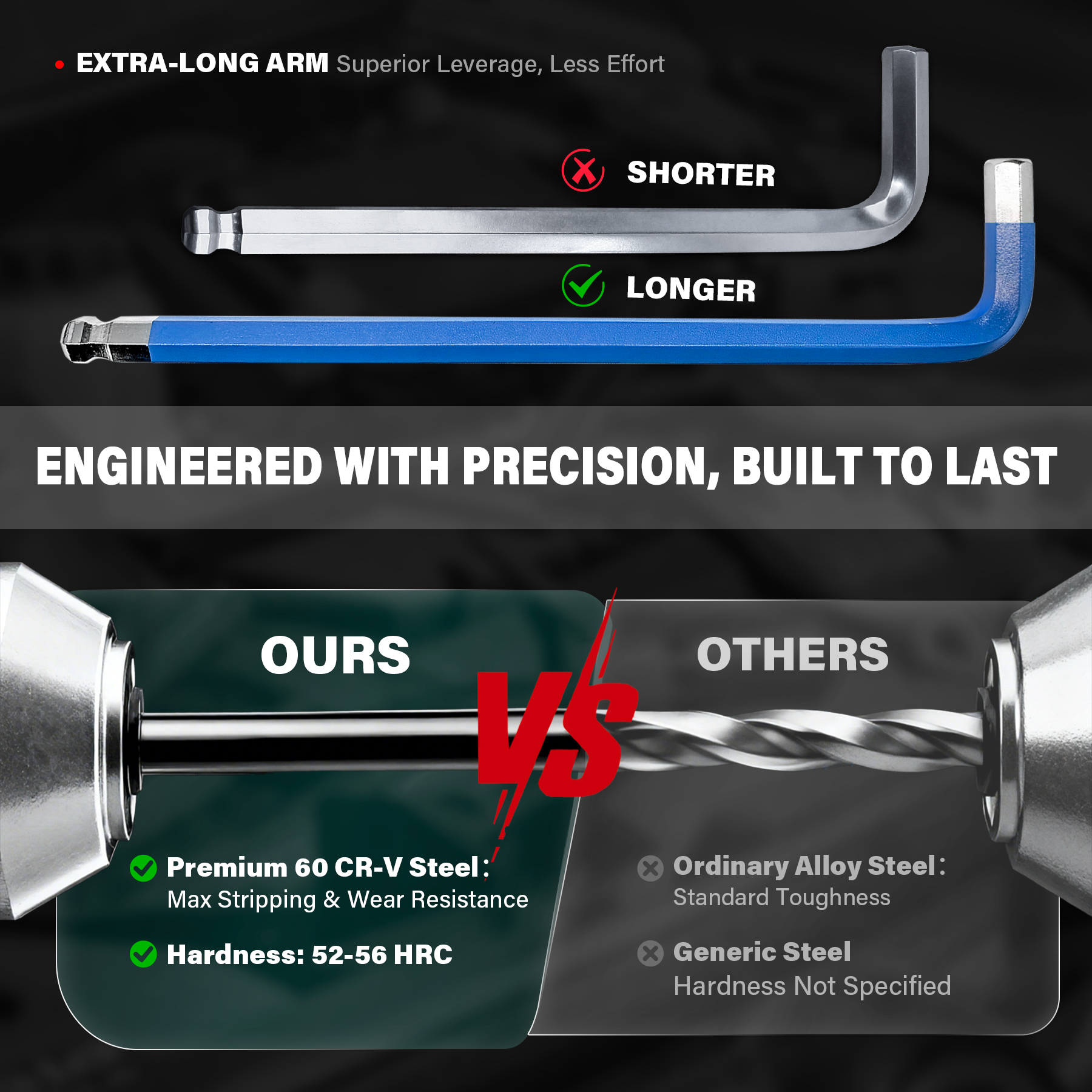 ● [Professional Grade, Built to Last]: Hex wrench set forged from premium 60CR-V Chrome Vanadium Steel, heat-treated, and electroplated to a robust 52-56HRC hardness. These allan wrench sets are rust-resistant, wear-resistant, and meet strict ANSI torque standards, ensuring exceptional strength, durability, and resistance to stripping or rounding for long-lasting professional use.