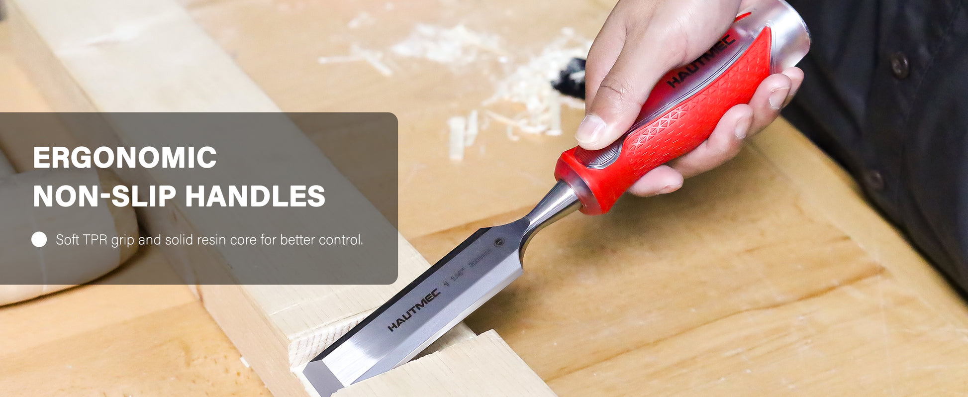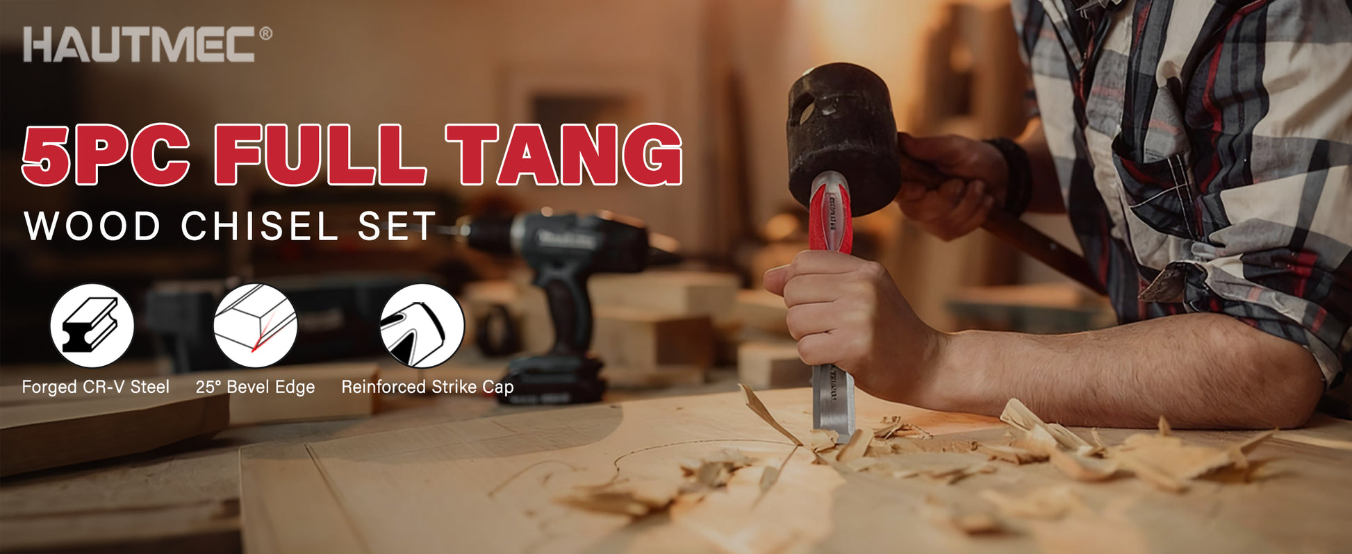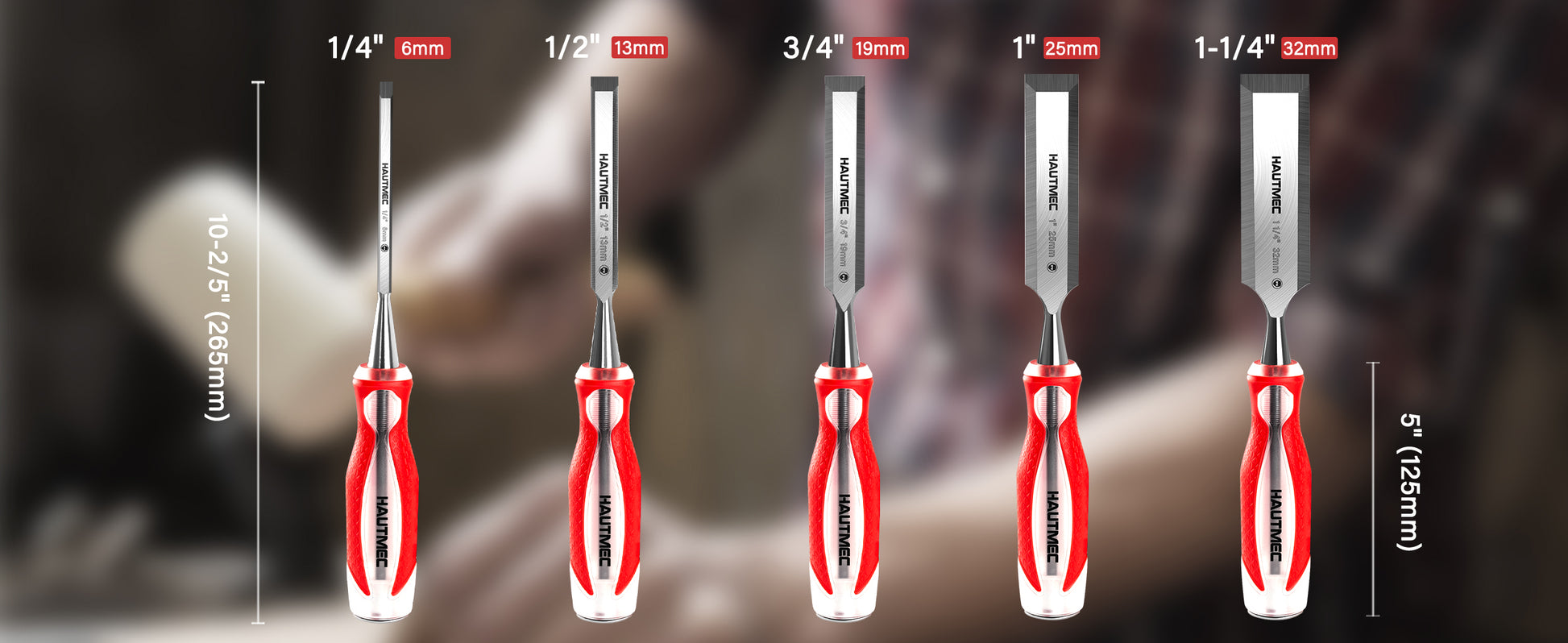 HAUTMEC 5 Piece Wood Chisel Set for Woodworking & Carving. Drop-Forged CR-V Steel Beveled Edge Blades with Ergonomic Non-Slip Handles and Heavy-Duty Strike Caps– HT0365